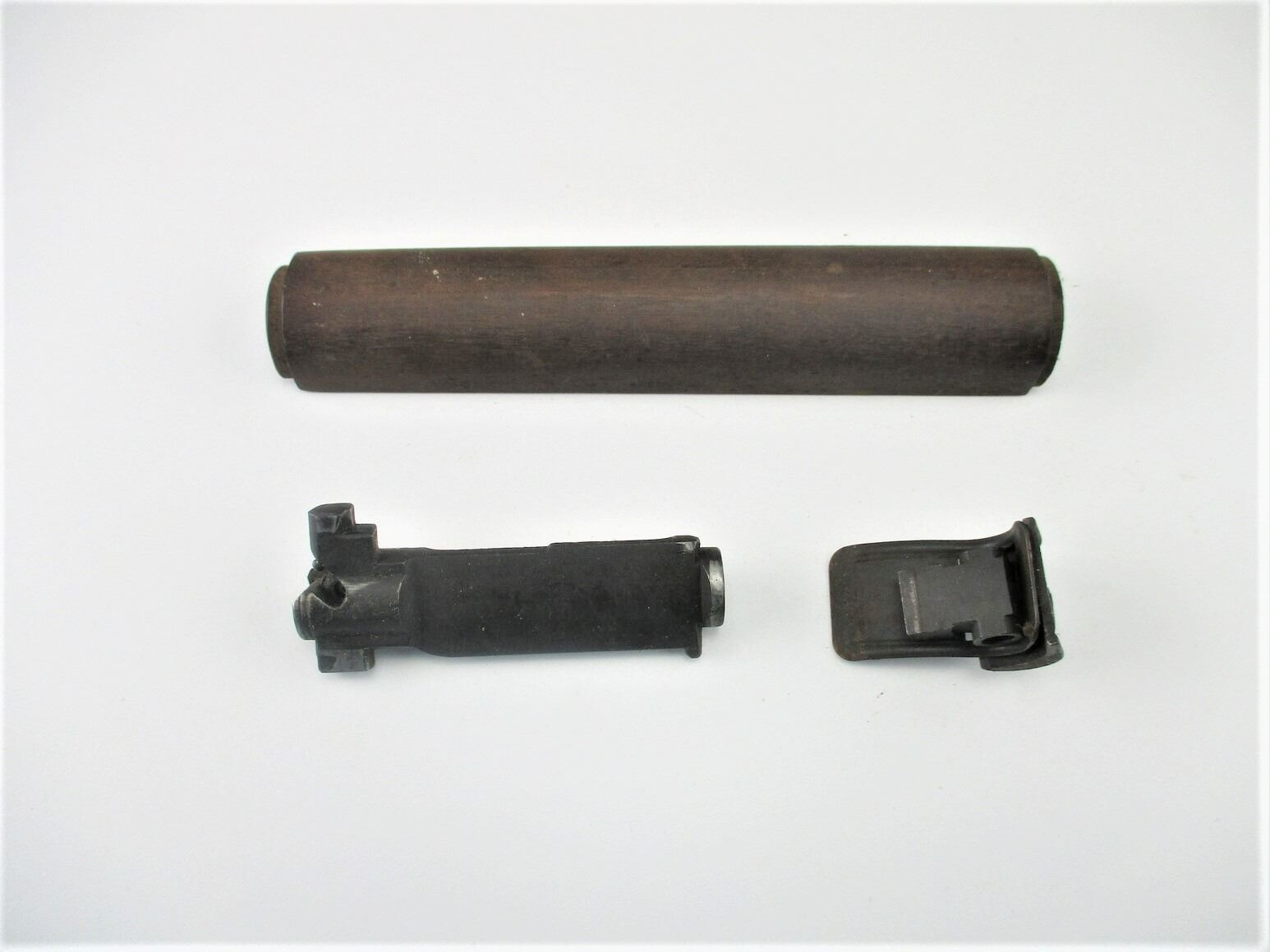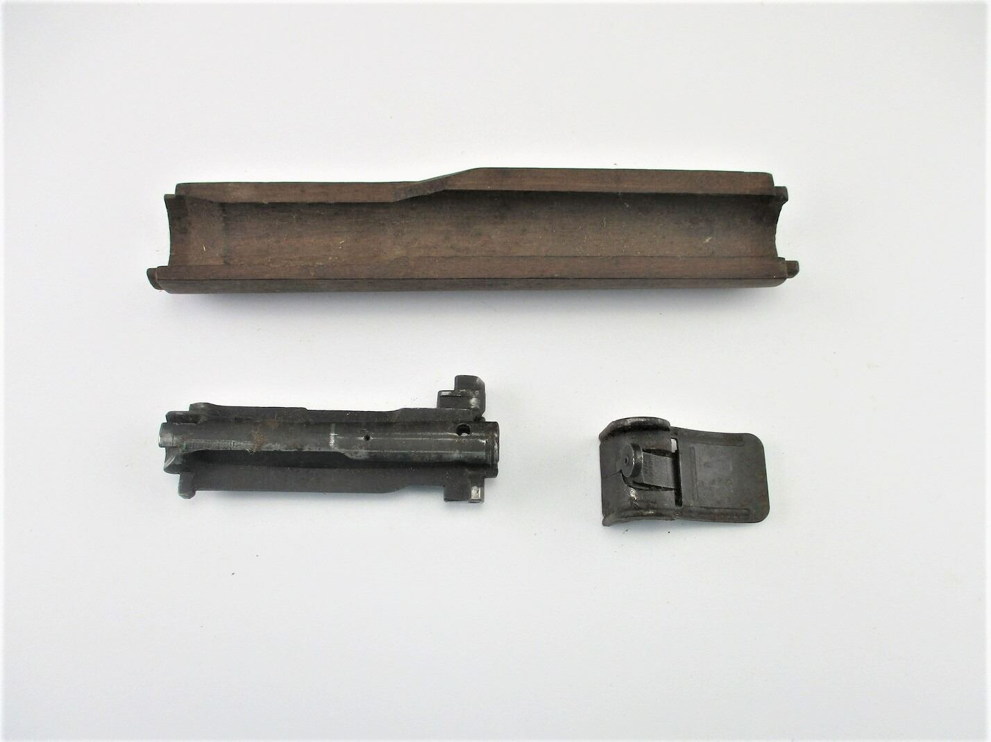 M-1 GARAND RIFLE PARTS , INCLUDES STRIPPED BOLT, # D28287-1 W R.A, ON BOLT, MFG'D WINCHESTER. INCOMPLETE REAR SIGHT, MISSING ADJUSTMENT DIALS, MARKED "NM 595", (1) TOP HAND GUARD,