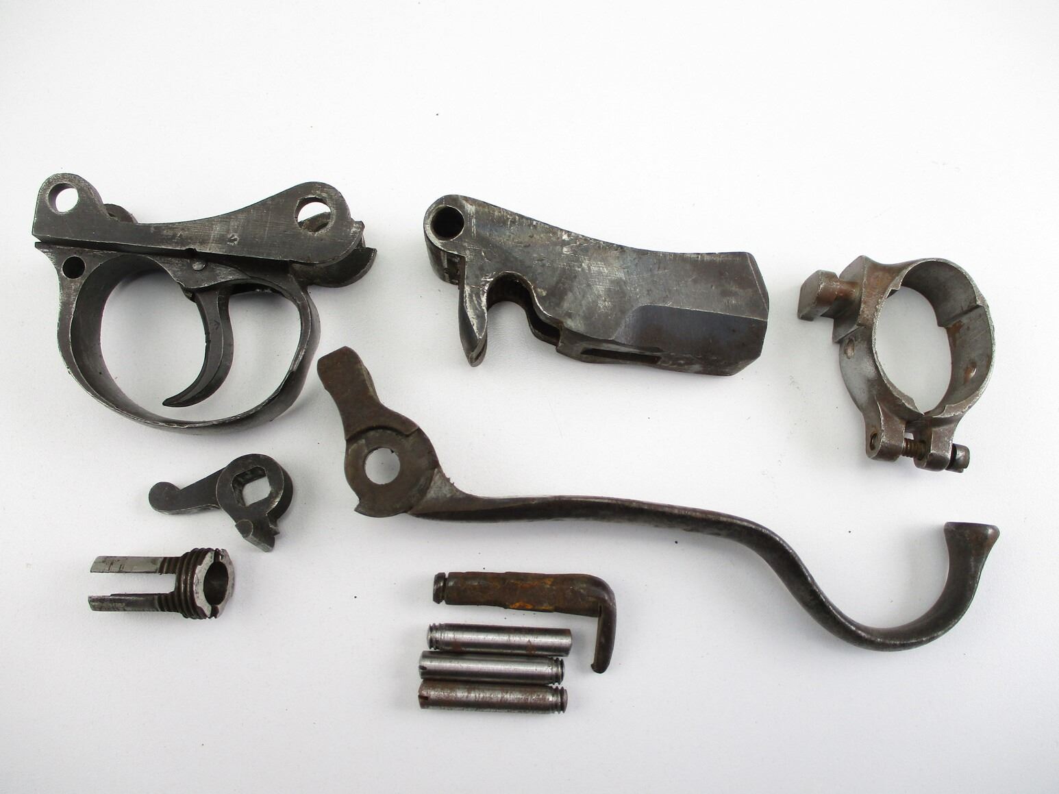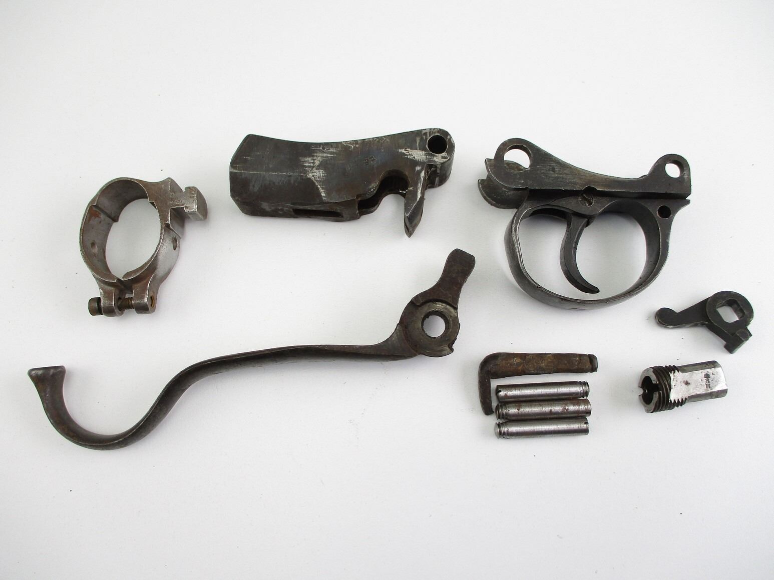 ASSORTED MARTINI HENNERY RIFLE PARTS , INCLUDES: TRIGGER GUARD & TRIGGER, STRIPPED BREECH BLOCK, SHORT LEVER, BARREL BAND WITH BAYONET LUG, VARIOUS PINS, ETC LOT MY CONTAIN DIFFERENT MODELS, & MAY REQUIRE FITTING.