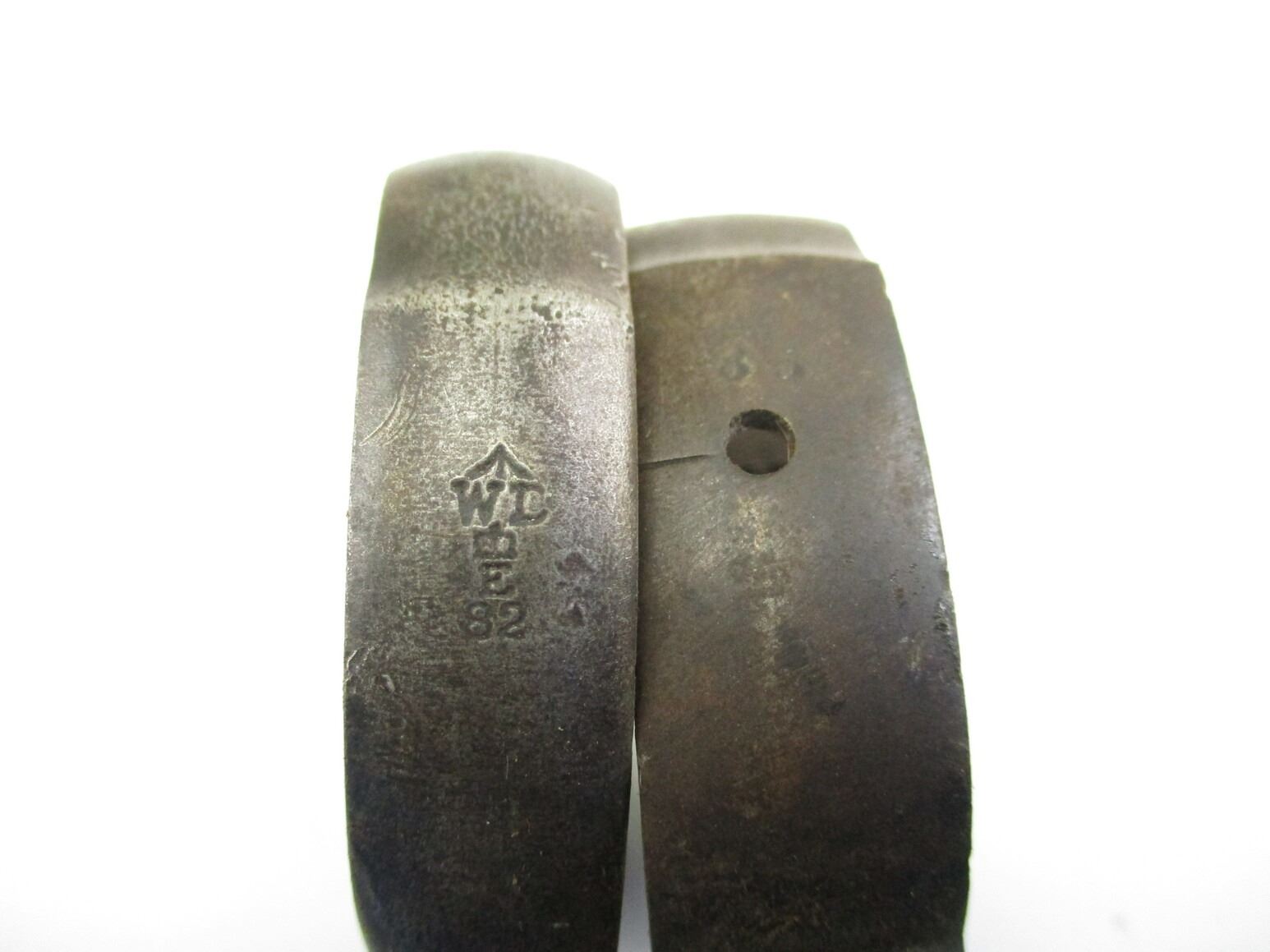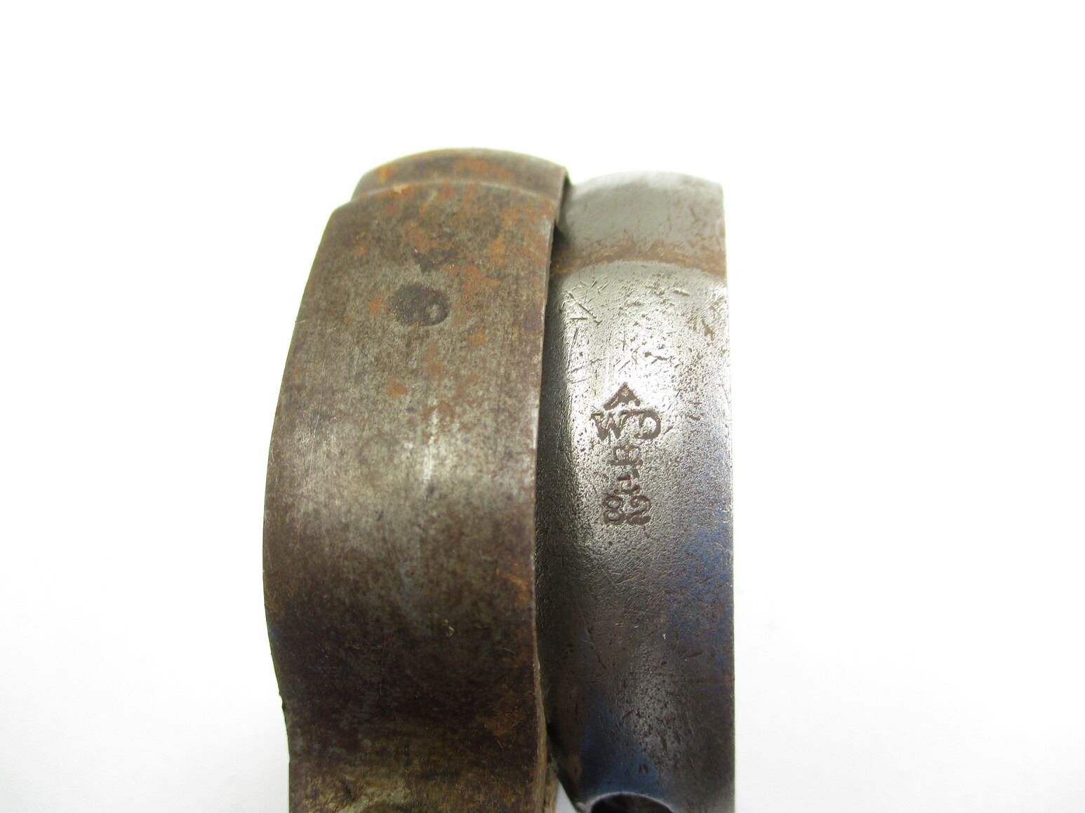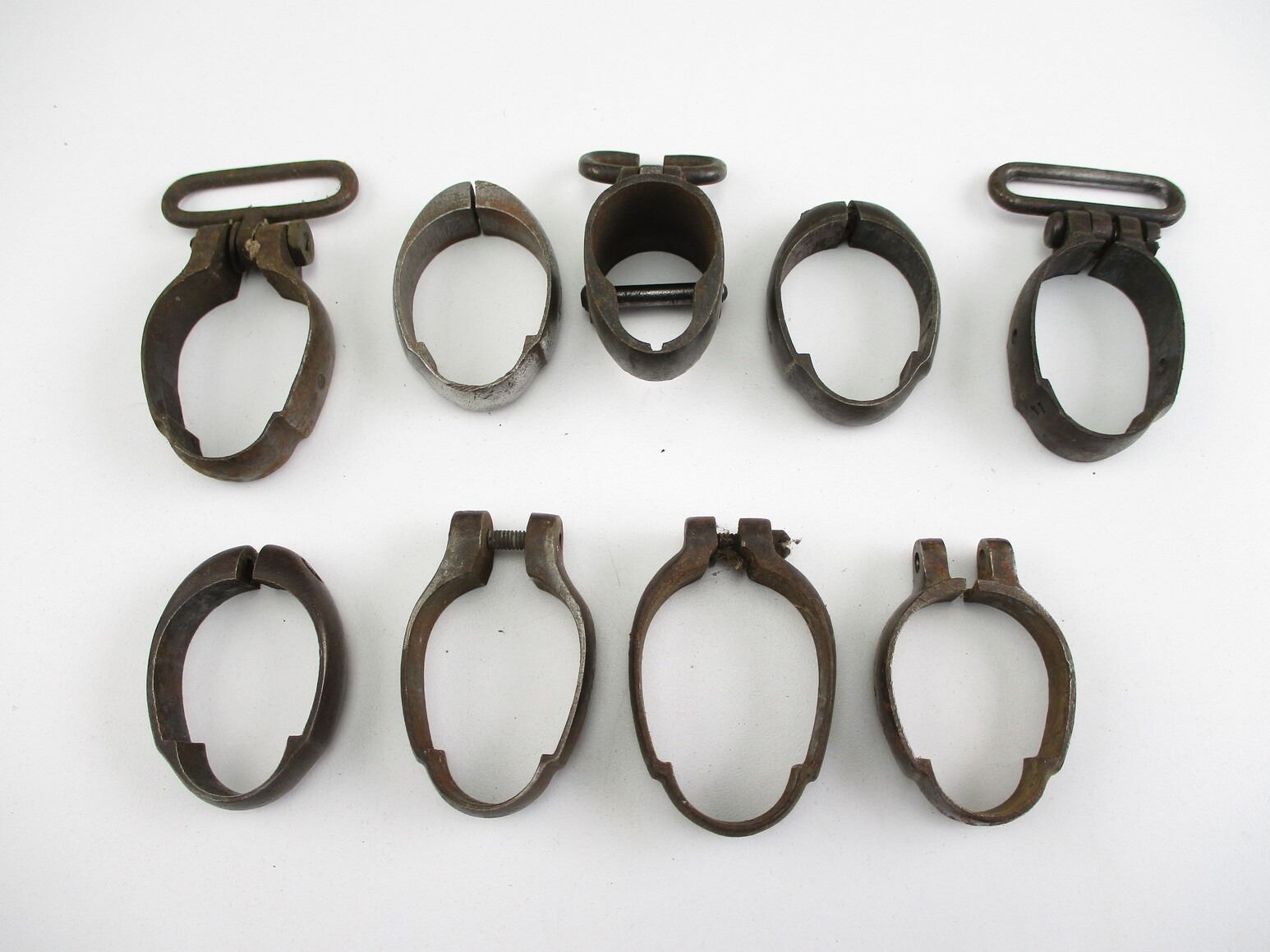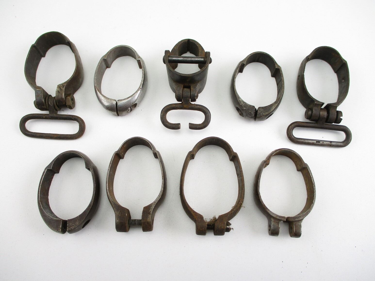 ASSORTED MILITARY BARREL BANDS, LOT OF 9, INCLUDES BRITISH, SOME MARKED WITH WD & BROAD ARROW, IN VARIOUS SHAPES & SIZES. SEE PHOTO.