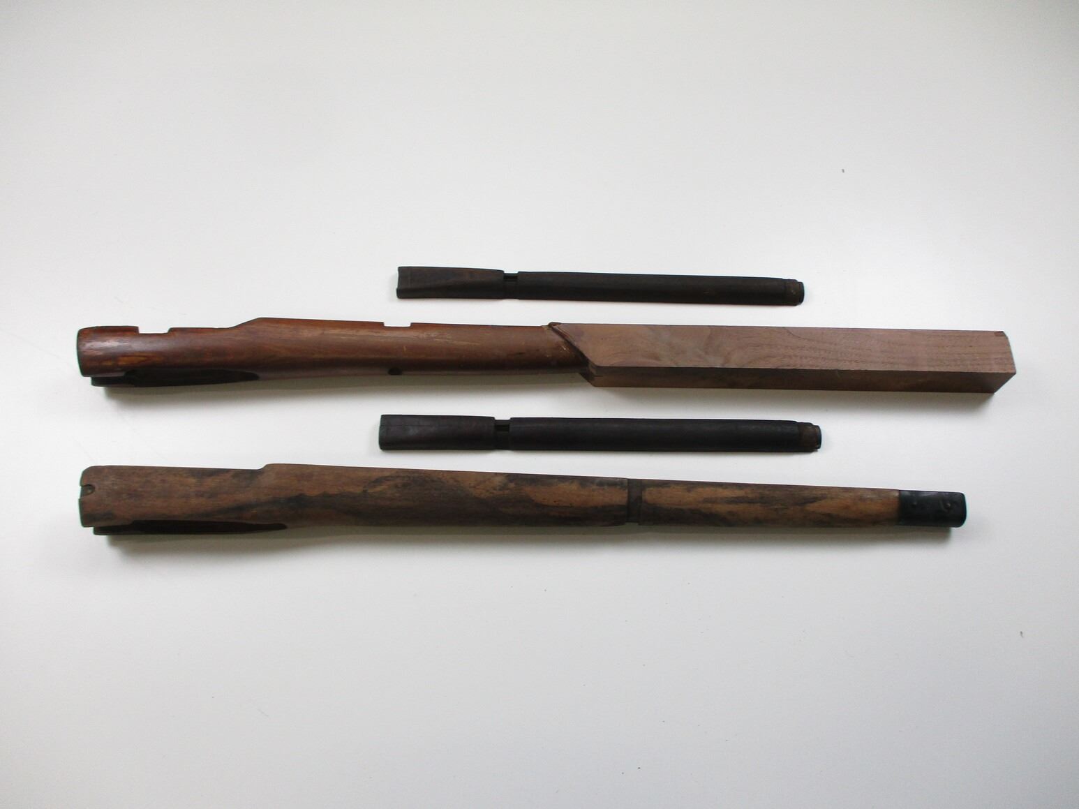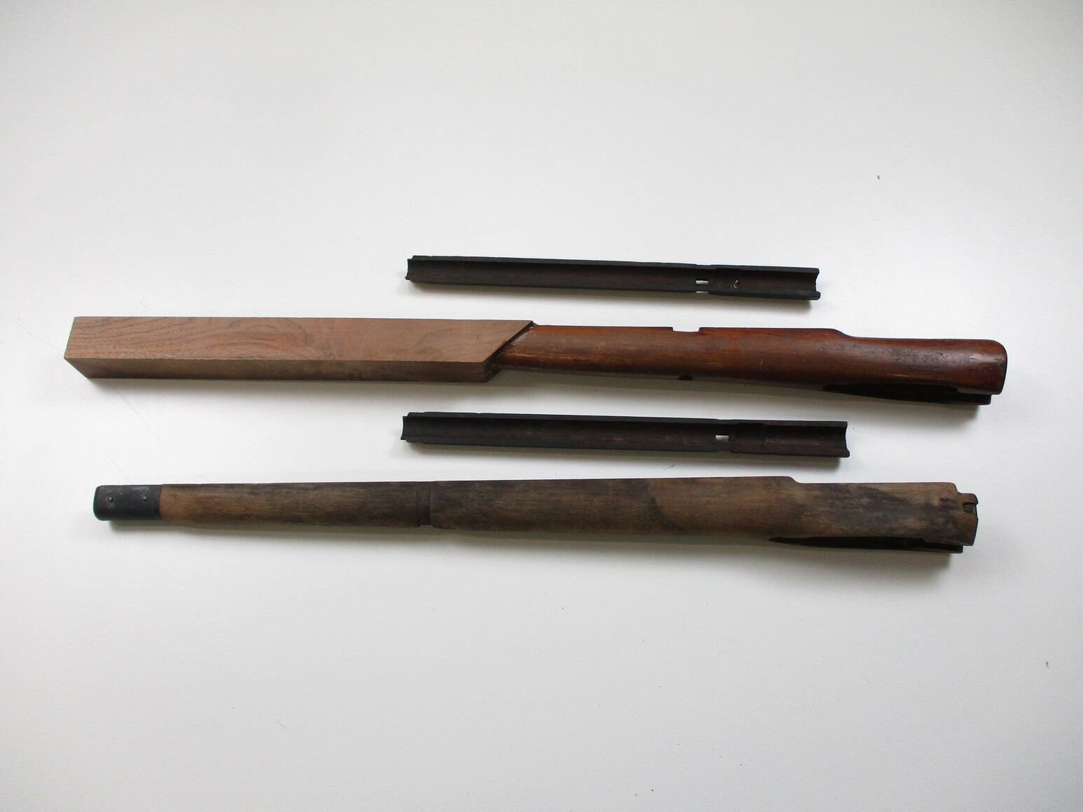 LEE ENFIELD FORENDS & HAND GUARDS , (1)NO.4 MK.1 MILITARY LENGTH FOREND, APPROX. 28.25" OAL, WITH METAL FRONT CAP, WITH MARKINGS ON CAP & FRONT PART OF FOREND, (1) NO.1 MK.3 SPORTER STYLE FOREND WITH UNFINISHED WOODEN EXTENSION, APPROX. 32" OAL, FOREND REQUIRES FINISHING, (2) MILITARY STYLE HANDGUARDS, WITH SCUFFS, GROOVES, & OR CRACKS, NO VISIBLE MARKINGS. MAY REQUIRE REPAIR & FITTING.