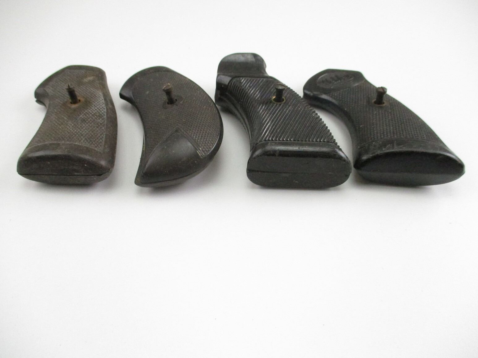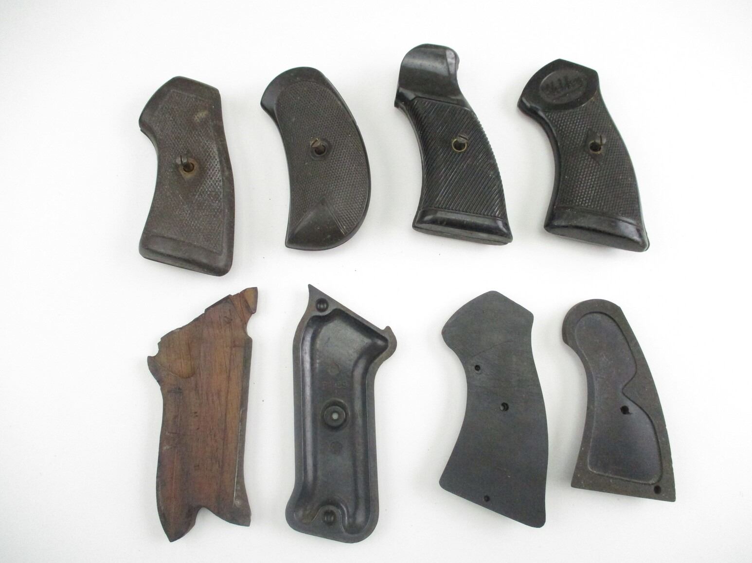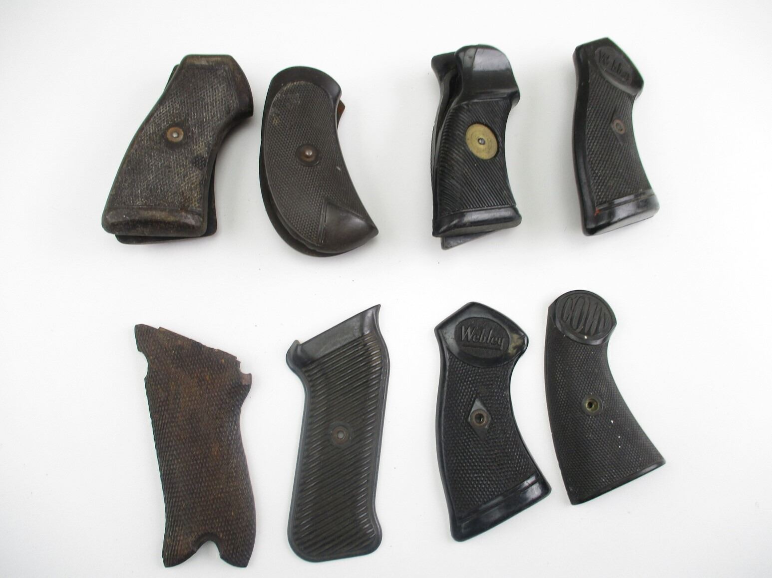 ASSORTED MILITARY REVOLVER GRIPS , INCLUDES WEBLEY, LUGER, ENFIELD REVOLVER, MP 40, ETC.