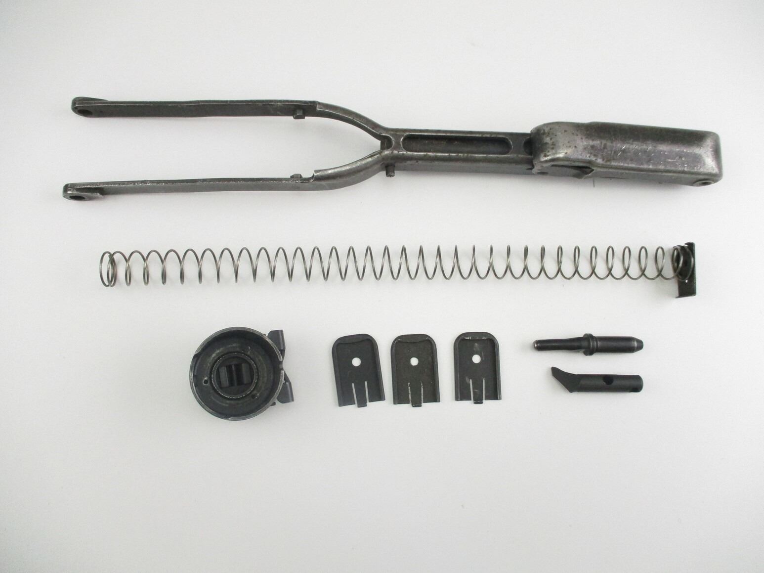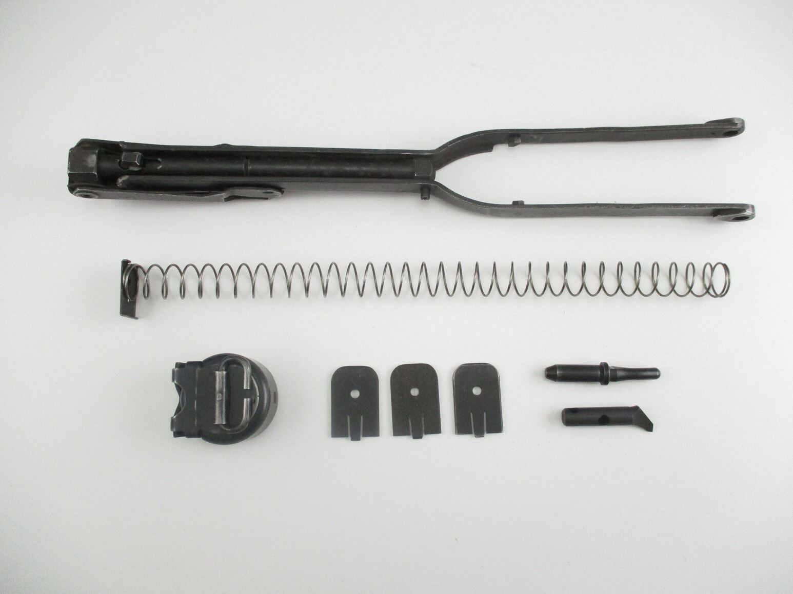 ASSORTED STERLING SMG PARTS , INCLUDES: FOLDING BUTT STOCK, COCKING LEVER, RECEIVER CAP, WITH SWIVEL, EJECTOR, 20 ROUND MAG SPRING WITH MAG FLOOR PLATES .
