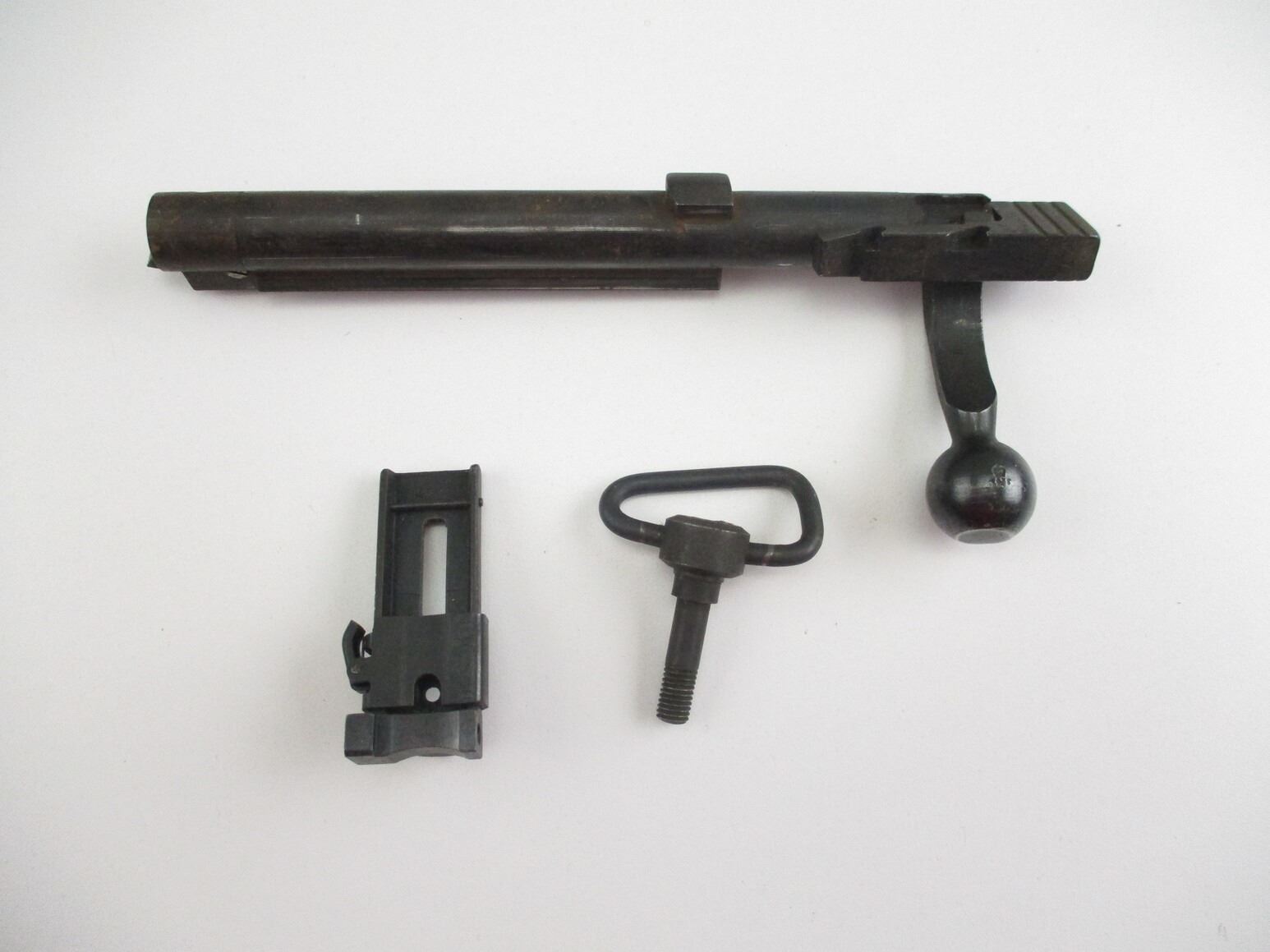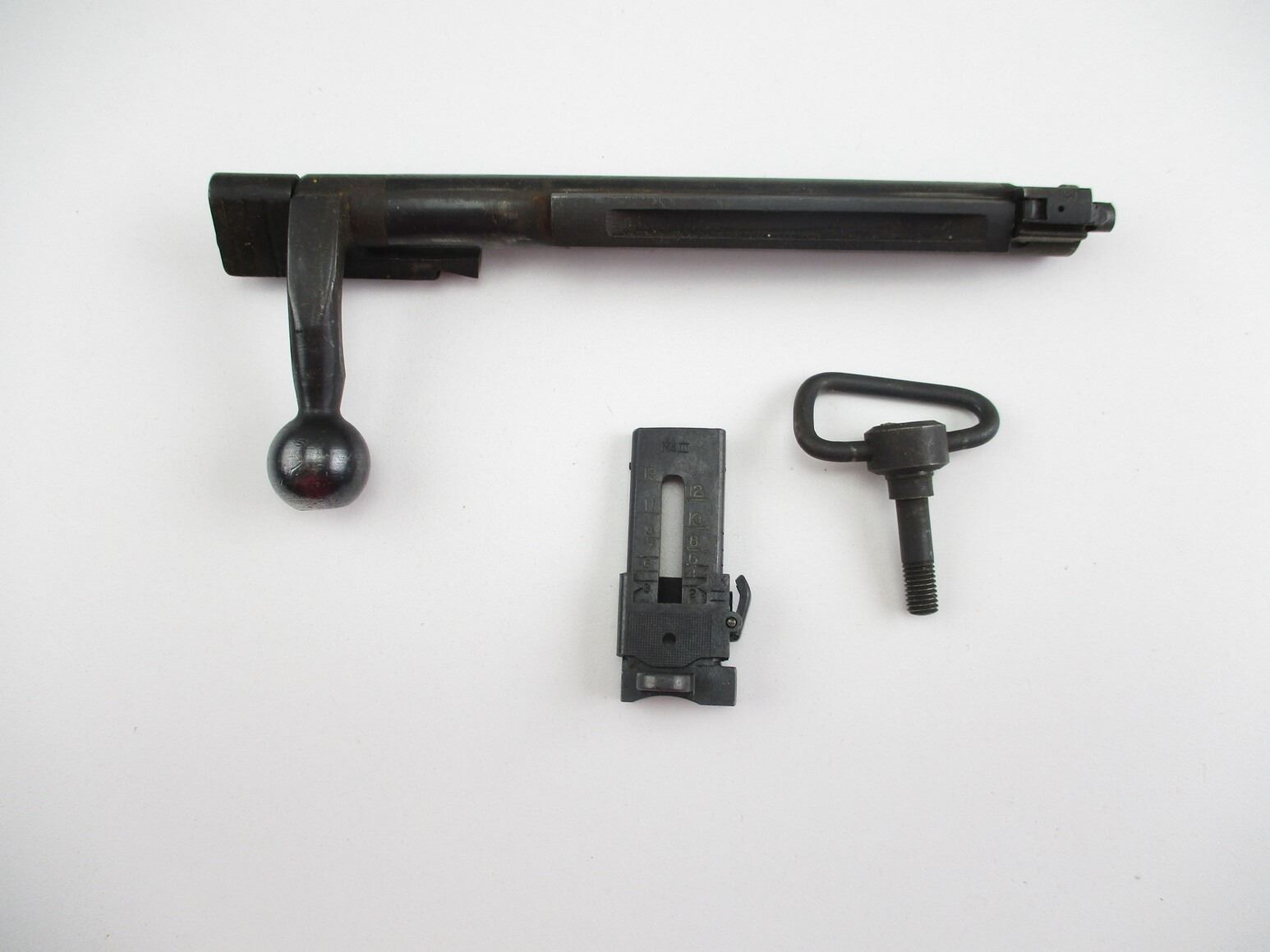 LEE ENFIELD NO.4 MK.1 PARTS , INCLUDES: COMPLETE BOLT, # 8714, ON HANDLE, WITH #3 BOLT HEAD, (1) REAR MK.III SIGHT, (1) SCREW IN SWIVEL. MAY REQUIRE FITTING.