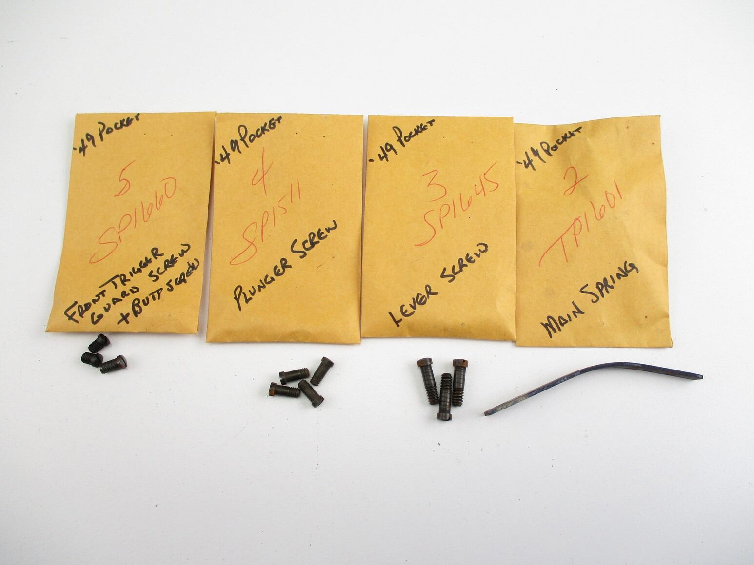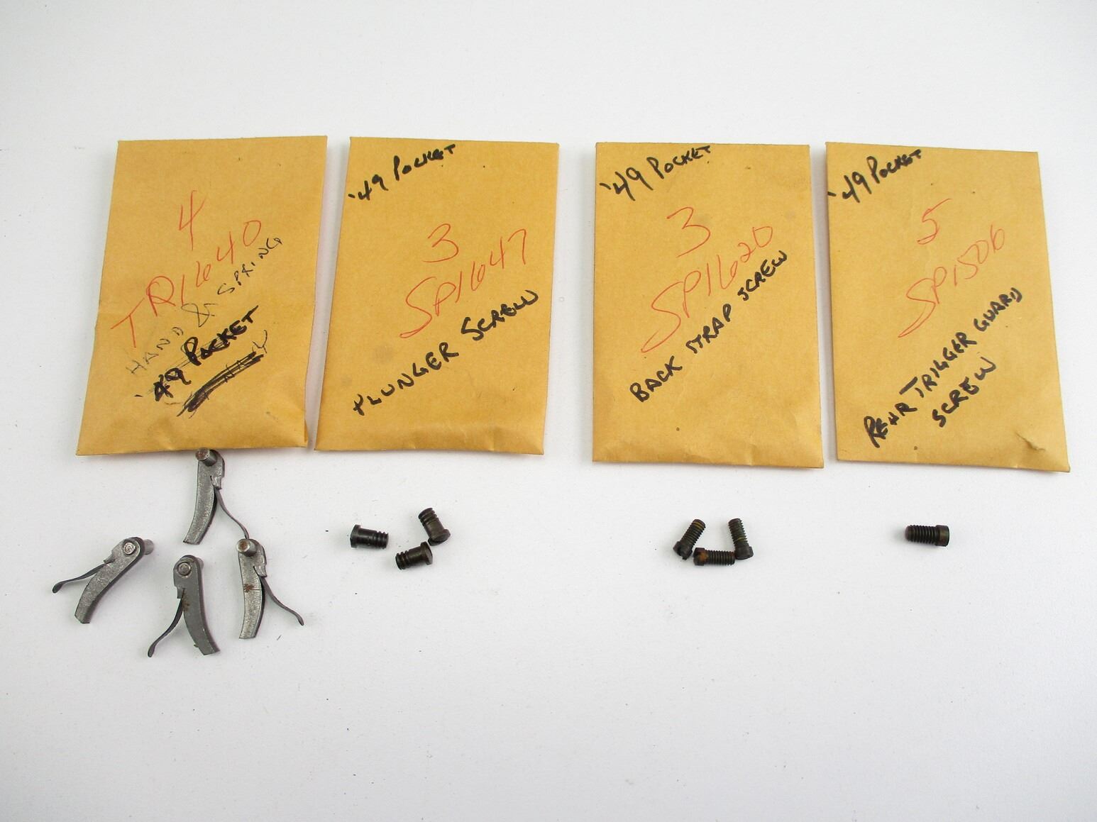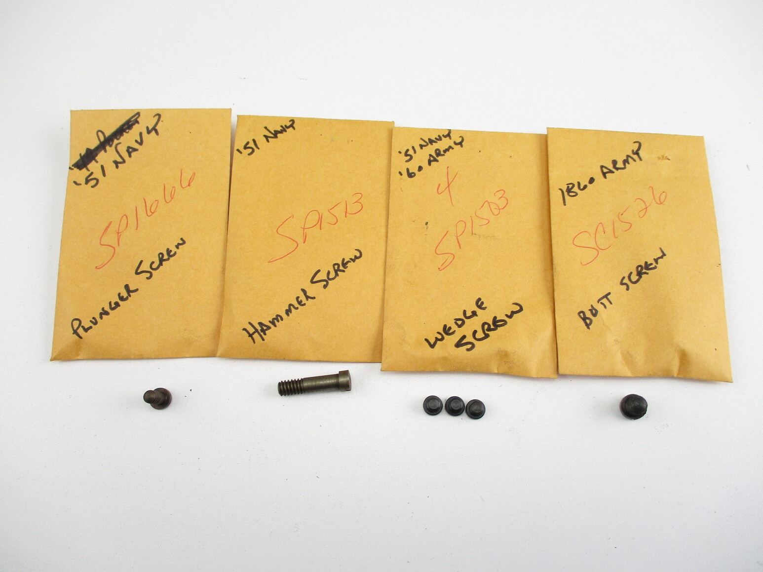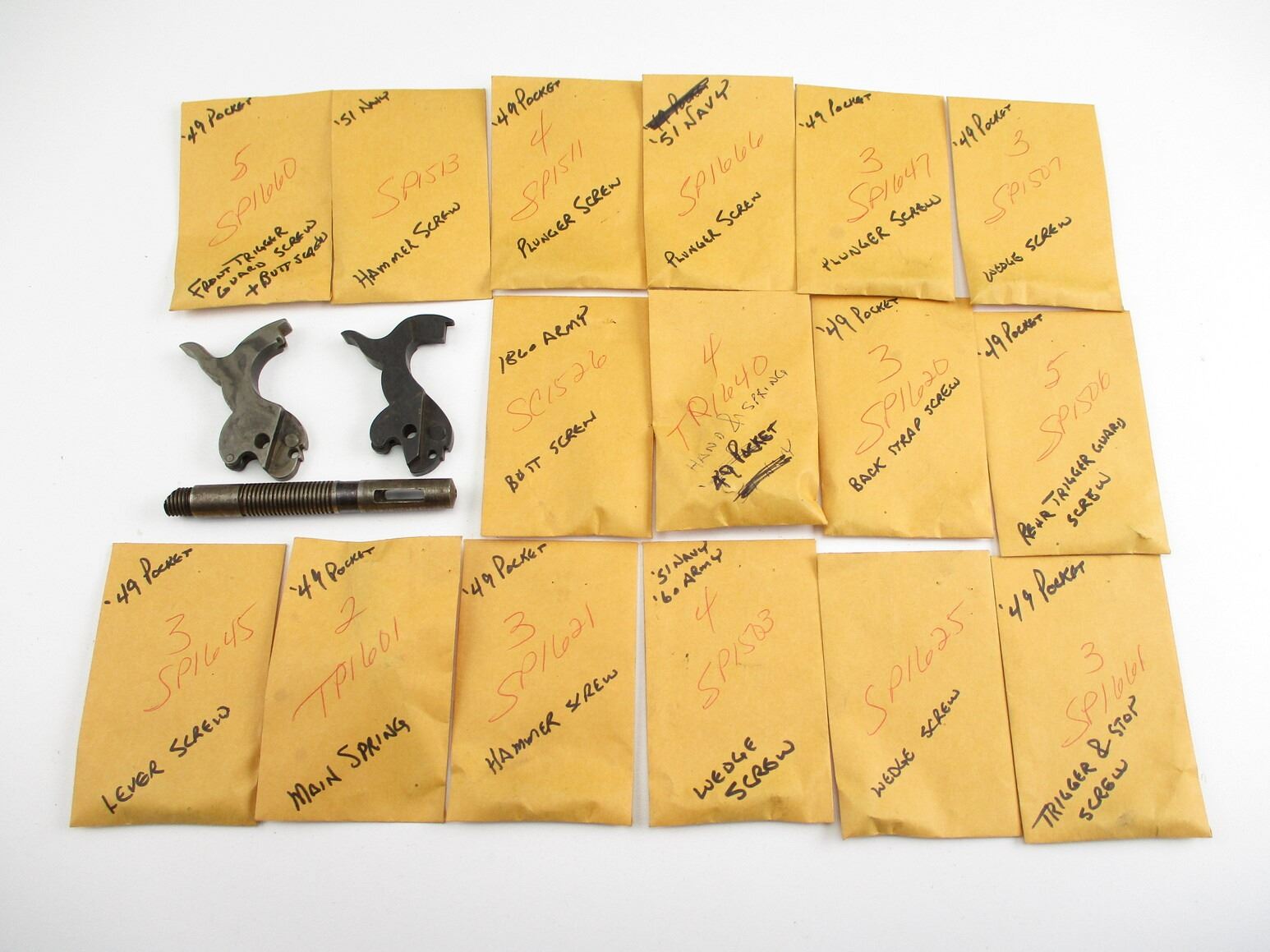 COLT PERCUSSION REVOLVER PARTS , MODERN MFG, SOME MARKED 1894 POCKET, 1860 ARMY, 1851 NAVY, INCLUDES SCREWS, HANDS, MAIN SPRING, ETC, (2) HAMMERS, 1 UNKNOWN, 1 REMINGTON ARMY, MAY CONTAIN OTHER MARKS.