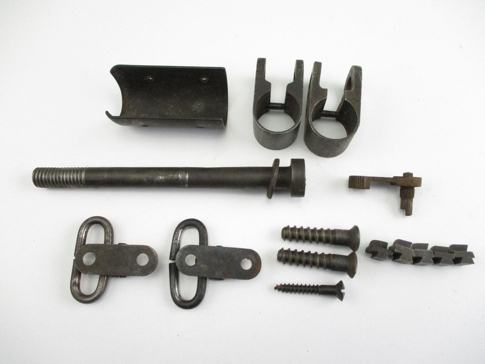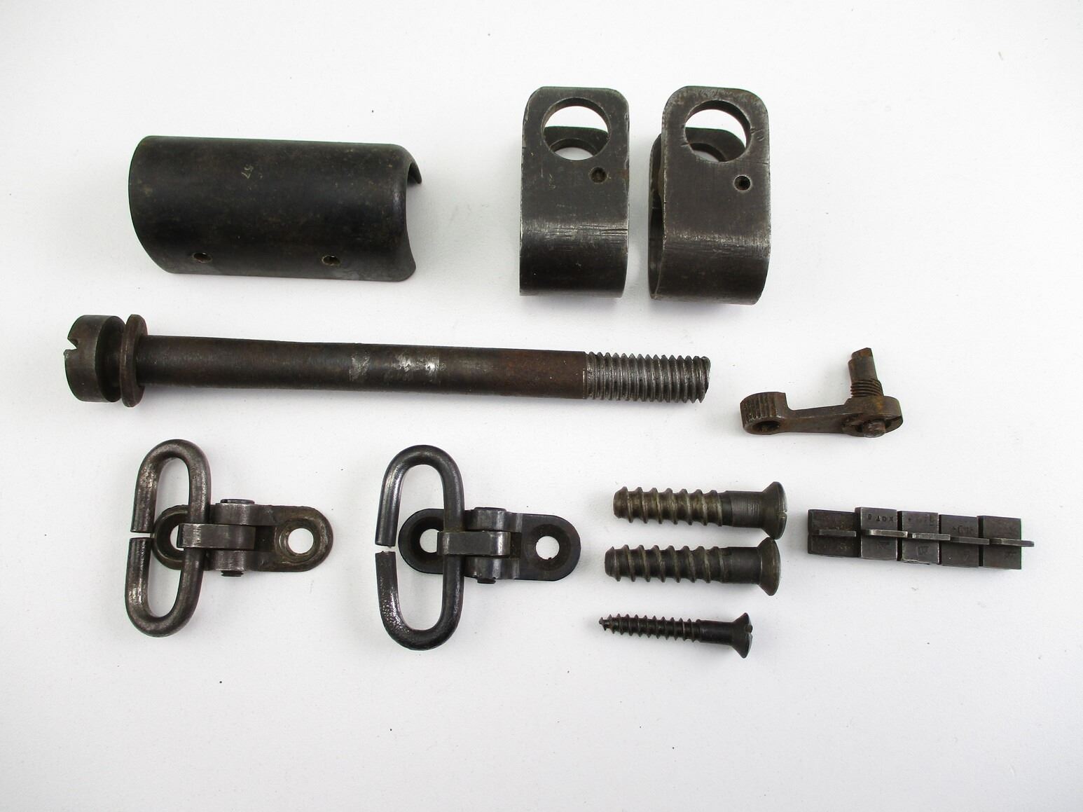 LEE ENFIELD NO.4 MK.1 RIFLE PARTS , INCLUDES: (2) FRONT SIGHT GUARDS WITH SCREWS, (5) FRONT SIGHTS, (2) BUTT SWIVELS, SAFETY LEVER, SCREWS, ETC.