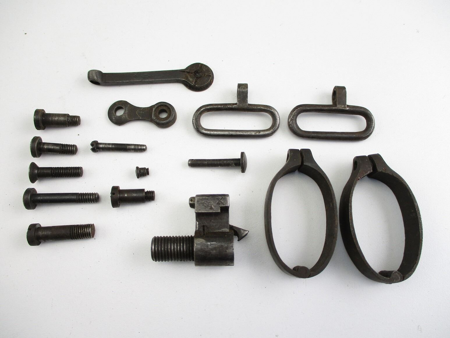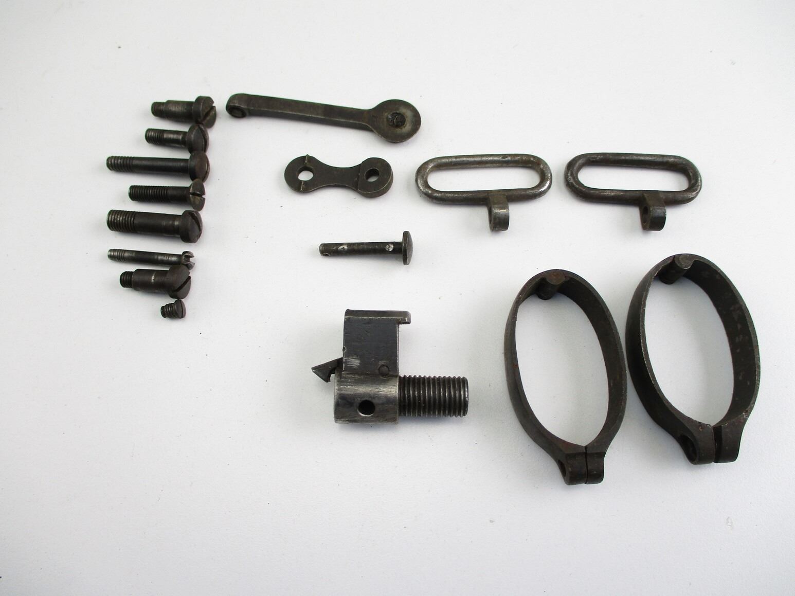 LEE ENFIELD NO.1 MK.3 RIFLE PARTS, INCLUDES: BOLT HEAD WITH EXTRACTOR, (2) SWIVELS, (2) MIDDLE BARREL BANDS, SAFETY SPRING, VARIOUS SCREWS, REAR VOLLEY SIGHT, ETC.