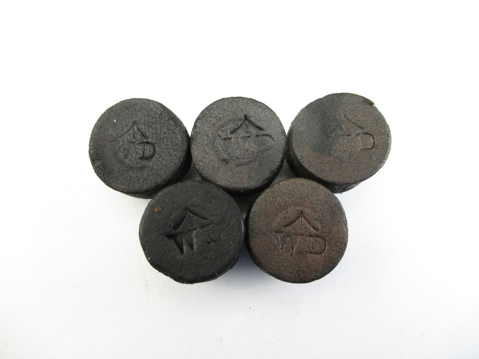 SNIDER ENFIELD NIPPLE PROTECTORS, LOT OF 5. BLACK LEATHER, WITH BROAD ARROW QD MARK, APPEARS UNUSED.