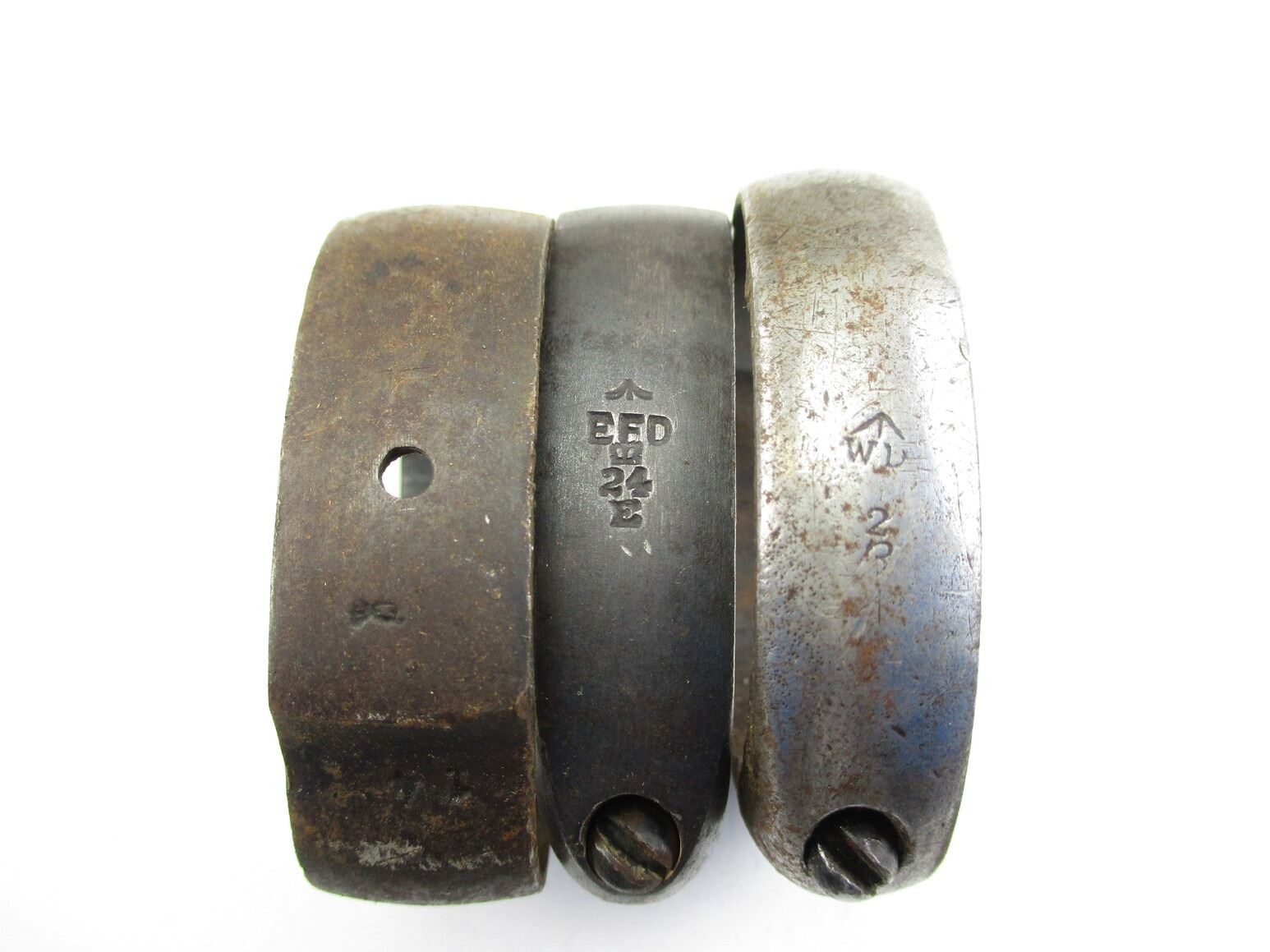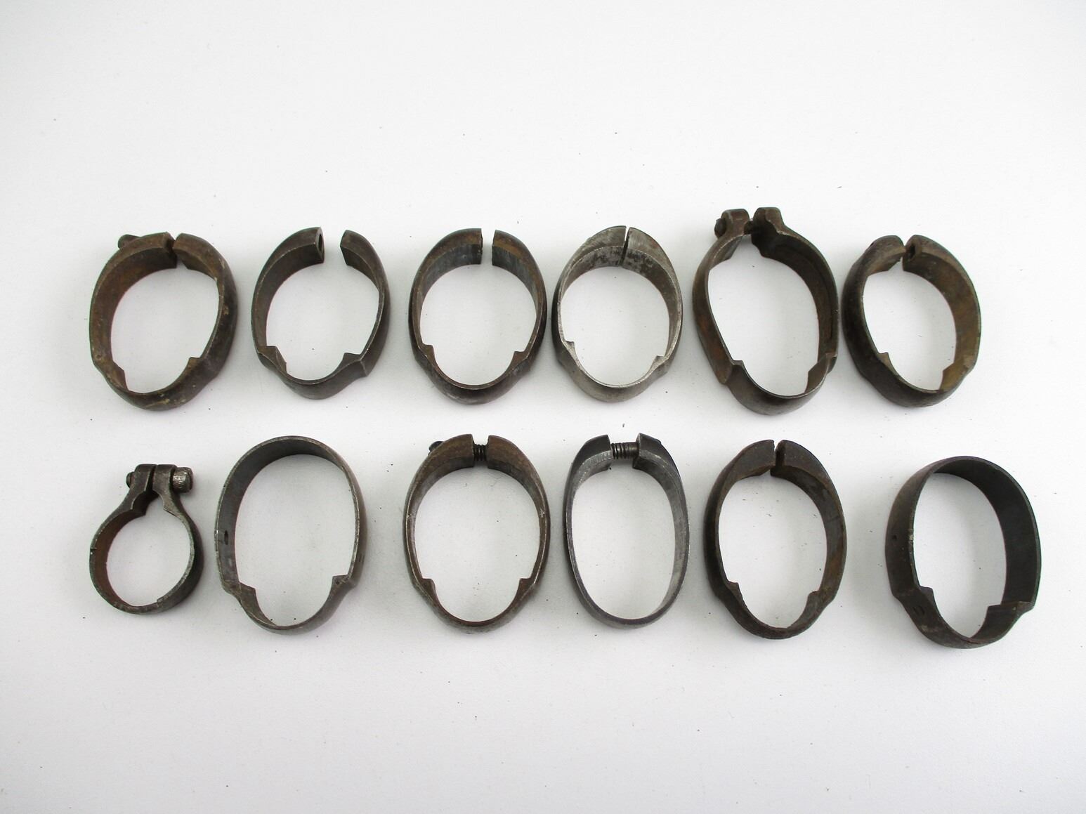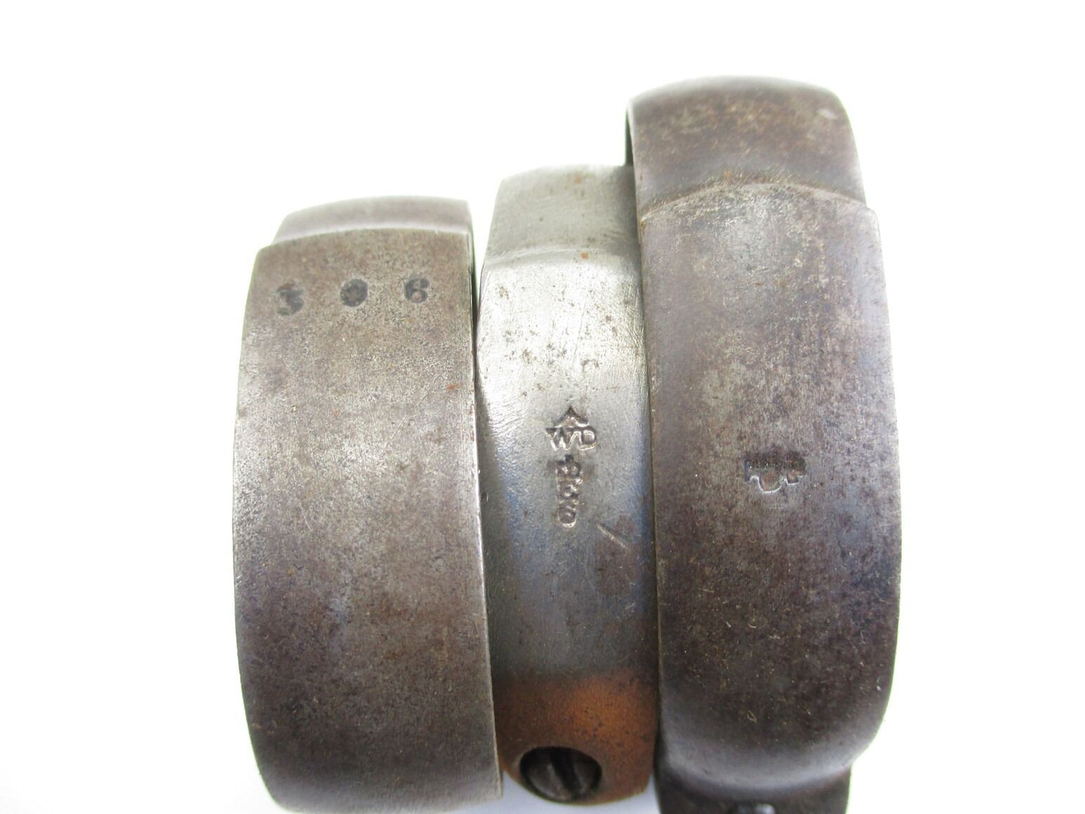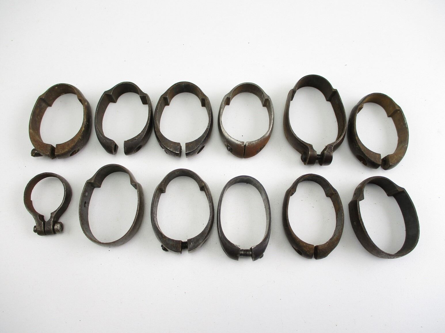 ASSORTED MILITARY BARREL BANDS, LOT OF 12, INCLUDES BRITISH, MARKED WITH WD & ARROW, IN VARIOUS SIZES, MAY REQUIRE FITTING.