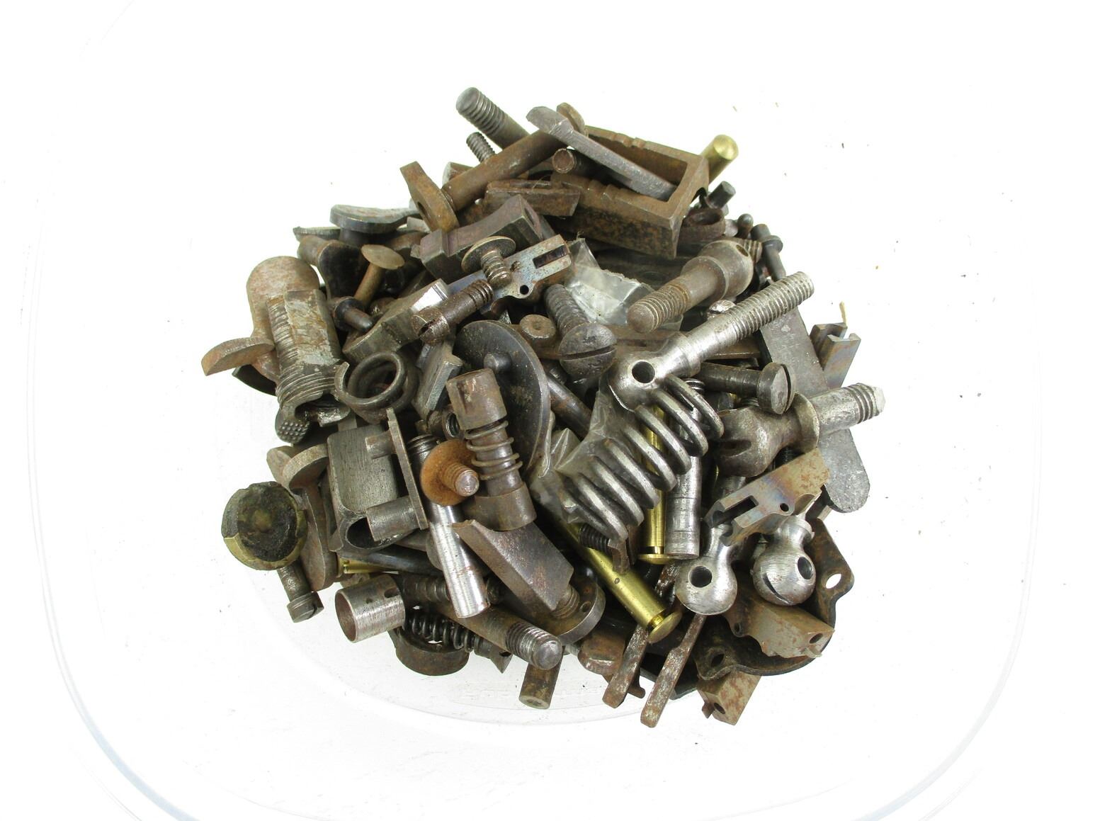 ASSORTED ANTIQUE RIFLE PARTS ETC, INCLUDES PINS, SCREWS, SWIVEL STUDS, ETC MAY CONTAIN MARTINI HENRY PARTS. SEE PHOTO.