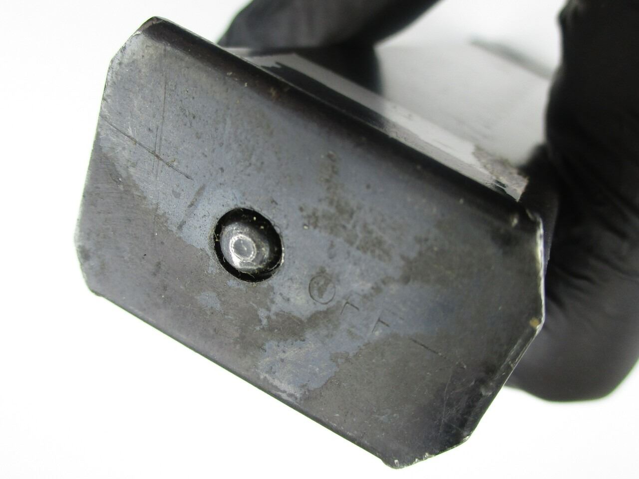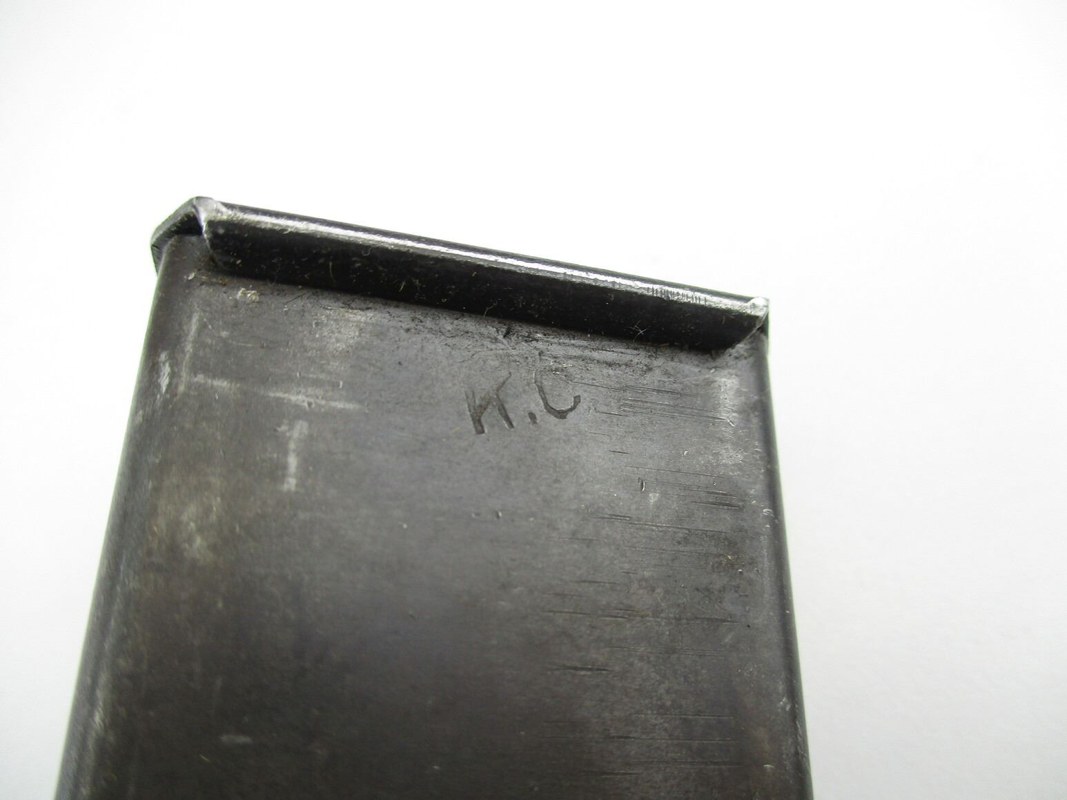 CANADIAN STEN SMG MAGAZINE , 9MM, 5/32 ROUND PINNED MAG, BLUED STEEL, C-BROAD ARROW MARKED ON BACK OF MAG.