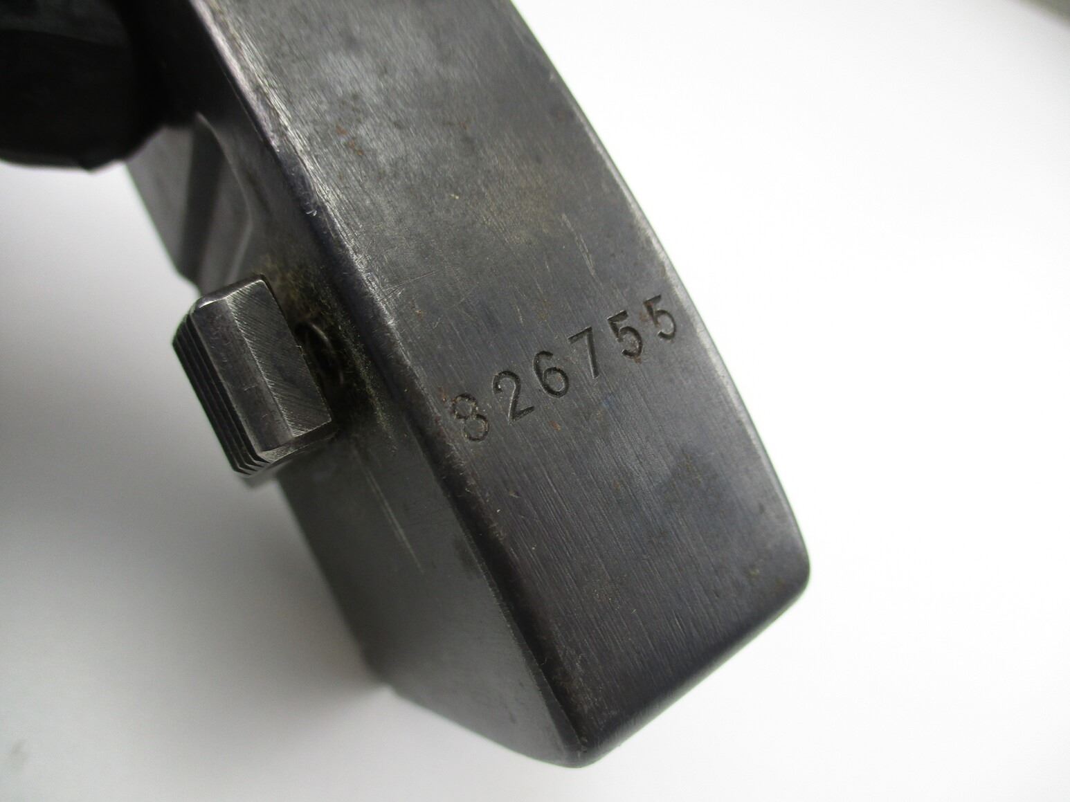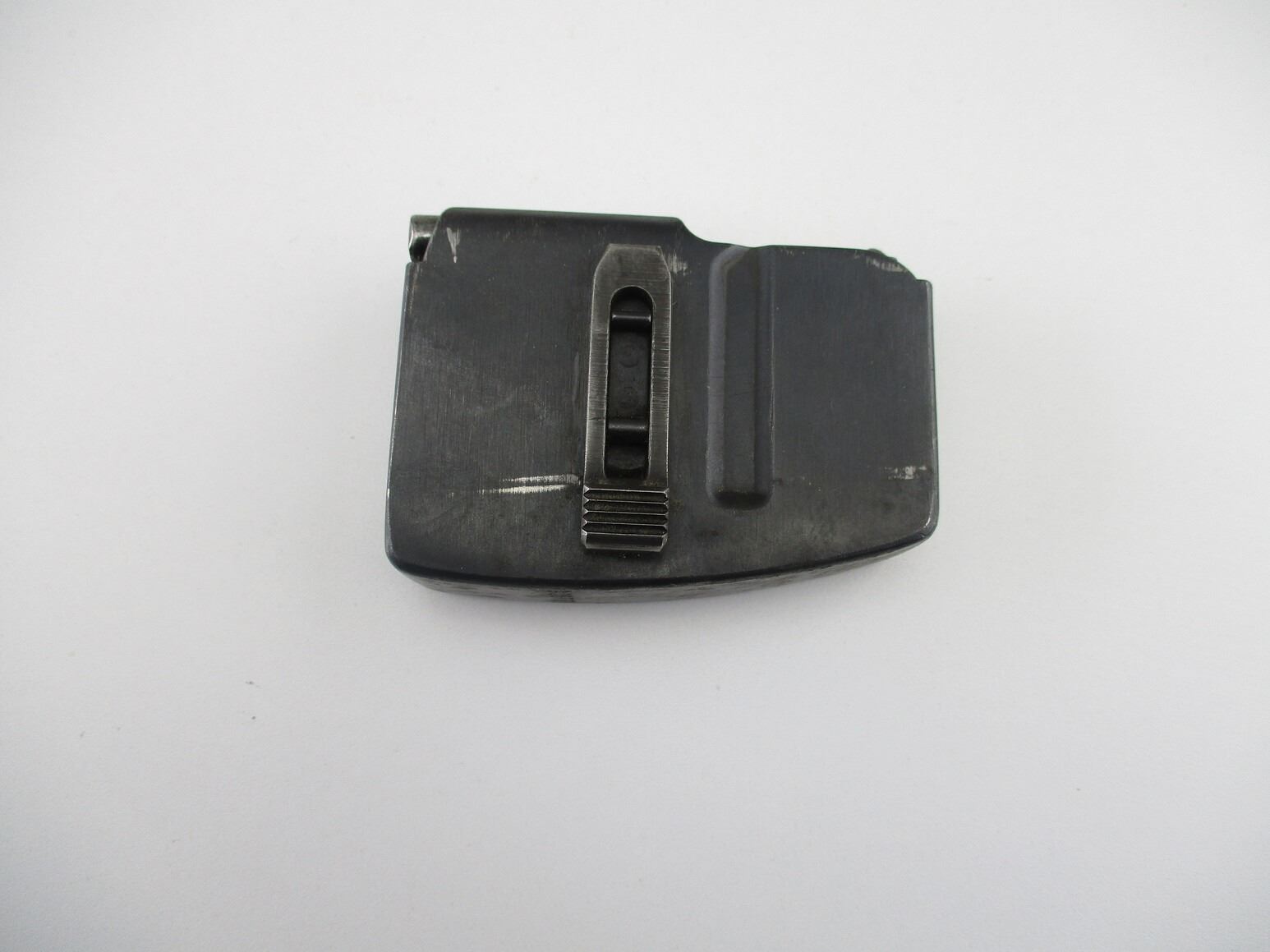 SWISS SCHMIDT RUBIN RIFLE MAGAZINE , FITS K31, 7.5X 55 RIFLES, 5 ROUND MAG, BLUED STEEL, SWISS CROSS MARKED ON BACK, # 826755 ON BOTTOM OF MAG. & OTHER MARKINGS.