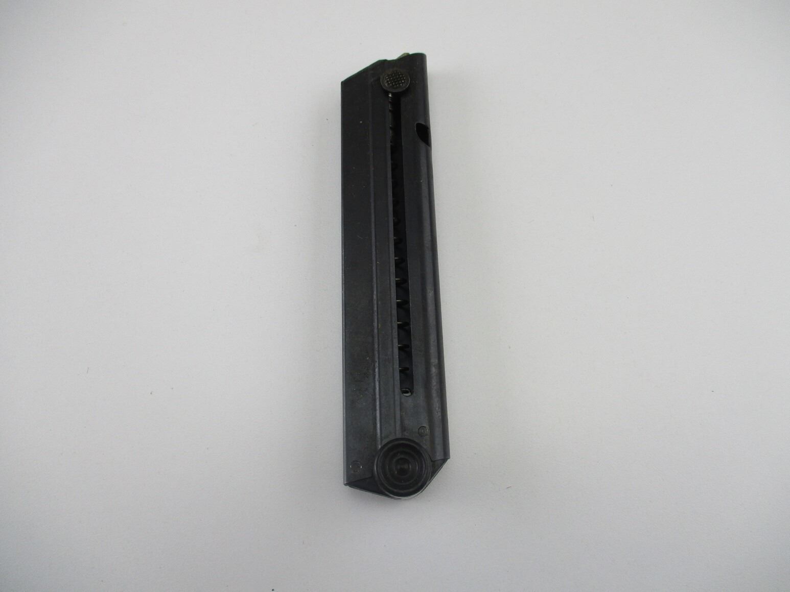 P08 LUGER PISTOL MAGAZINE & GRIPS , 9MM LUGER, 8 ROUND MAG, BLUED STEEL, WITH POLYMER TYPE BASE, UNMARKED, INCLUDES (1) PAIR OF WOODEN CHECKERED PISTOL GRIPS, MARKED "W" ON INNER PART OF GRIP.