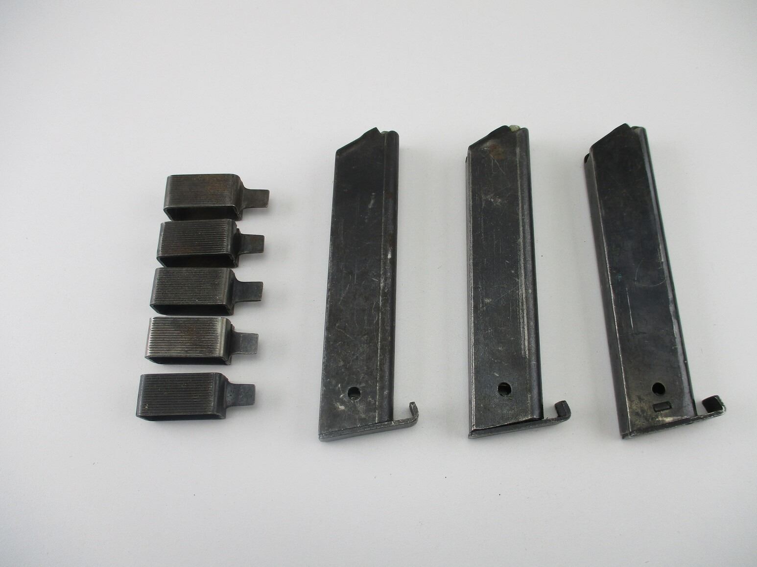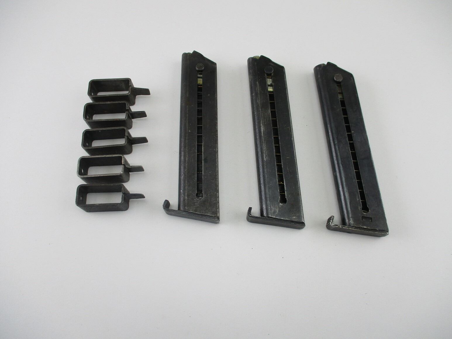 SWEDISH LAHTI MODEL 40 PISTOL MAGAZINES, LOT OF 3. 9MM, 7 ROUND MAGS, BLUED STEEL, UNMARKED, INCLUDES MAG LOADING TOOLS