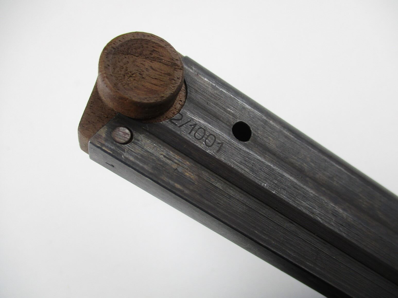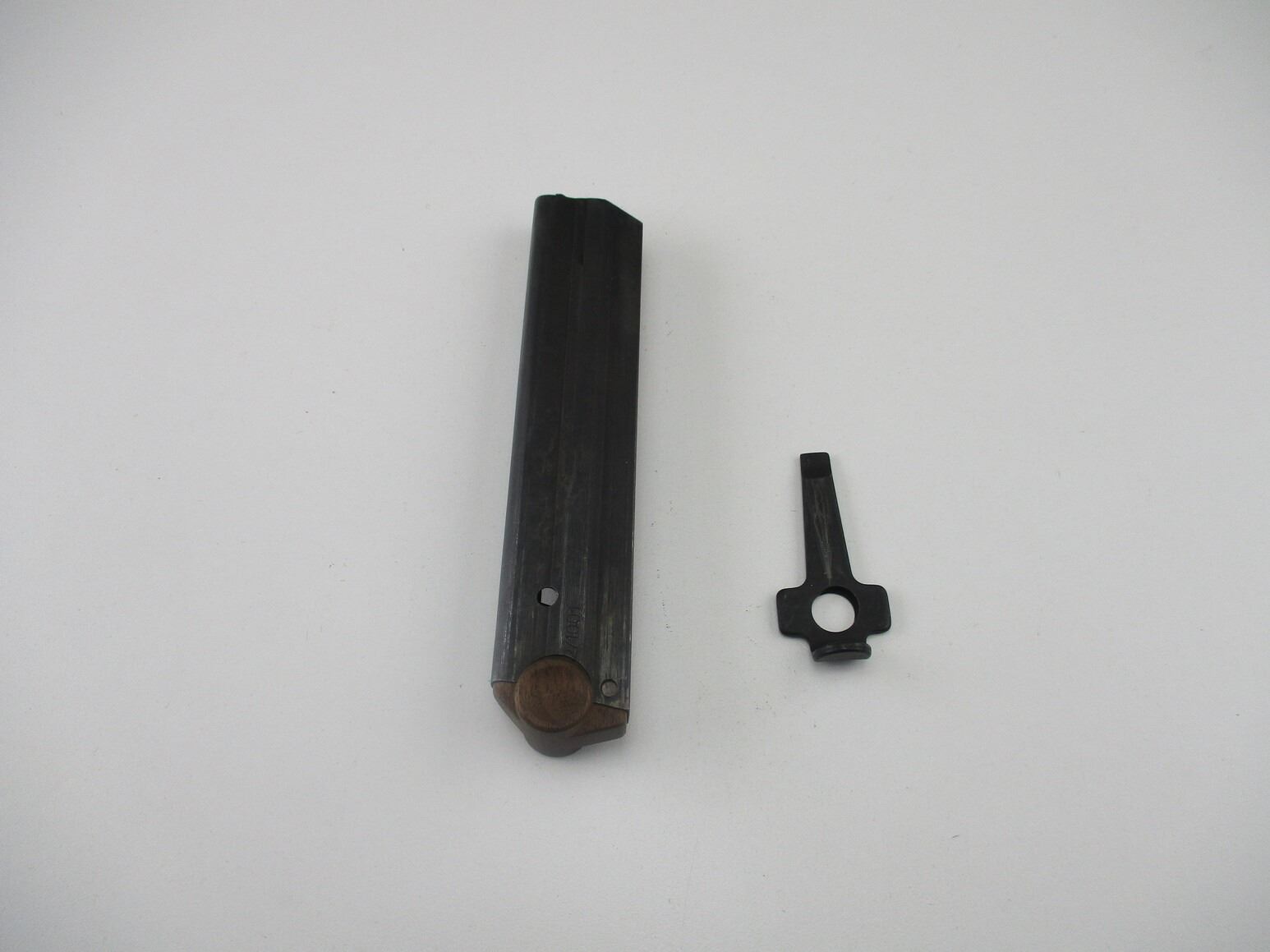REPRODUCTION P08 LUGER PISTOL MAGAZINE & COMBO TOOL , 9MM, 8 ROUND MAG, BLUED STEEL, POLYMER FOLLOWER & WOODEN BASE, 2/1001 MARKED ON SIDE, INCLUDES COMBO TOOL, UNMARKED.