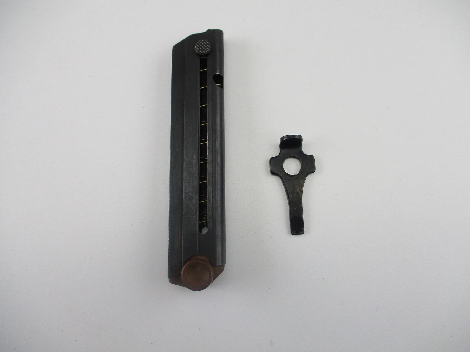 REPRODUCTION P08 LUGER PISTOL MAGAZINE & COMBO TOOL , 9MM, 8 ROUND MAG, BLUED STEEL, POLYMER FOLLOWER & WOODEN BASE, 2/1001 MARKED ON SIDE, INCLUDES COMBO TOOL, UNMARKED.