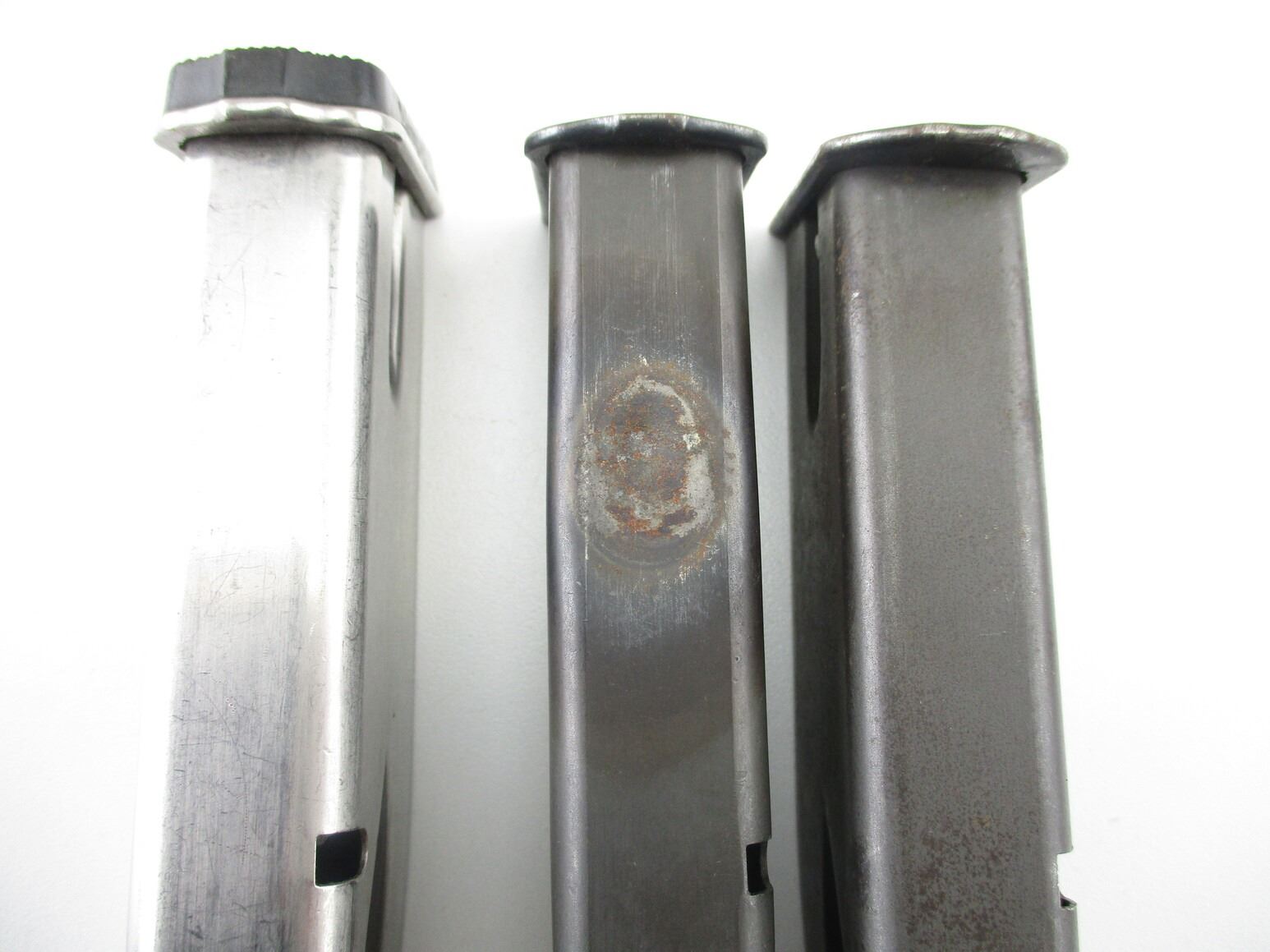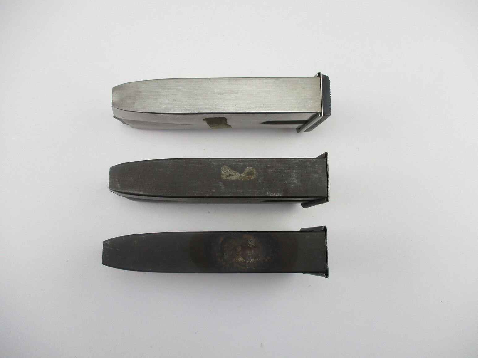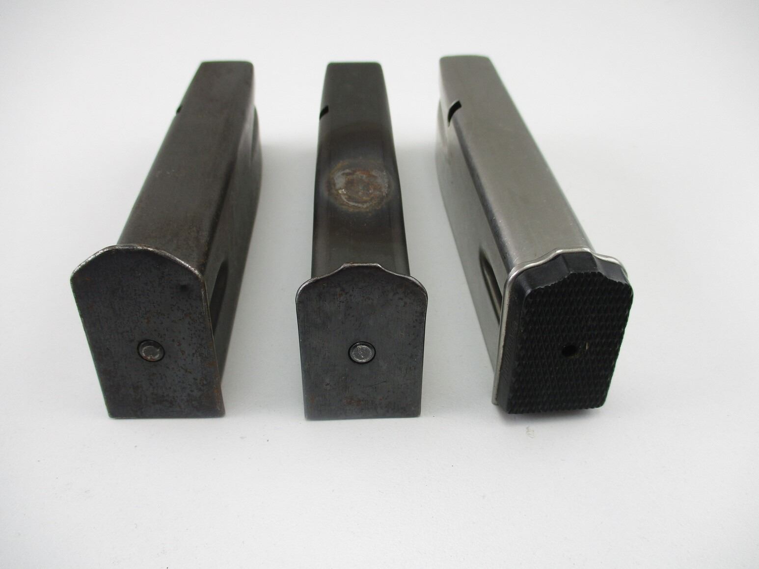 9MM HI-POWER PISTOL MAGAZINES , LOT OF 3. 9MM, 9/13 ROUND PINNED MAGS, UNMARKED, (2) PARKERIZED TYPE STEEL BODIES WITH POLYMER FOLLOWERS, (1) STAINLESS STEEL BODY WITH ALLOY TYPE FOLLOWER.