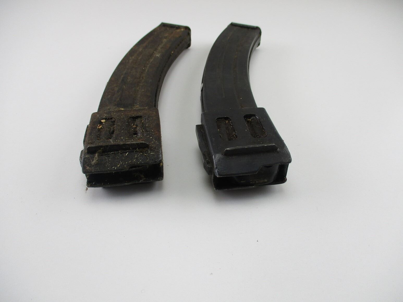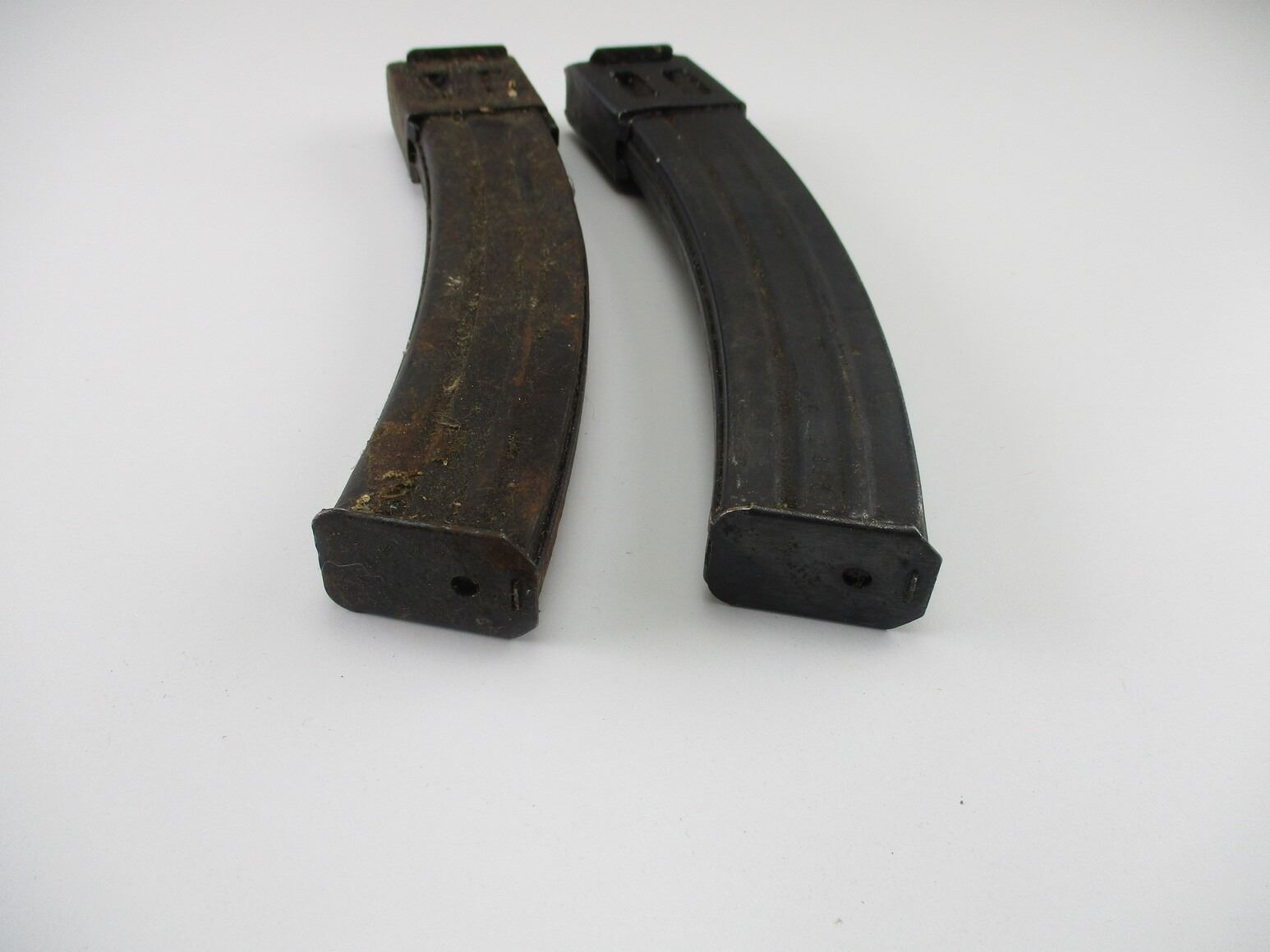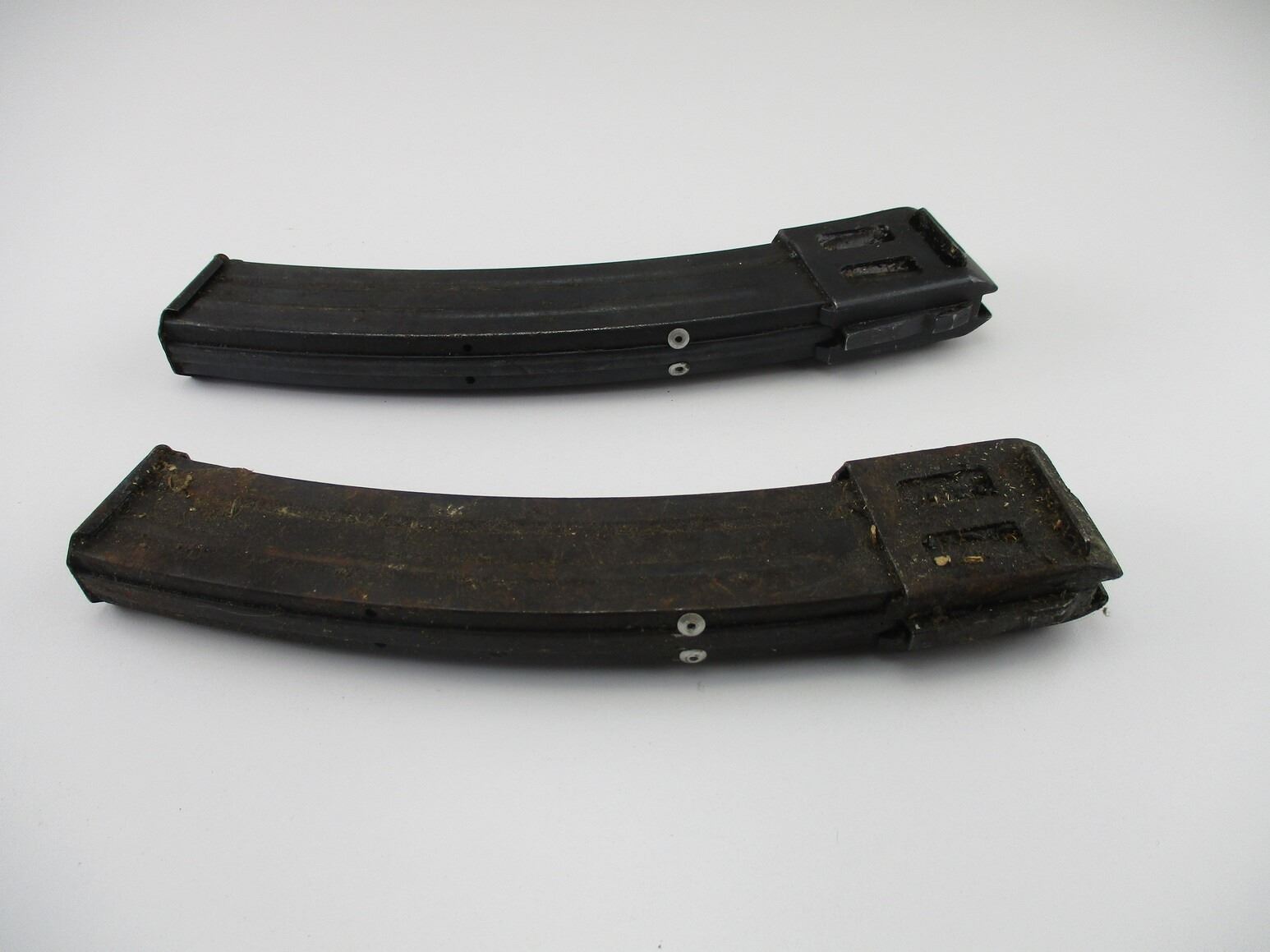 RUSSIAN TYPE PPSH 41 SMG MAGAZINES , 7.62X 25, 5/ 35 ROUND PINNED MAGS, BLUED STEEL, 1 MAG WITH SMALL SIDE MARKING.