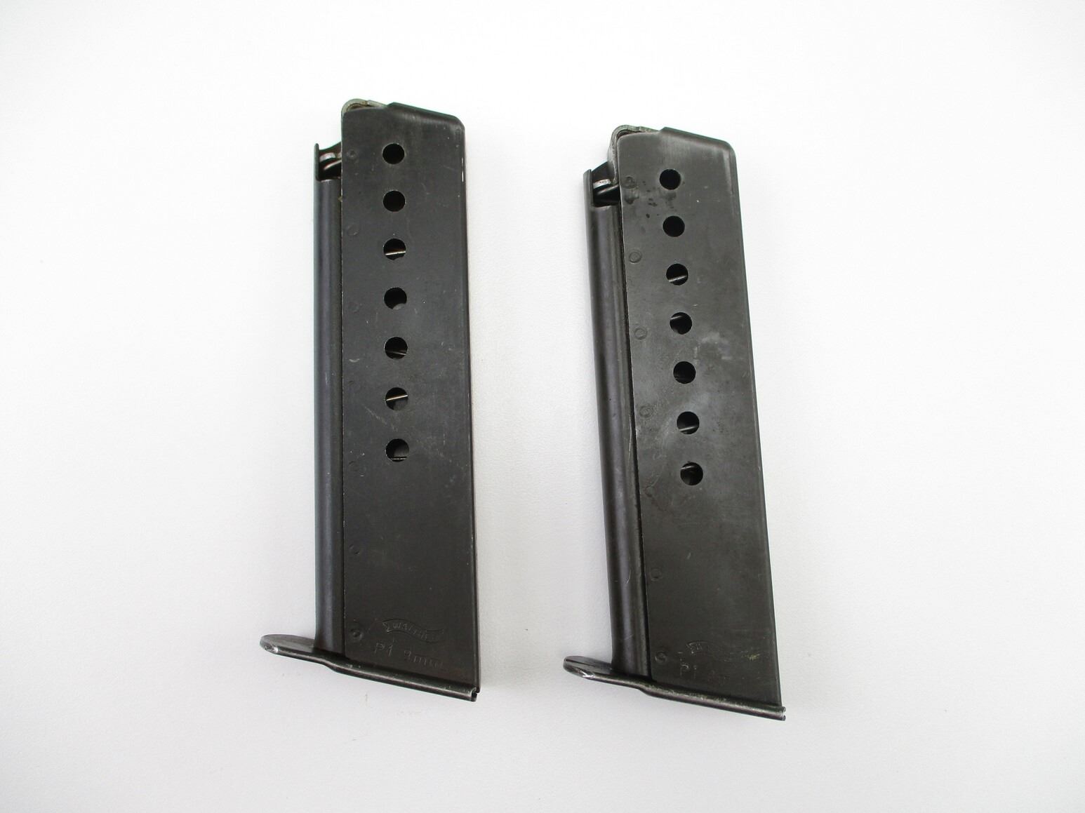 WALTHER P1/38 9MM PISTOL MAGAZINES , LOT OF 2. 9MM, 8 ROUND MAGS, BLUED STEEL, WALTHER MARKED, WITH "P1".