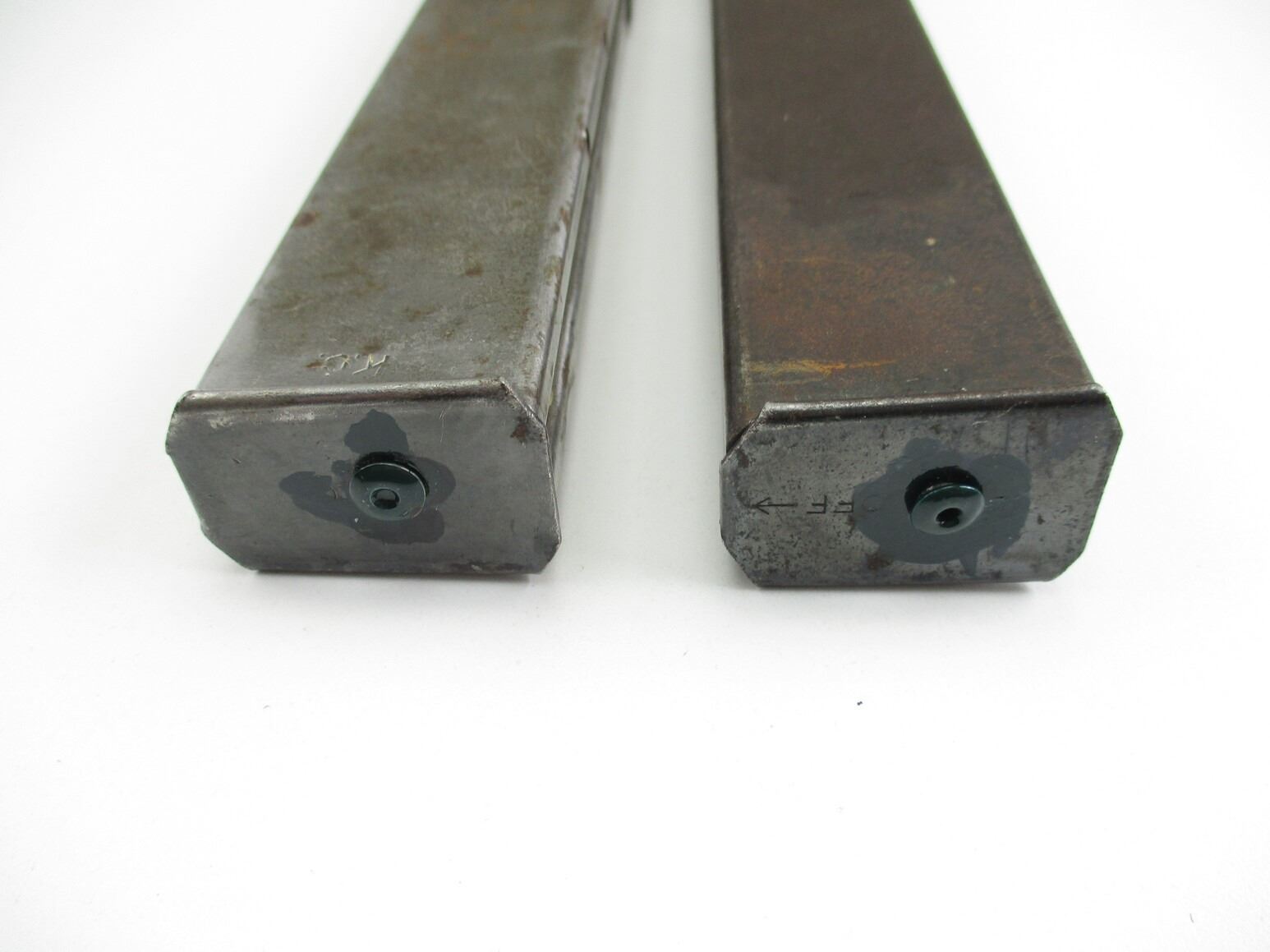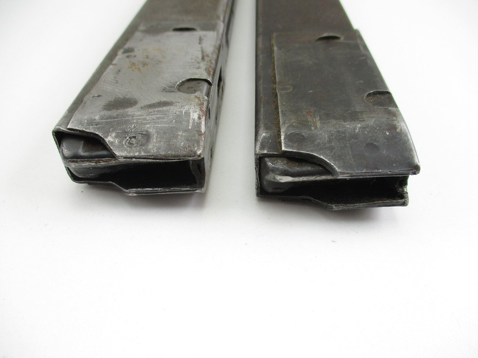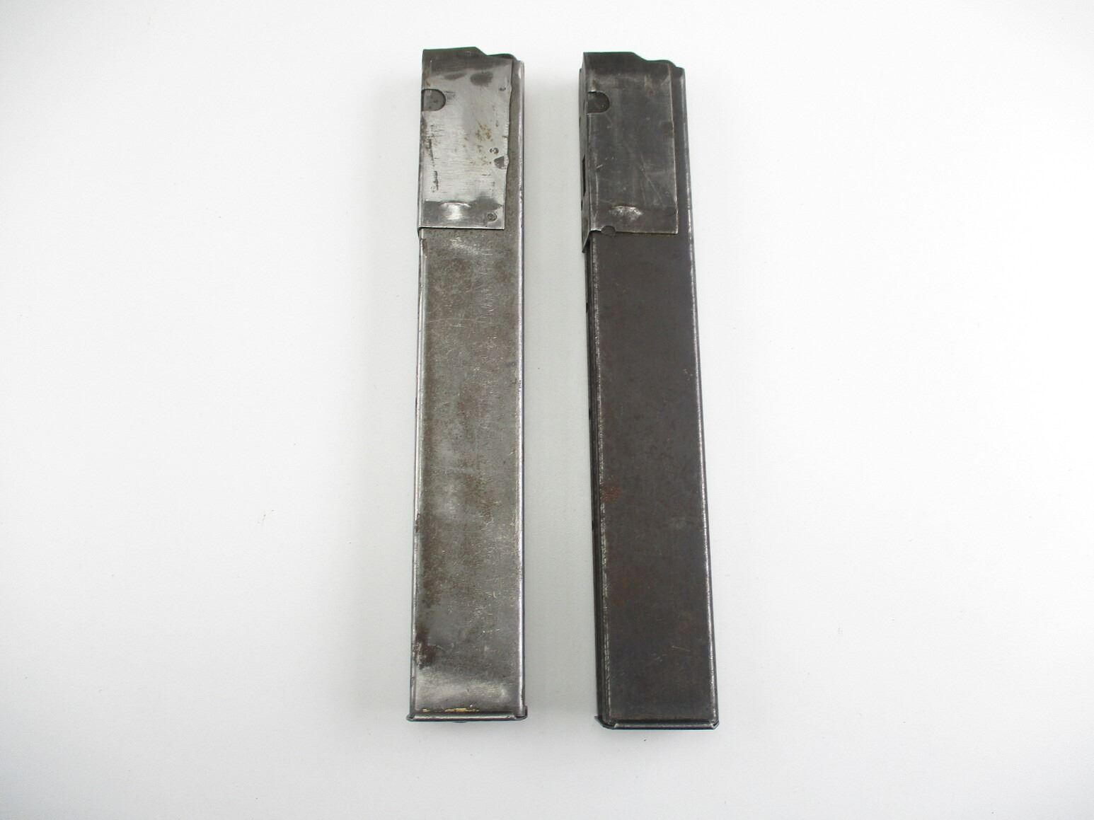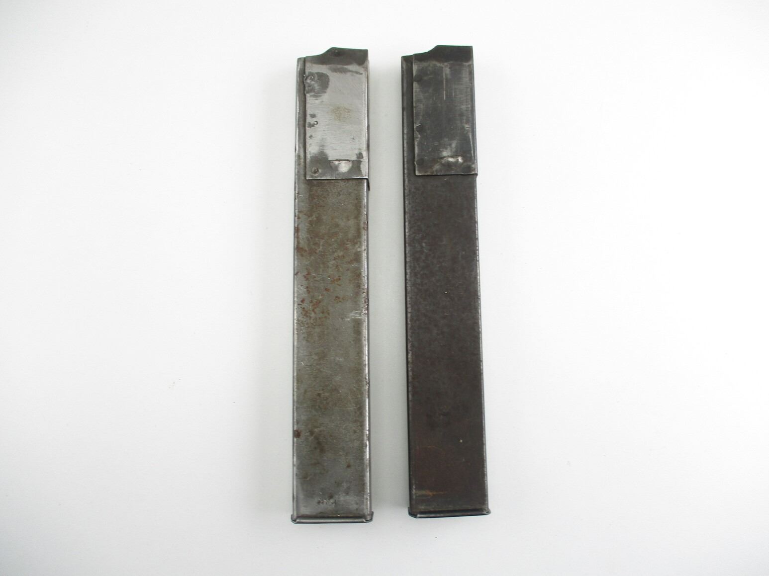 STEN SMG MAGAZINES , LOT OF 2. 9MM, 5/32 ROUND PINNED MAGS, NO VISIBLE MARKINGS. 1 STEEL, 1 BLUED STEEL,