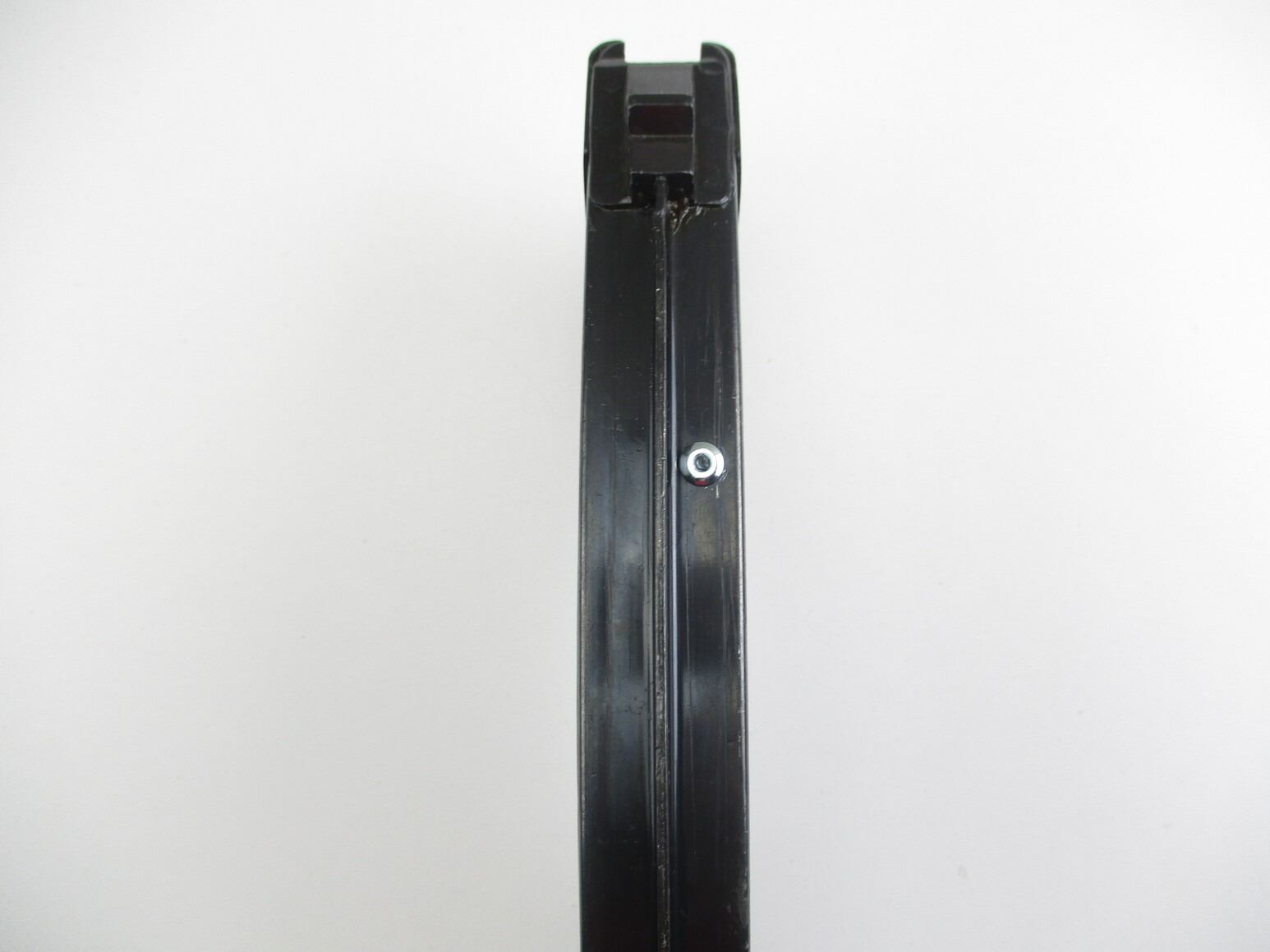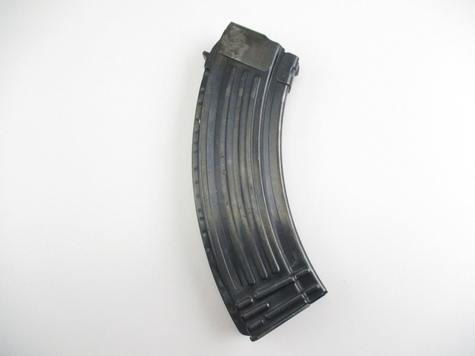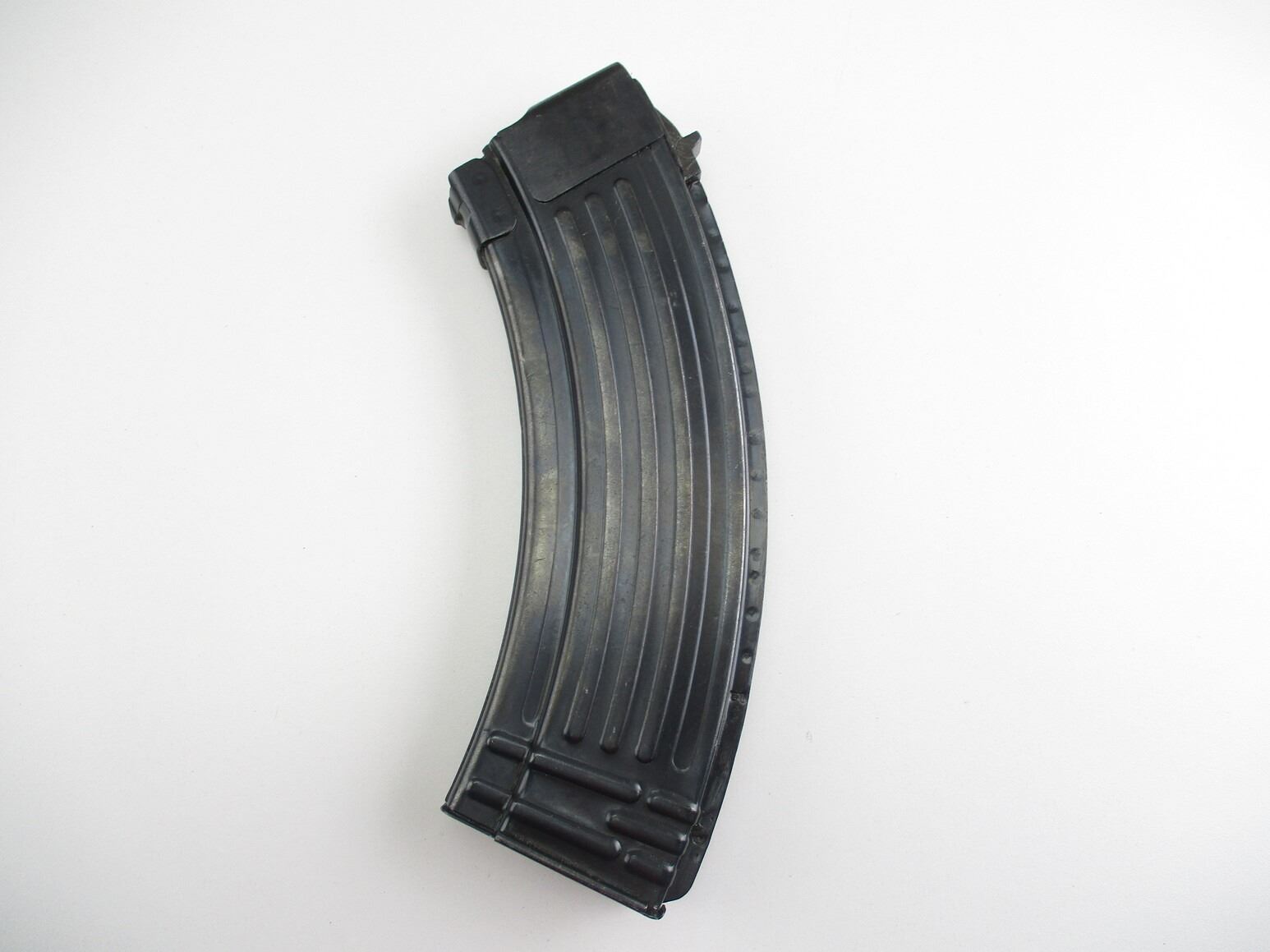 BULGARIAN TYPE AK-47 RIFLE MAGAZINE , 7.62X 39, 5/30 ROUND PINNED MAG, BLUED STEEL, UNMARKED, POSSIBLY BULGARIAN, LIGHT PITTING ON RIGHT SIDE FEEDING LIP AREA.