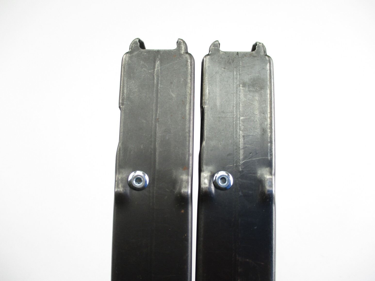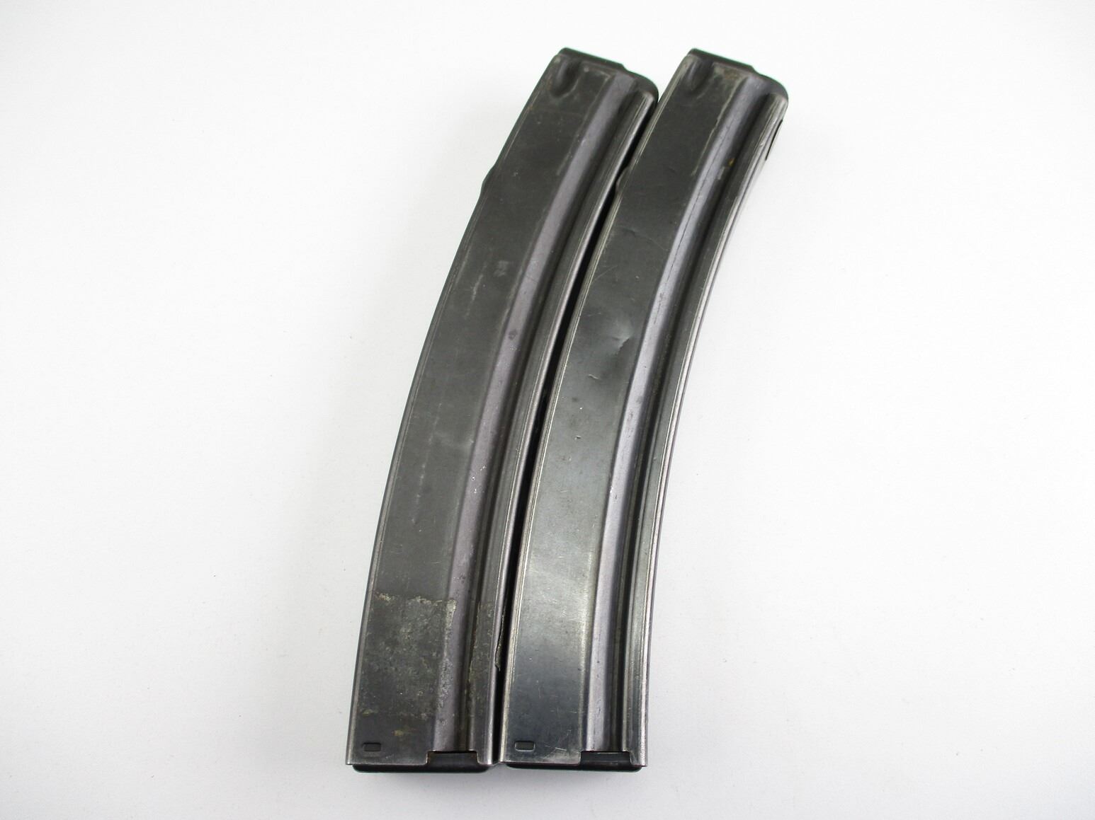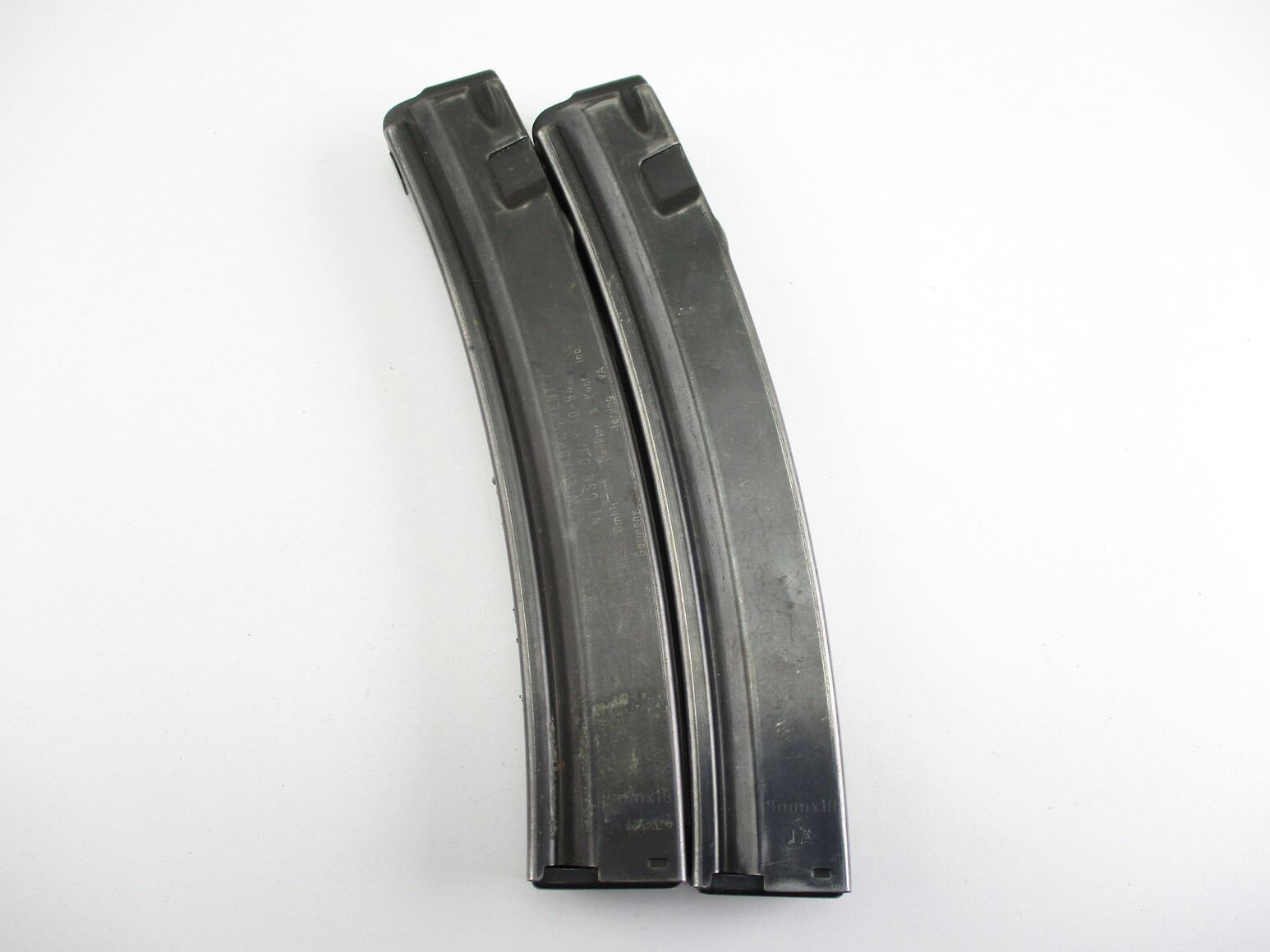 HK MP5 SMG MAGAZINES , LOT OF 2. 9MM, 5/30 ROUND PINNED MAGS, BLUED STEEL, BOTH ETCHED WITH NUMBERS ON BOTTOM OF MAGS, (1) MAG MARKED RESTRICTED LAW ENFORCEMENT / GOVERNMENT USE ONLY 10-94, (1) MARKED JA.