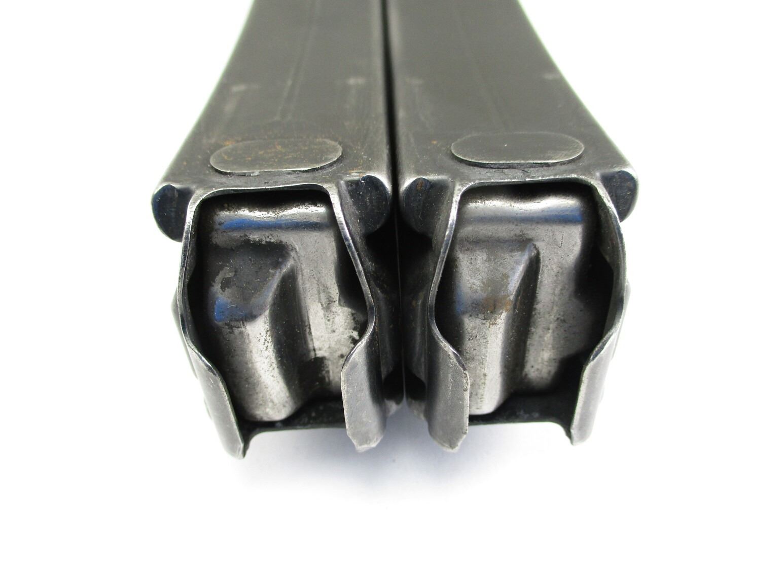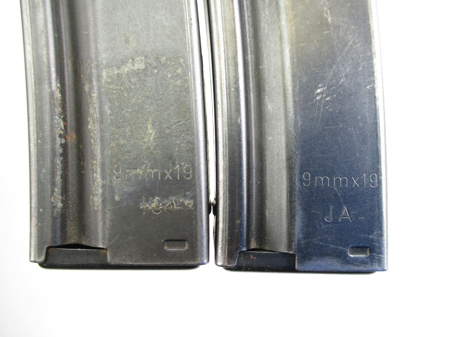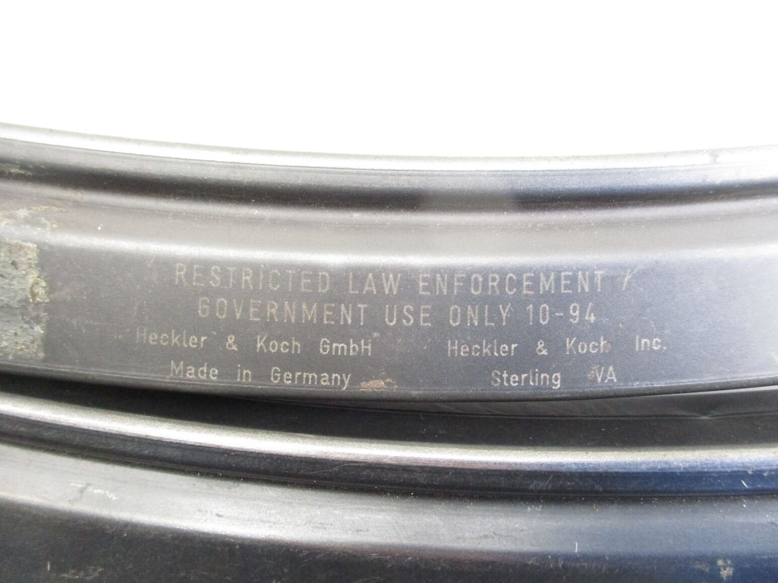 HK MP5 SMG MAGAZINES , LOT OF 2. 9MM, 5/30 ROUND PINNED MAGS, BLUED STEEL, BOTH ETCHED WITH NUMBERS ON BOTTOM OF MAGS, (1) MAG MARKED RESTRICTED LAW ENFORCEMENT / GOVERNMENT USE ONLY 10-94, (1) MARKED JA.
