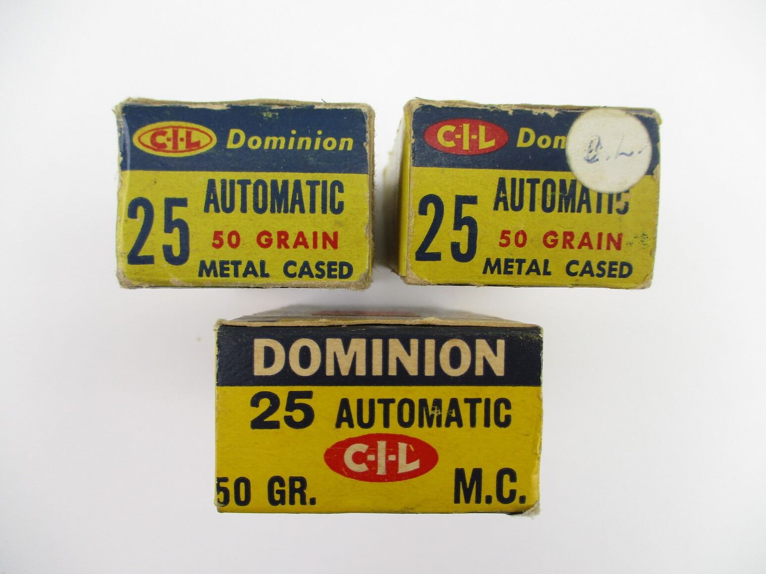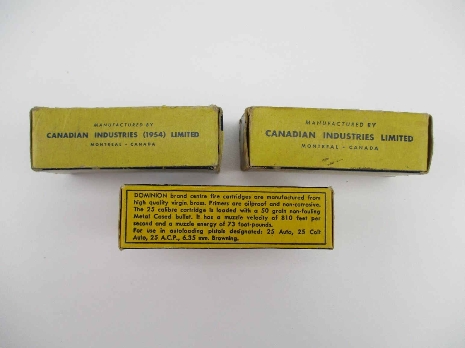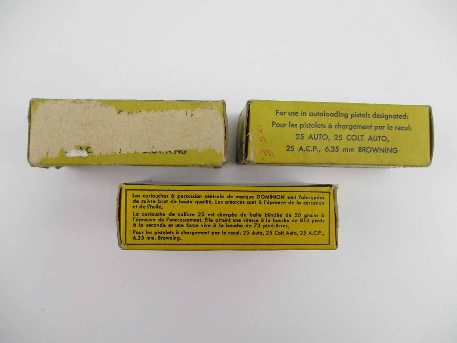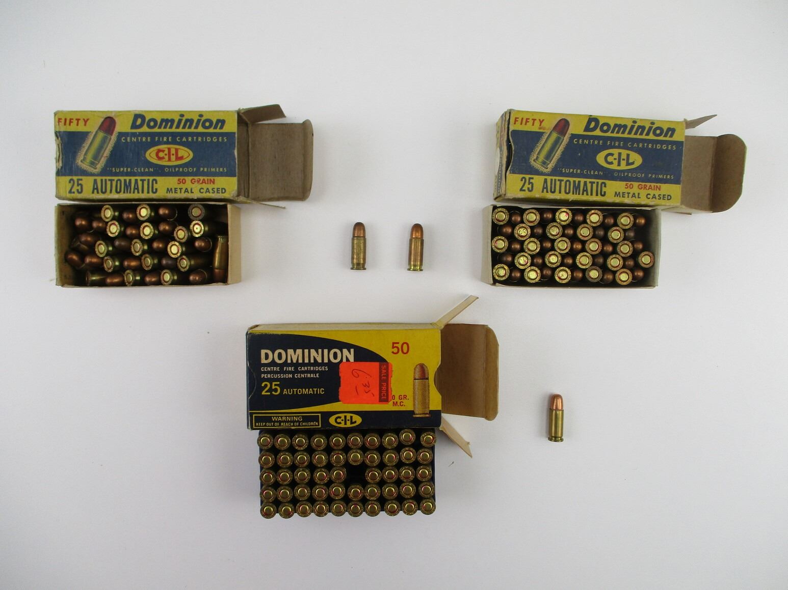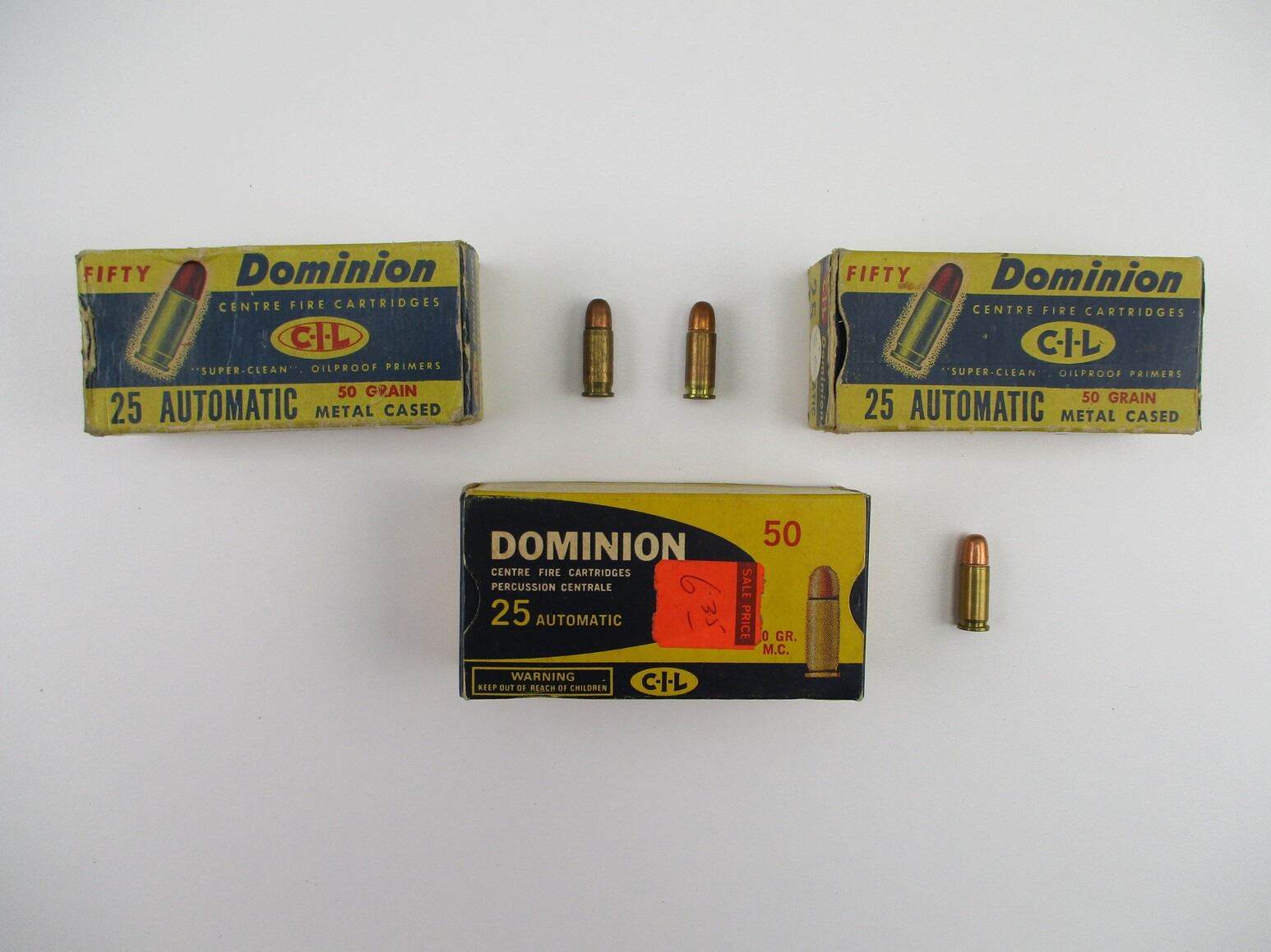 COLLECTIBLE ..25 AUTOMATIC AMMO LOT, 139 RNDS, 50 GRNS (STATED ON BOXES, NOT CONFIRMED), METAL CASED, IN ORIGINAL DOMINION PKGS, THERE ARE NEW SHIPPING RESTRICTIONS, PLEASE MAKE SURE YOU HAVE READ AND CONFIRMED WE CAN SHIP TO YOU BEFORE BIDDING ON THIS LOT. PLEASE SEE LOT 0 IN THIS SESSION. NO REFUNDS WILL BE ISSUED, OR BIDS RETRACTED