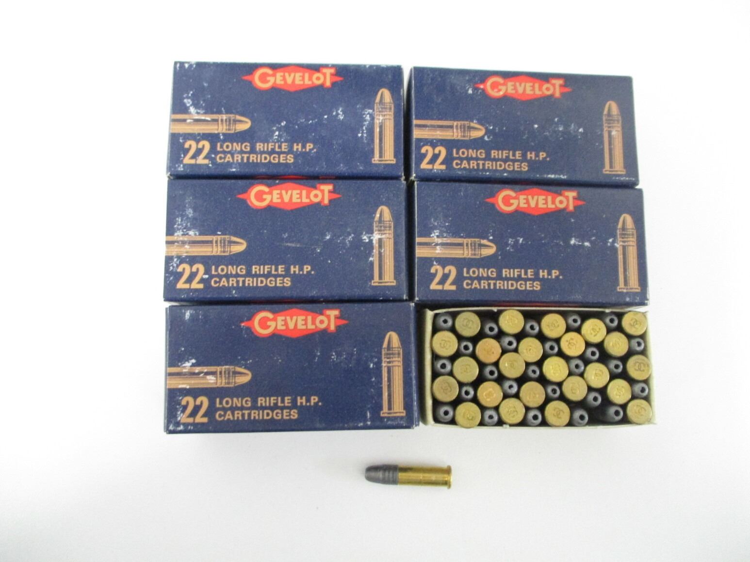COLLECTIBLE GEVELOT .22 LONG RIFLE AMMO, 250 RNDS, HOLLOW POINT, IN COLLECTIBLE AMMO BOXES, THERE ARE NEW SHIPPING RESTRICTIONS, PLEASE MAKE SURE YOU HAVE READ AND CONFIRMED WE CAN SHIP TO YOU BEFORE BIDDING ON THIS LOT. PLEASE SEE LOT 0 IN THIS SESSION. NO REFUNDS WILL BE ISSUED, OR BIDS RETRACTED