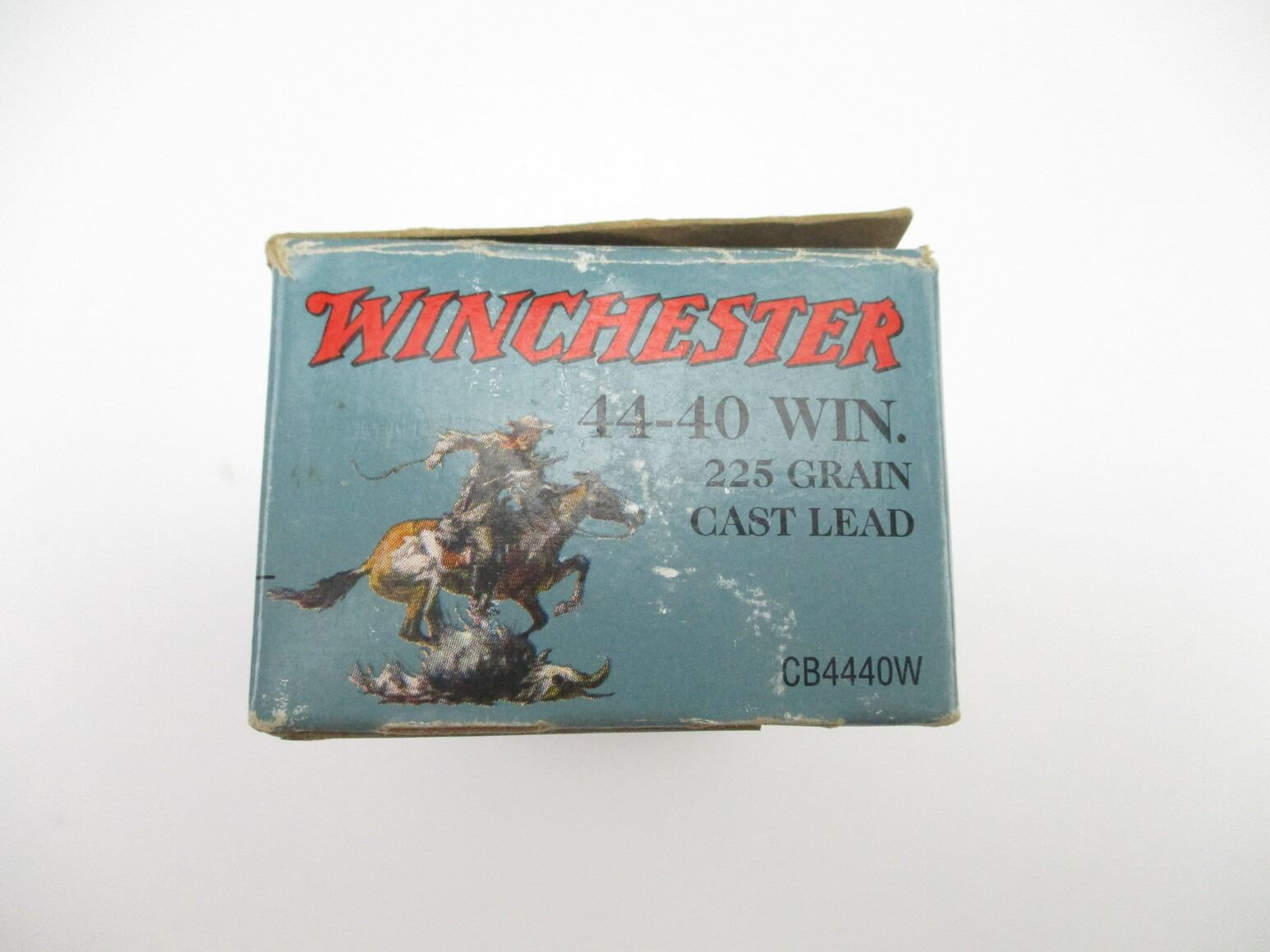 COLLECTIBLE WINCHESTER .44-40 AMMO, 45 RNDS, 225 GRNS (STATED ON BOX, NOT CONFIRMED), CAST LEAD FLAT NOSE, IN COLLECTIBLE AMMO BOX, THERE ARE NEW SHIPPING RESTRICTIONS, PLEASE MAKE SURE YOU HAVE READ AND CONFIRMED WE CAN SHIP TO YOU BEFORE BIDDING ON THIS LOT. PLEASE SEE LOT 0 IN THIS SESSION. NO REFUNDS WILL BE ISSUED, OR BIDS RETRACTED