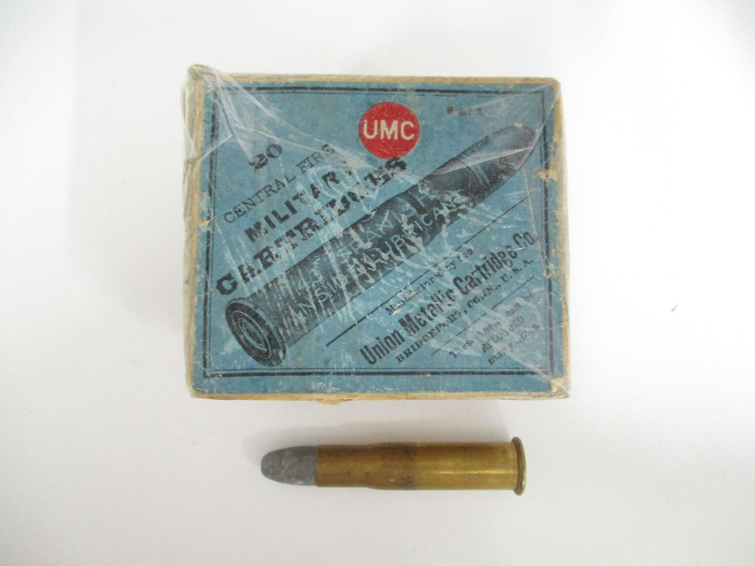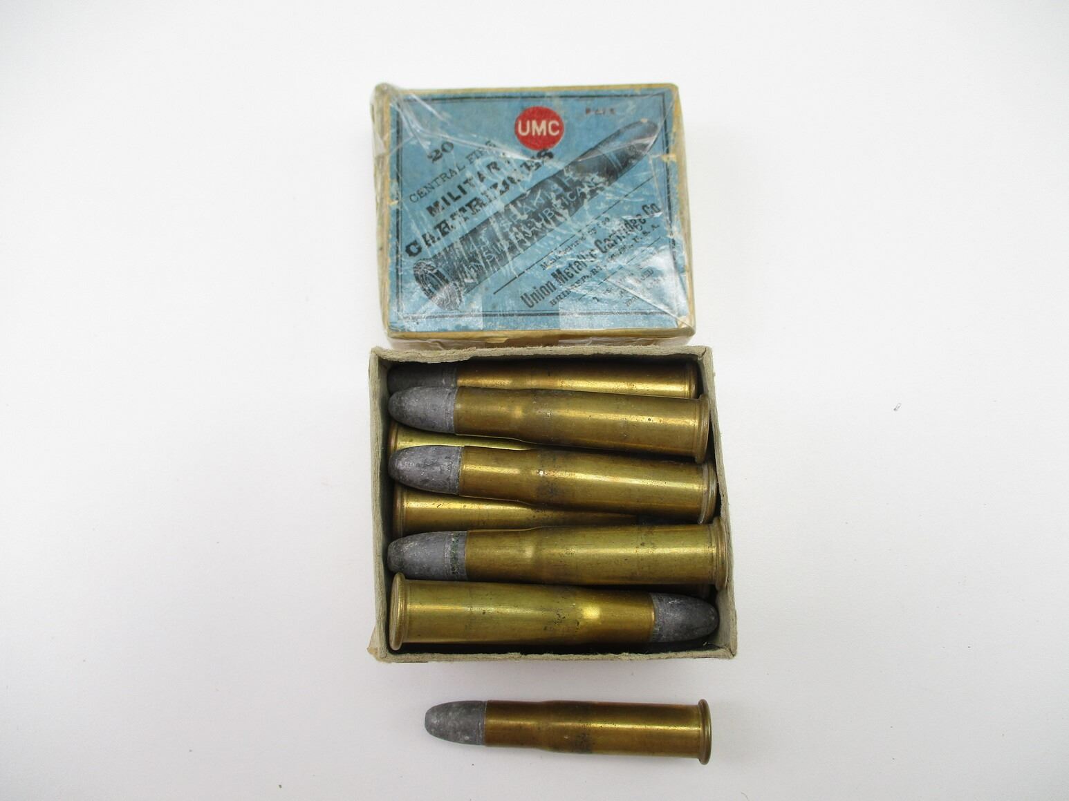 COLLECTIBLE UMC .43 SPANISH AMMO, 20 RNDS, MILITARY RNDS, IN WORN COLLECTIBLE AMMO BOX, THERE ARE NEW SHIPPING RESTRICTIONS, PLEASE MAKE SURE YOU HAVE READ AND CONFIRMED WE CAN SHIP TO YOU BEFORE BIDDING ON THIS LOT. PLEASE SEE LOT 0 IN THIS SESSION. NO REFUNDS WILL BE ISSUED, OR BIDS RETRACTED
