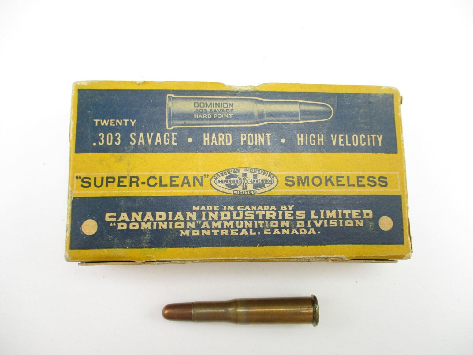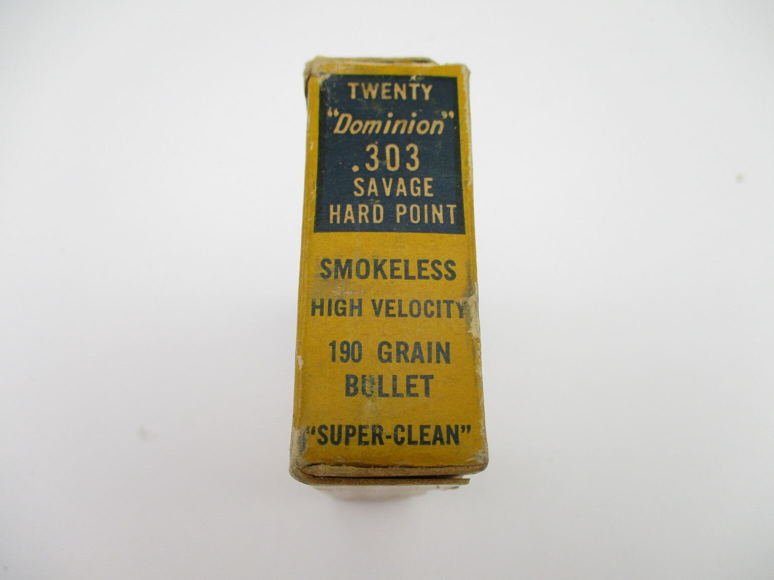 COLLECTIBLE CIL DOMINION .303 SAVAGE AMMO, 20 RNDS, 190 GRNS (STATED ON BOX, NOT CONFIRMED), HARD POINT, IN COLLECTIBLE AMMO BOX, THERE ARE NEW SHIPPING RESTRICTIONS, PLEASE MAKE SURE YOU HAVE READ AND CONFIRMED WE CAN SHIP TO YOU BEFORE BIDDING ON THIS LOT. PLEASE SEE LOT 0 IN THIS SESSION. NO REFUNDS WILL BE ISSUED, OR BIDS RETRACTED