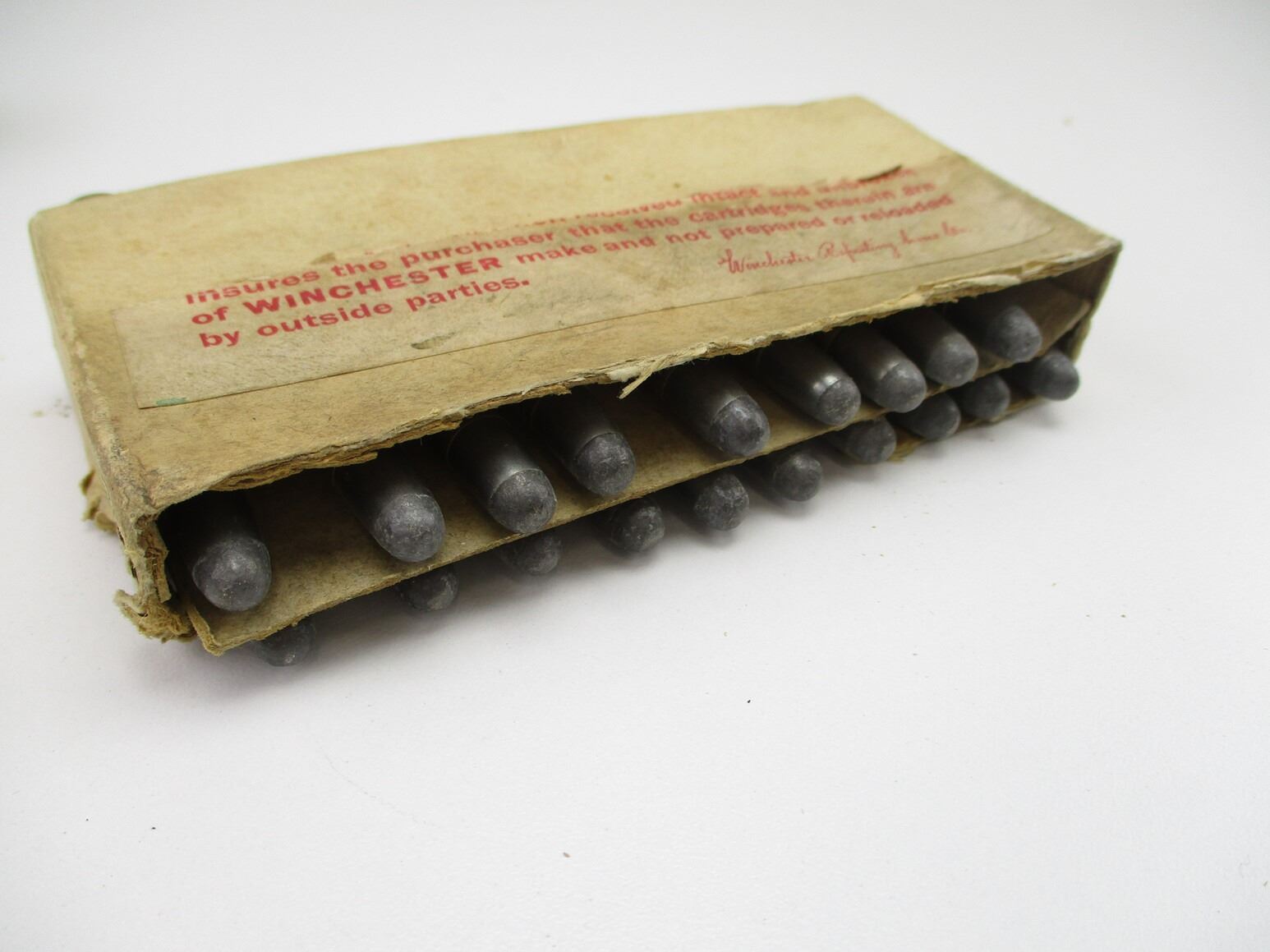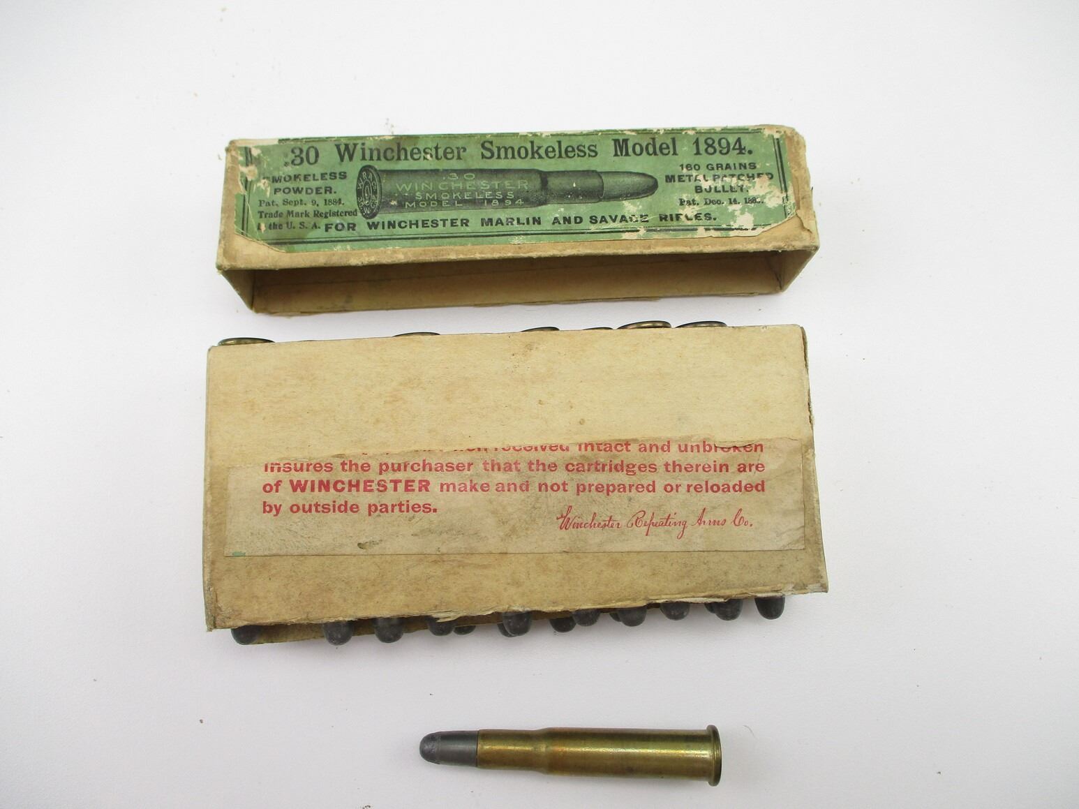 COLLECTIBLE WINCHESTER .30 W.C.F. AMMO, 20 RNDS, 160 GRNS (STATED ON BOX, NOT CONFIRMED), MODEL 1894, IN DAMAGED COLLECTIBLE AMMO BOX, THERE ARE NEW SHIPPING RESTRICTIONS, PLEASE MAKE SURE YOU HAVE READ AND CONFIRMED WE CAN SHIP TO YOU BEFORE BIDDING ON THIS LOT. PLEASE SEE LOT 0 IN THIS SESSION. NO REFUNDS WILL BE ISSUED, OR BIDS RETRACTED
