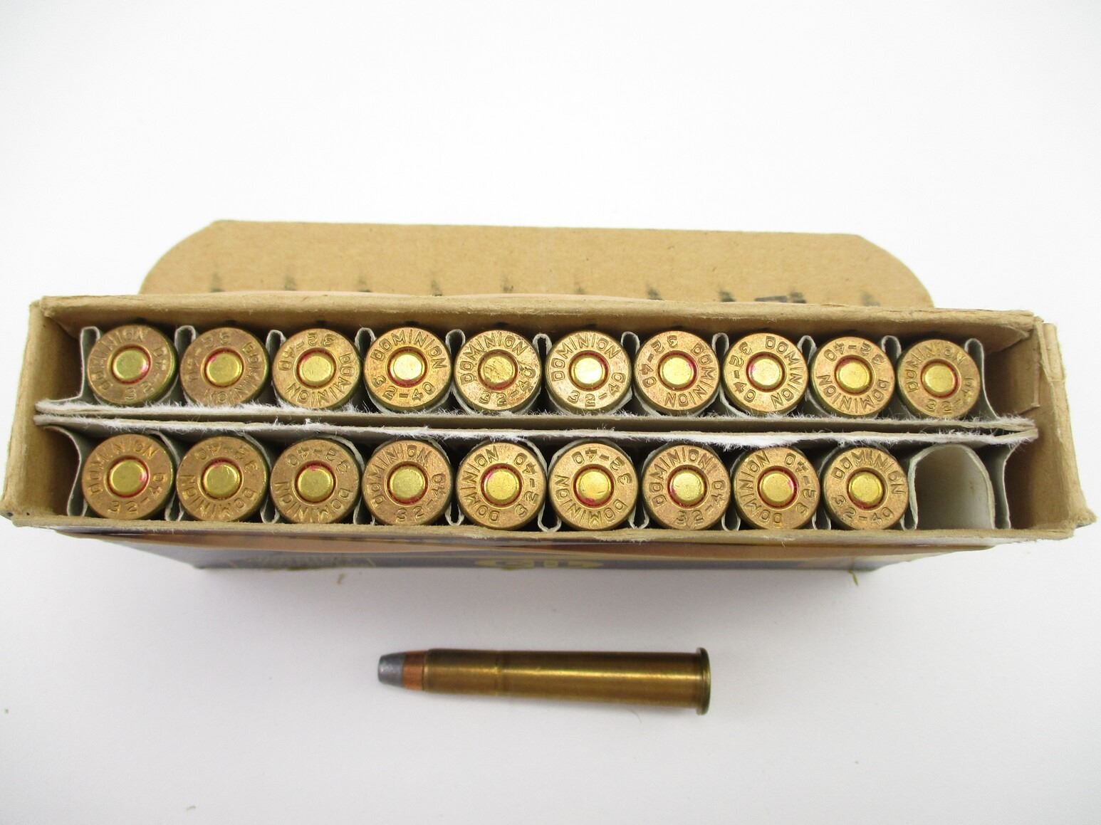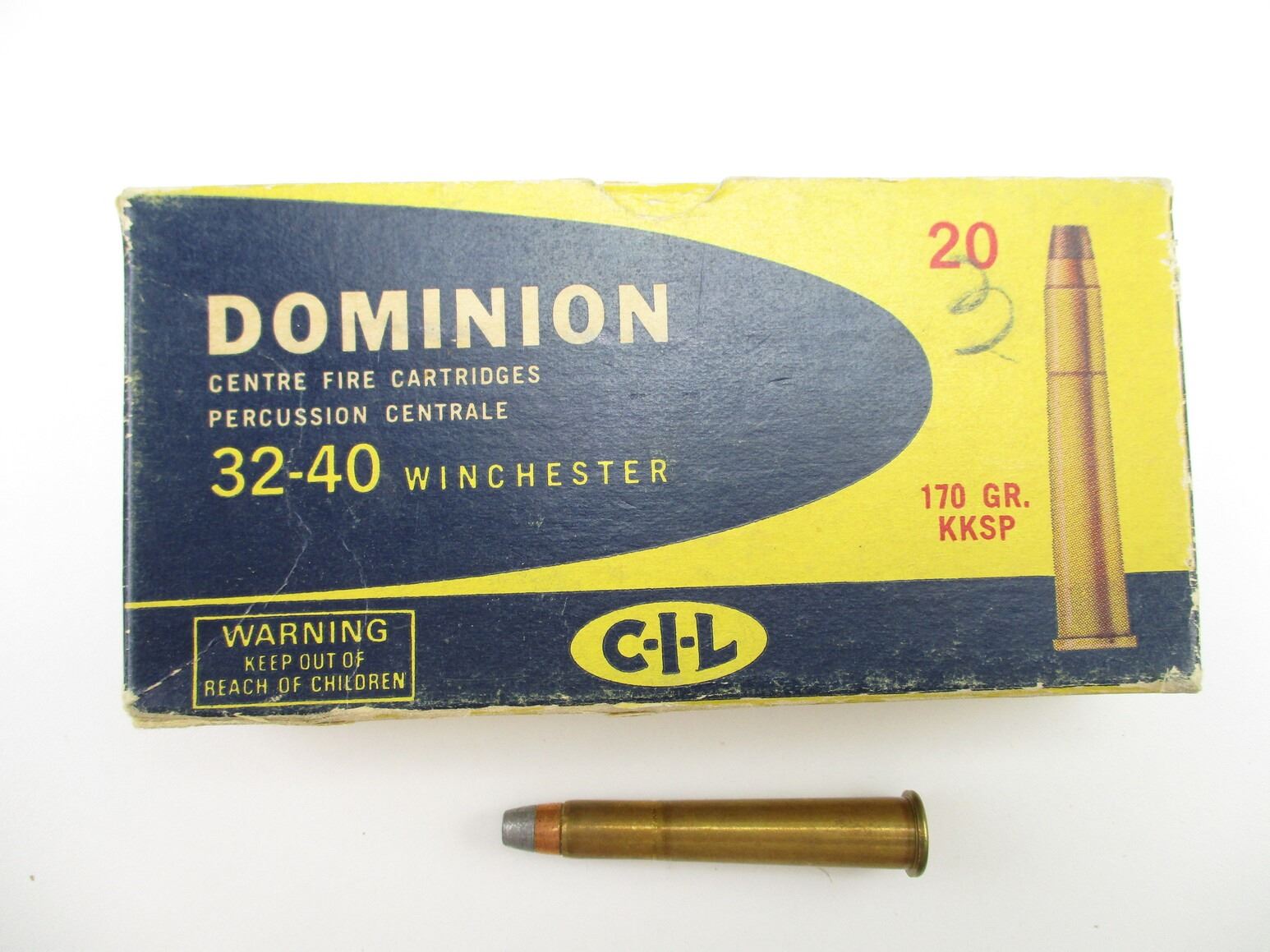 COLLECTIBLE CIL DOMINION .32-40 WIN AMMO, 20 RNDS, 170 GRNS (STATED ON BOX, NOT CONFIRMED), KKSP, IN COLLECTIBLE AMMO BOX, THERE ARE NEW SHIPPING RESTRICTIONS, PLEASE MAKE SURE YOU HAVE READ AND CONFIRMED WE CAN SHIP TO YOU BEFORE BIDDING ON THIS LOT. PLEASE SEE LOT 0 IN THIS SESSION. NO REFUNDS WILL BE ISSUED, OR BIDS RETRACTED