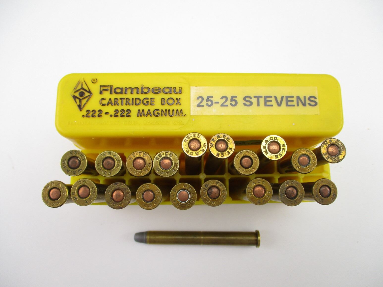 COLLECTIBLE W.R.A. .25-25 STEVENS AMMO, 20 RNDS, LOT INCLUDES (1) 20 ROUND FLAMBEAU AMMO CONTAINER, THERE ARE NEW SHIPPING RESTRICTIONS, PLEASE MAKE SURE YOU HAVE READ AND CONFIRMED WE CAN SHIP TO YOU BEFORE BIDDING ON THIS LOT. PLEASE SEE LOT 0 IN THIS SESSION. NO REFUNDS WILL BE ISSUED, OR BIDS RETRACTED