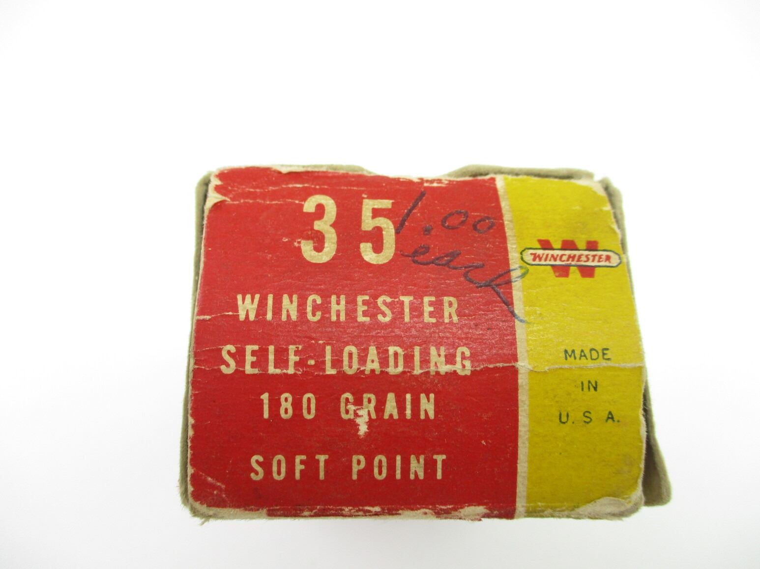 COLLECTIBLE WINCHESTER .35 WIN SELF-LOADING AMMO, 28 RNDS, 180 GRNS (STATED ON BOX, NOT CONFIRMED), SOFT POINT, IN DAMAGED COLLECTIBLE AMMO BOX, THERE ARE NEW SHIPPING RESTRICTIONS, PLEASE MAKE SURE YOU HAVE READ AND CONFIRMED WE CAN SHIP TO YOU BEFORE BIDDING ON THIS LOT. PLEASE SEE LOT 0 IN THIS SESSION. NO REFUNDS WILL BE ISSUED, OR BIDS RETRACTED