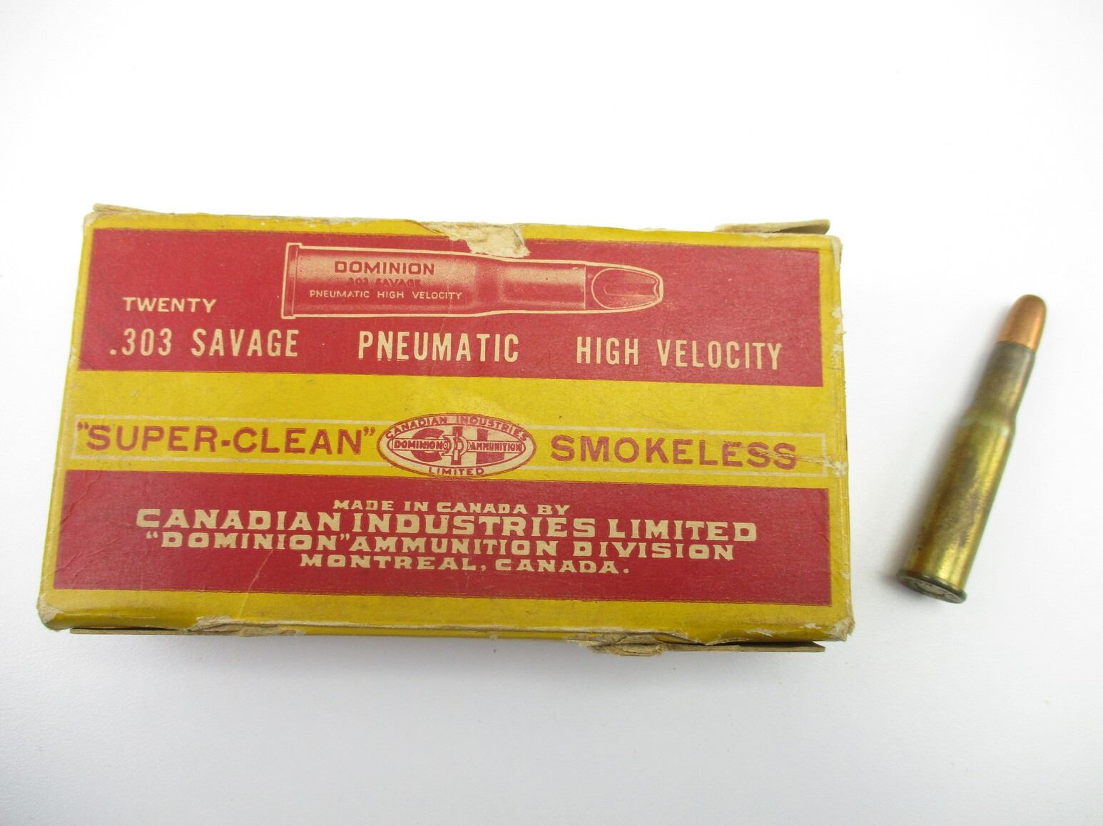 COLLECTIBLE CIL DOMINION .303 SAVAGE PNEUMATIC AMMO, 20 RNDS, 150 GRNS (STATED ON BOX, NOT CONFIRMED), IN COLLECTIBLE AMMO BOX, THERE ARE NEW SHIPPING RESTRICTIONS, PLEASE MAKE SURE YOU HAVE READ AND CONFIRMED WE CAN SHIP TO YOU BEFORE BIDDING ON THIS LOT. PLEASE SEE LOT 0 IN THIS SESSION. NO REFUNDS WILL BE ISSUED, OR BIDS RETRACTED
