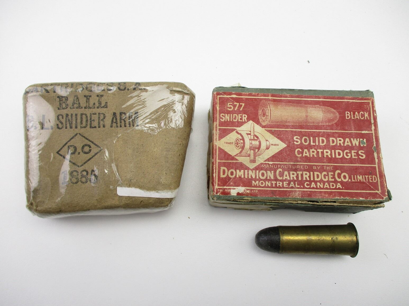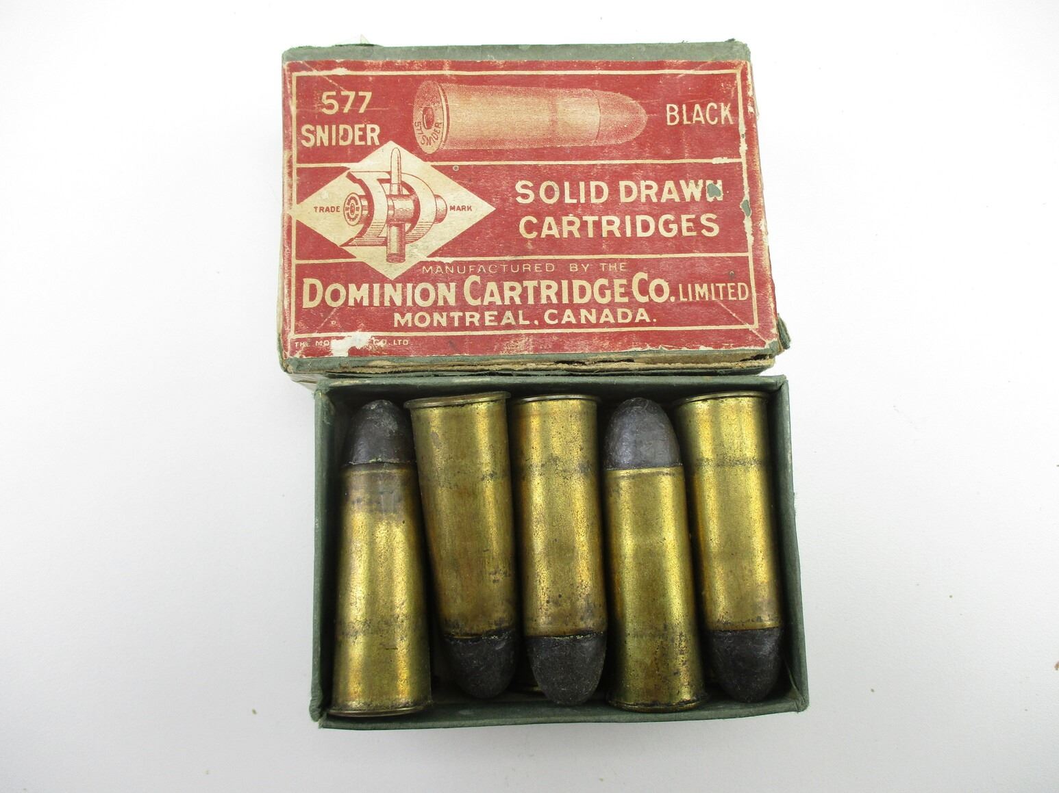COLLECTIBLE ASSORTED .577 SNIDER AMMO, 20 RNDS, LOT INCLUDES (10) DOMINION, BLACK POWDER, IN DAMAGED COLLECTIBLE AMMO BOX, & (10) MILITARY D.C. CO., DATED 1885, THERE ARE NEW SHIPPING RESTRICTIONS, PLEASE MAKE SURE YOU HAVE READ AND CONFIRMED WE CAN SHIP TO YOU BEFORE BIDDING ON THIS LOT. PLEASE SEE LOT 0 IN THIS SESSION. NO REFUNDS WILL BE ISSUED, OR BIDS RETRACTED
