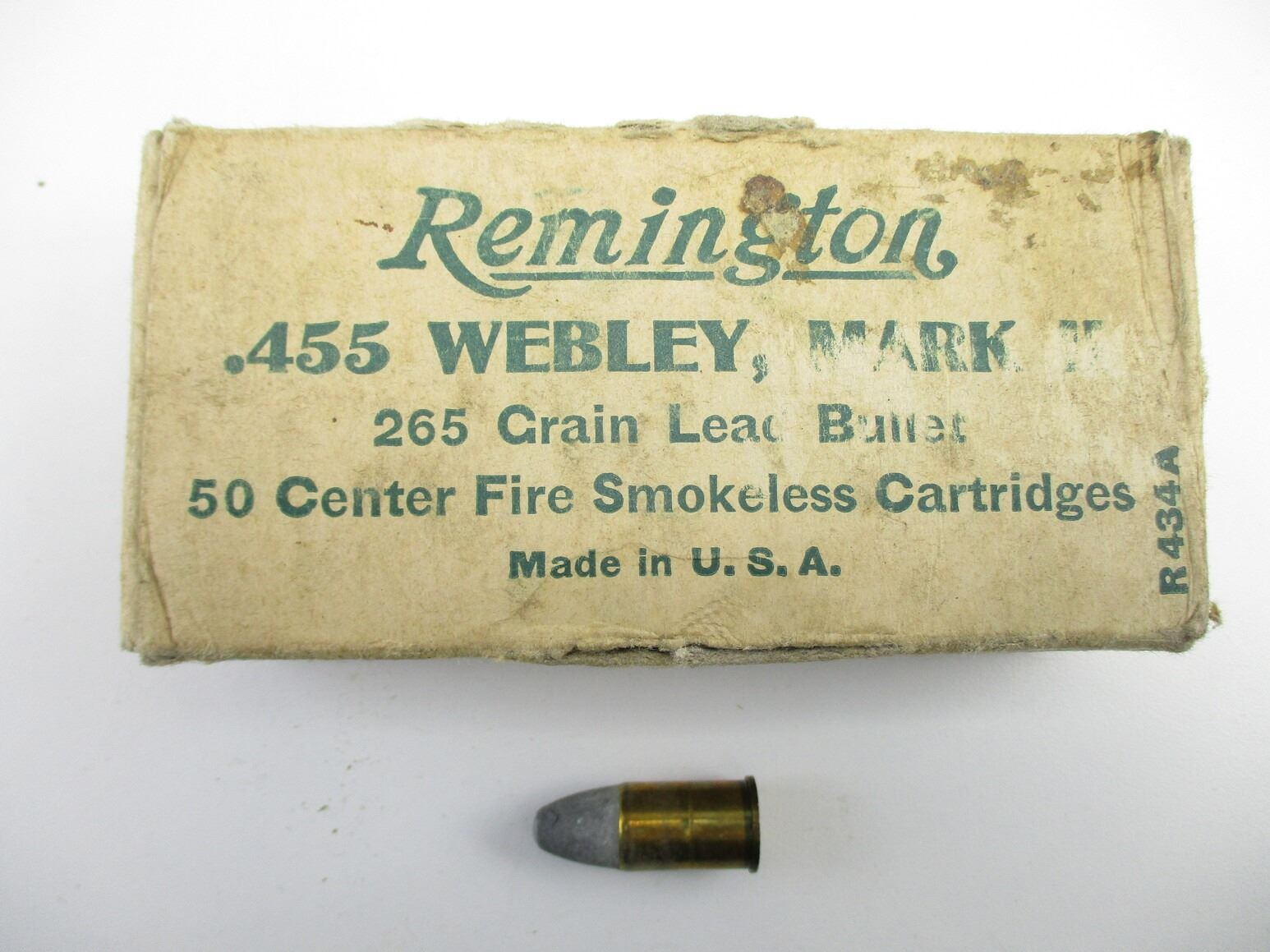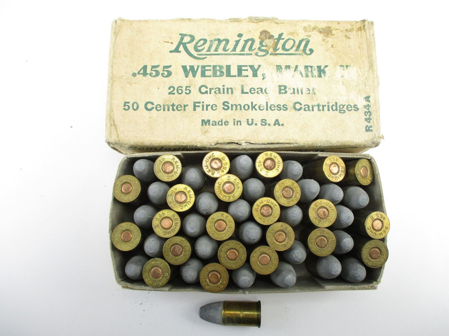 COLLECTIBLE REMINGTON .455 WEBLEY MARK 11 AMMO, 50 RNDS, 265 GRNS (STATED ON BOX, NOT CONFIRMED), LEAD BULLET, THERE ARE NEW SHIPPING RESTRICTIONS, PLEASE MAKE SURE YOU HAVE READ AND CONFIRMED WE CAN SHIP TO YOU BEFORE BIDDING ON THIS LOT. PLEASE SEE LOT 0 IN THIS SESSION. NO REFUNDS WILL BE ISSUED, OR BIDS RETRACTED