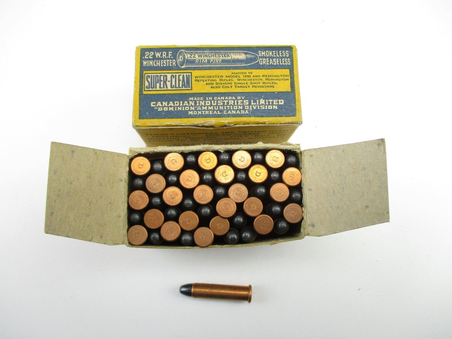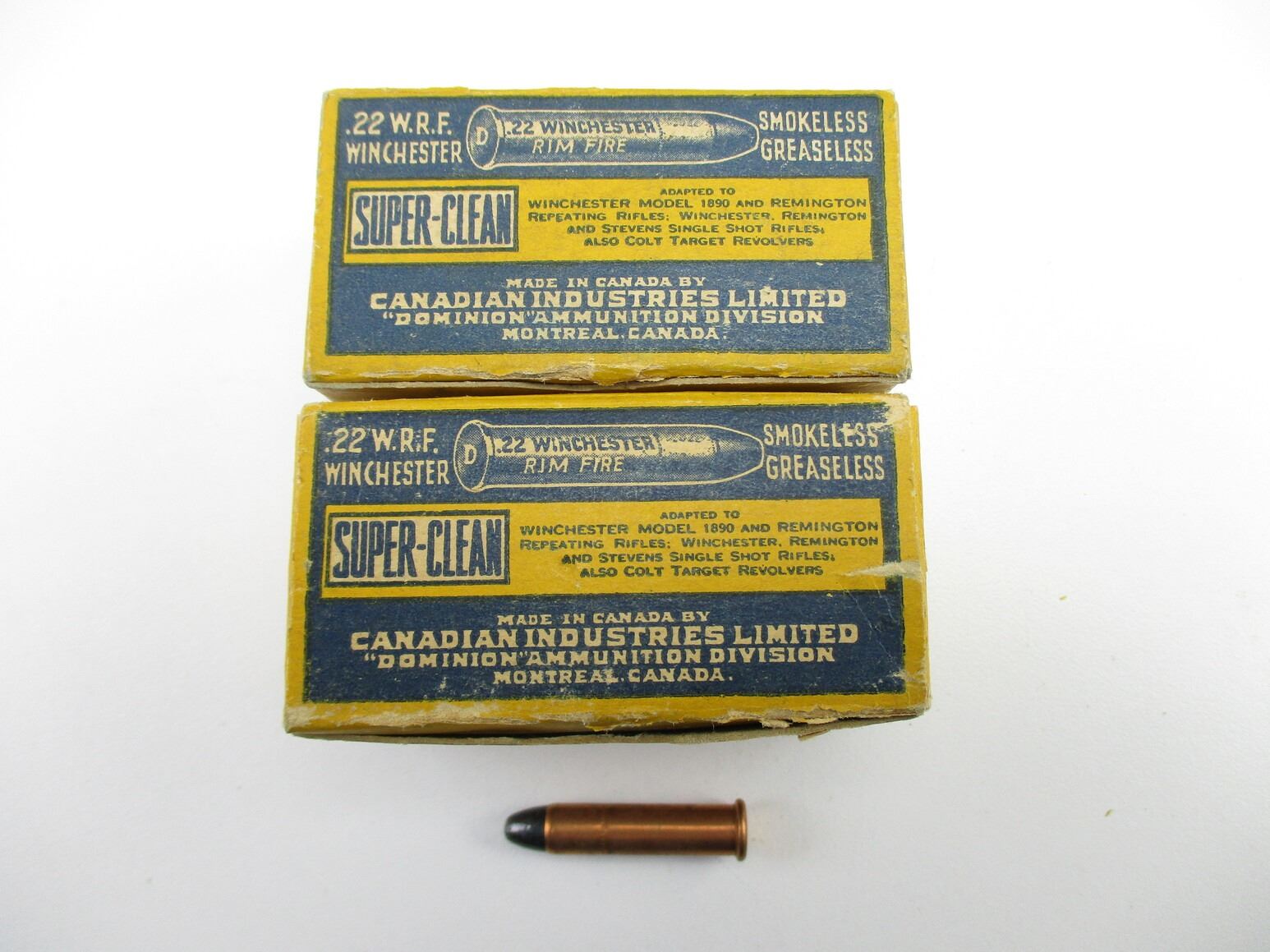 COLLECTIBLE CIL .22 W.R.F. AMMO, 100 RNDS, 45 GRNS (STATED ON BOX, NOT CONFIRMED), IN COLLECTIBLE AMMO BOXES, THERE ARE NEW SHIPPING RESTRICTIONS, PLEASE MAKE SURE YOU HAVE READ AND CONFIRMED WE CAN SHIP TO YOU BEFORE BIDDING ON THIS LOT. PLEASE SEE LOT 0 IN THIS SESSION. NO REFUNDS WILL BE ISSUED, OR BIDS RETRACTED