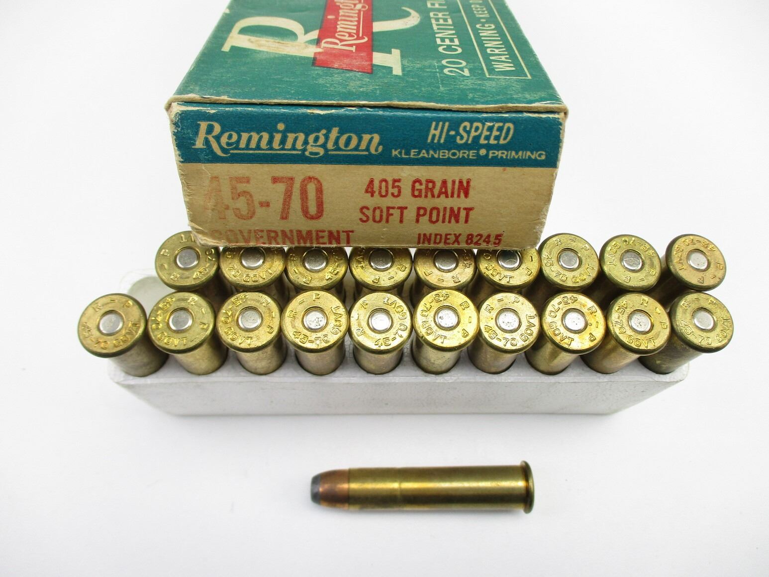 COLLECTIBLE REMINGTON .45-70 GOVT AMMO, 20 RNDS, 405 GRNS (STATED ON BOX, NOT CONFIRMED), SOFT POINT, IN COLLECTIBLE AMMO BOX, THERE ARE NEW SHIPPING RESTRICTIONS, PLEASE MAKE SURE YOU HAVE READ AND CONFIRMED WE CAN SHIP TO YOU BEFORE BIDDING ON THIS LOT. PLEASE SEE LOT 0 IN THIS SESSION. NO REFUNDS WILL BE ISSUED, OR BIDS RETRACTED