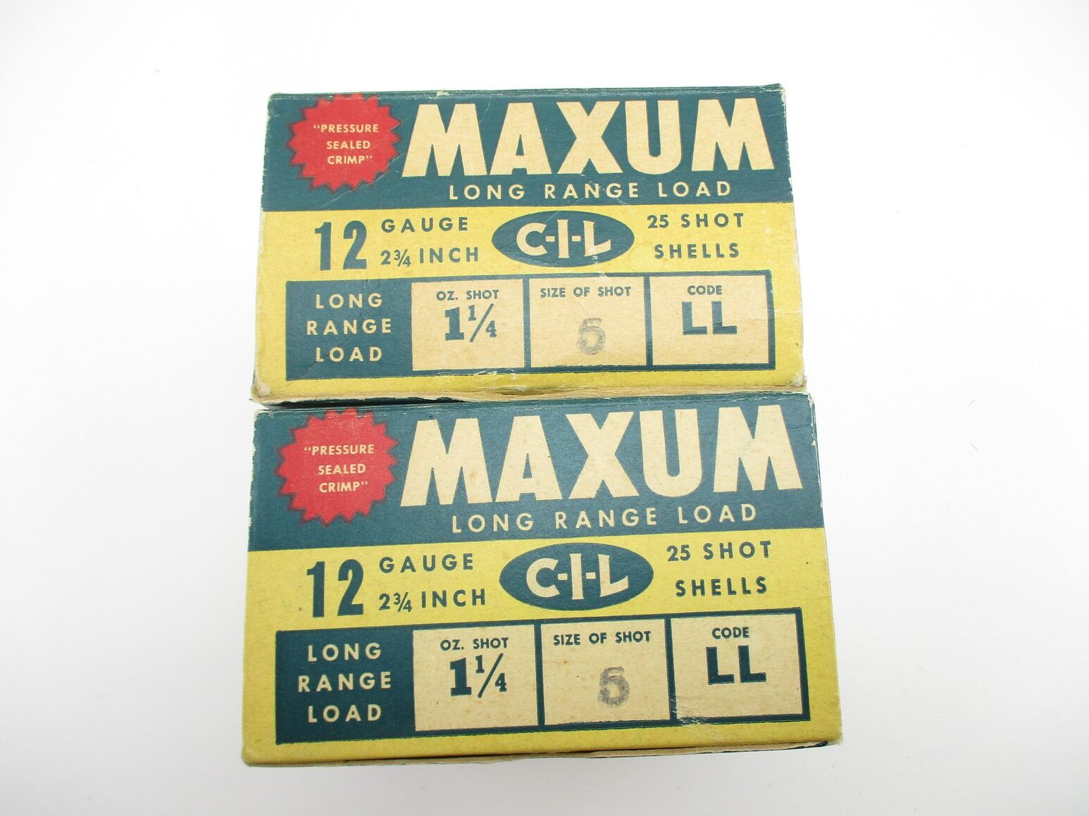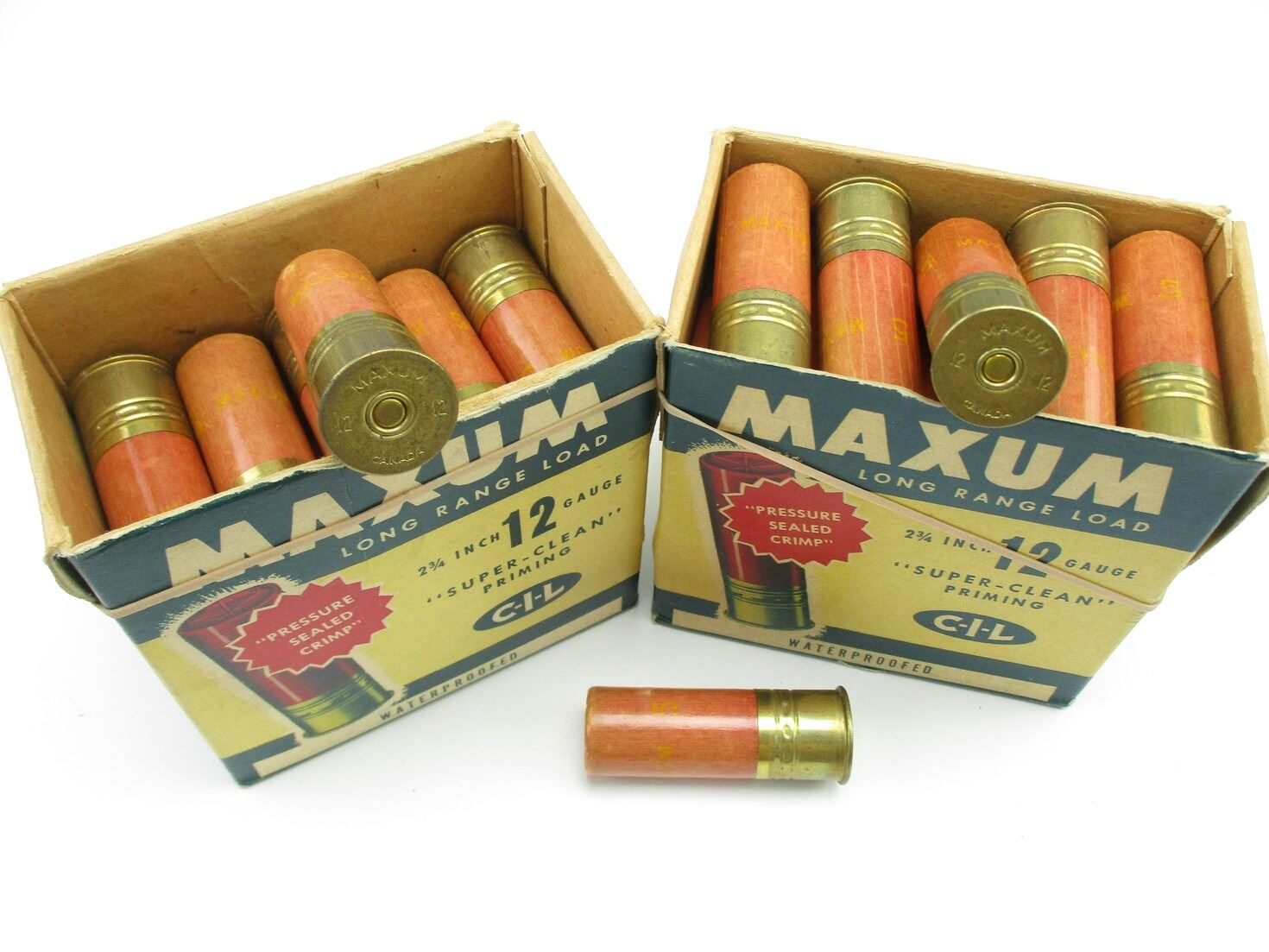 COLLECTIBLE CIL MAXUM 12 GAUGE SHOTSHELLS LOT, 47 RNDS, 2 3/4", #5 SHOT, IN COLLECTIBLE AMMO BOXES, LOT INCLUDES (1) EMPTY COLLECTIBLE AMMO BOX, THERE ARE NEW SHIPPING RESTRICTIONS, PLEASE MAKE SURE YOU HAVE READ AND CONFIRMED WE CAN SHIP TO YOU BEFORE BIDDING ON THIS LOT. PLEASE SEE LOT 0 IN THIS SESSION. NO REFUNDS WILL BE ISSUED, OR BIDS RETRACTED