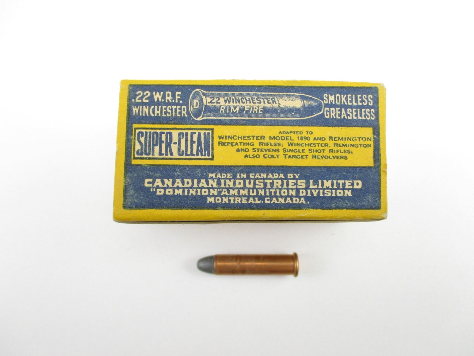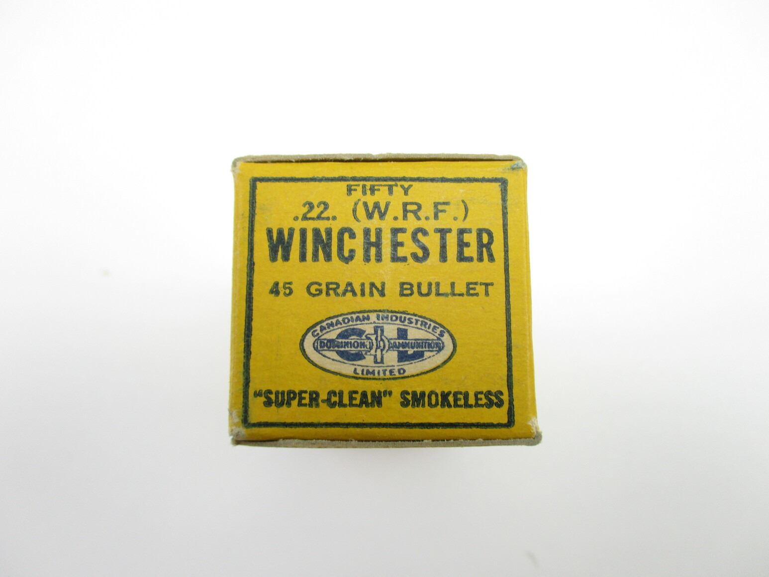 COLLECTIBLE CIL .22 W.R.F. AMMO, 50 RNDS, 45 GRNS (STATED ON BOX, NOT CONFIRMED), IN COLLECTIBLE AMMO BOX, THERE ARE NEW SHIPPING RESTRICTIONS, PLEASE MAKE SURE YOU HAVE READ AND CONFIRMED WE CAN SHIP TO YOU BEFORE BIDDING ON THIS LOT. PLEASE SEE LOT 0 IN THIS SESSION. NO REFUNDS WILL BE ISSUED, OR BIDS RETRACTED