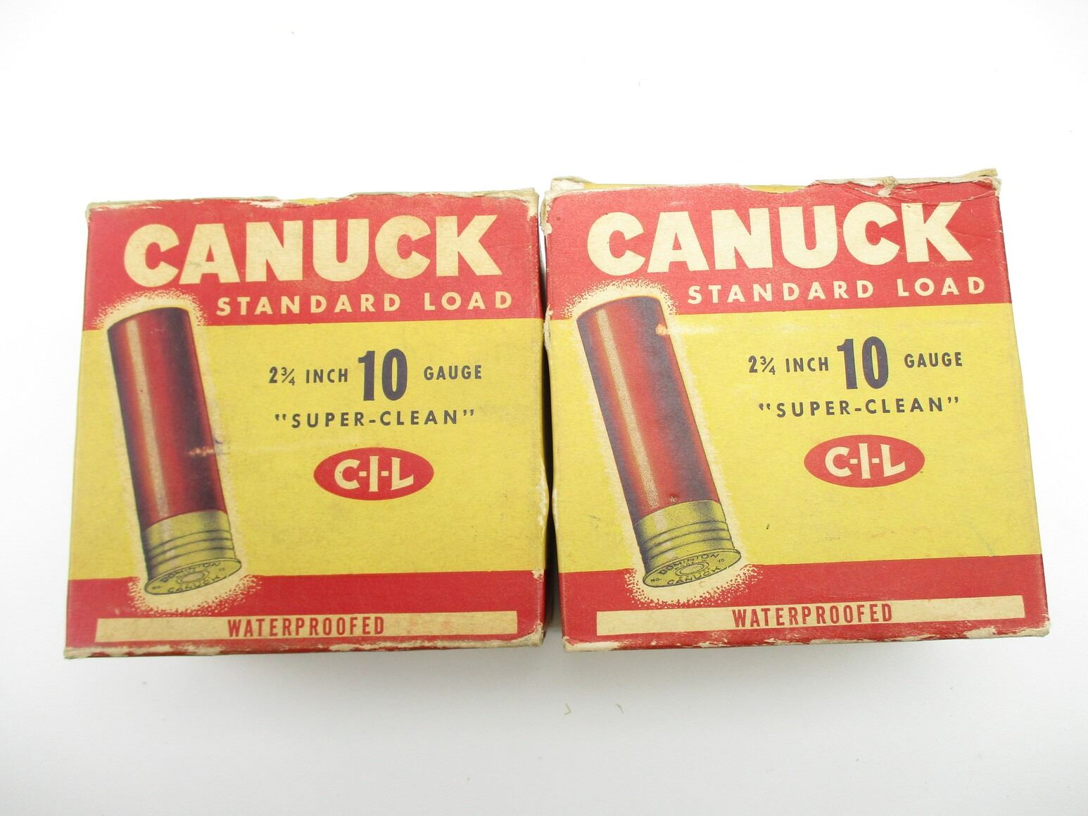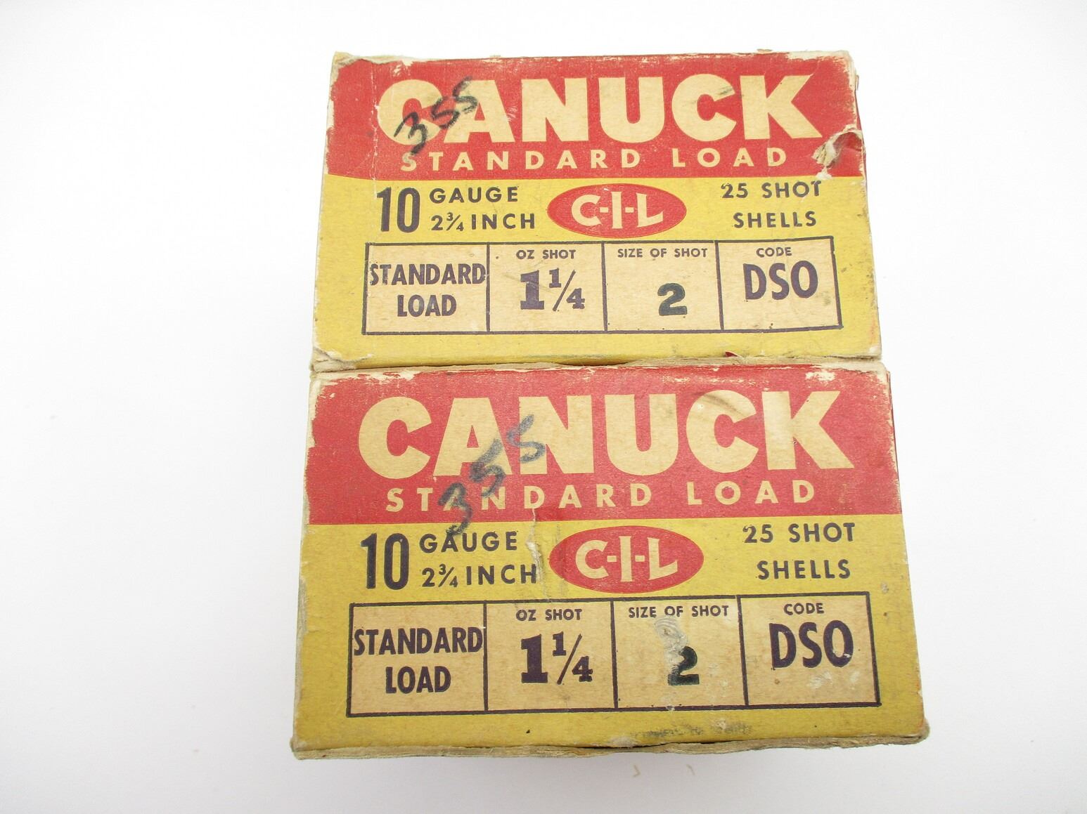 COLLECTIBLE CANUCK STANDARD LOAD 10 GAUGE 2 3/4" SHOT SHELL LOT, 50 RNDS, 2 3/4", #2 SHOT, IN COLLECTIBLE AMMO BOXES, THERE ARE NEW SHIPPING RESTRICTIONS, PLEASE MAKE SURE YOU HAVE READ AND CONFIRMED WE CAN SHIP TO YOU BEFORE BIDDING ON THIS LOT. PLEASE SEE LOT 0 IN THIS SESSION. NO REFUNDS WILL BE ISSUED, OR BIDS RETRACTED