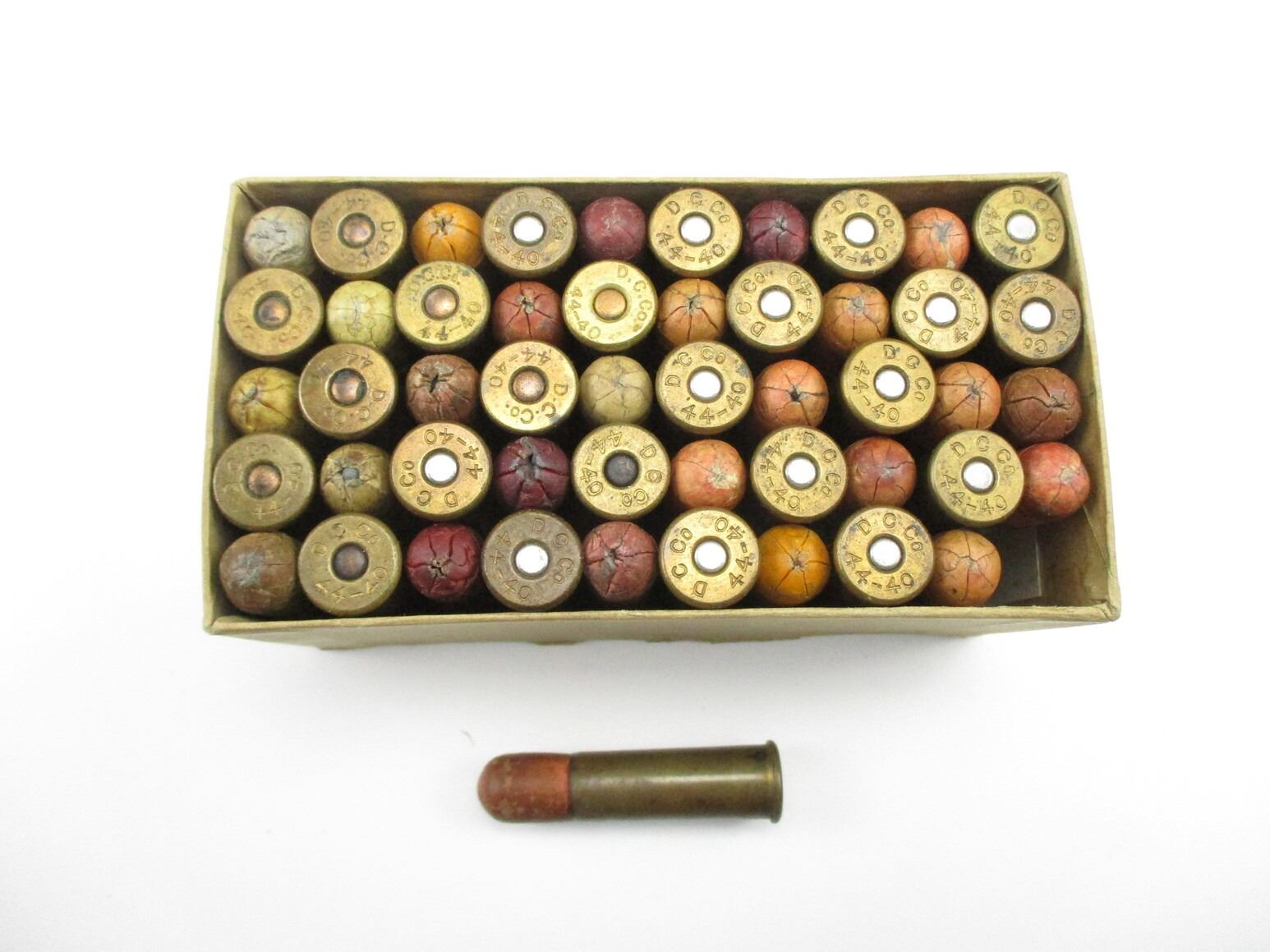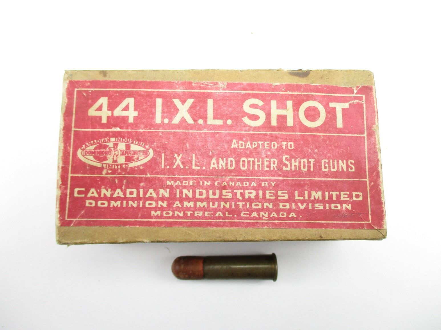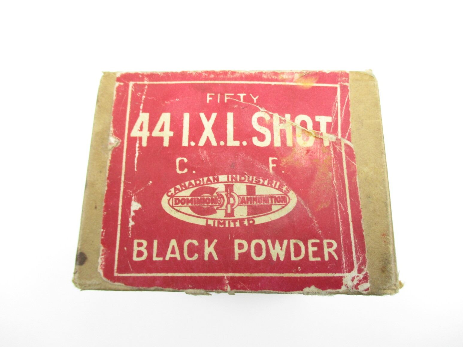 COLLECTIBLE CIL .44 I.X.L. SHOT AMMO, 50 RNDS, BLACK POWDER, IN WORN COLLECTIBLE AMMO BOX, THERE ARE NEW SHIPPING RESTRICTIONS, PLEASE MAKE SURE YOU HAVE READ AND CONFIRMED WE CAN SHIP TO YOU BEFORE BIDDING ON THIS LOT. PLEASE SEE LOT 0 IN THIS SESSION. NO REFUNDS WILL BE ISSUED, OR BIDS RETRACTED