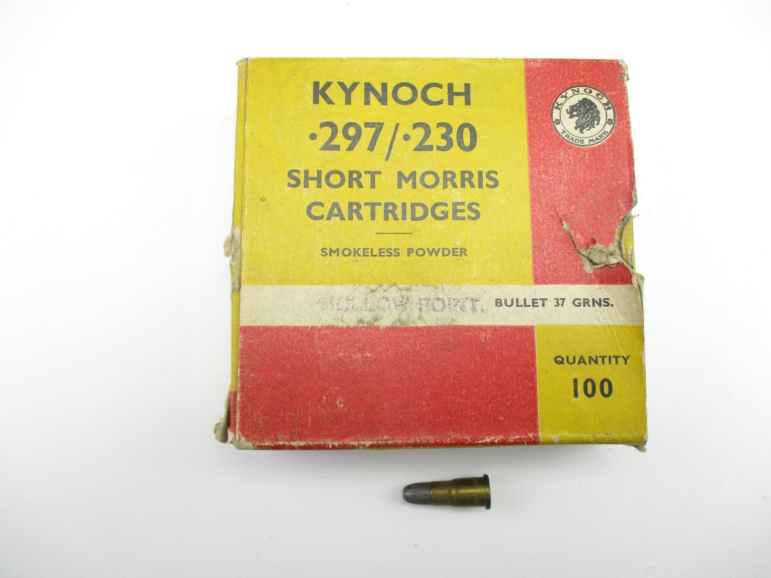 COLLECTIBLE KYNOCH .297/.230 SHORT MORRIS AMMO, 100 RNDS, 37 GRNS (STATED ON BOX, NOT CONFIRMED), HOLLOW POINT, THERE ARE NEW SHIPPING RESTRICTIONS, PLEASE MAKE SURE YOU HAVE READ AND CONFIRMED WE CAN SHIP TO YOU BEFORE BIDDING ON THIS LOT. PLEASE SEE LOT 0 IN THIS SESSION. NO REFUNDS WILL BE ISSUED, OR BIDS RETRACTED