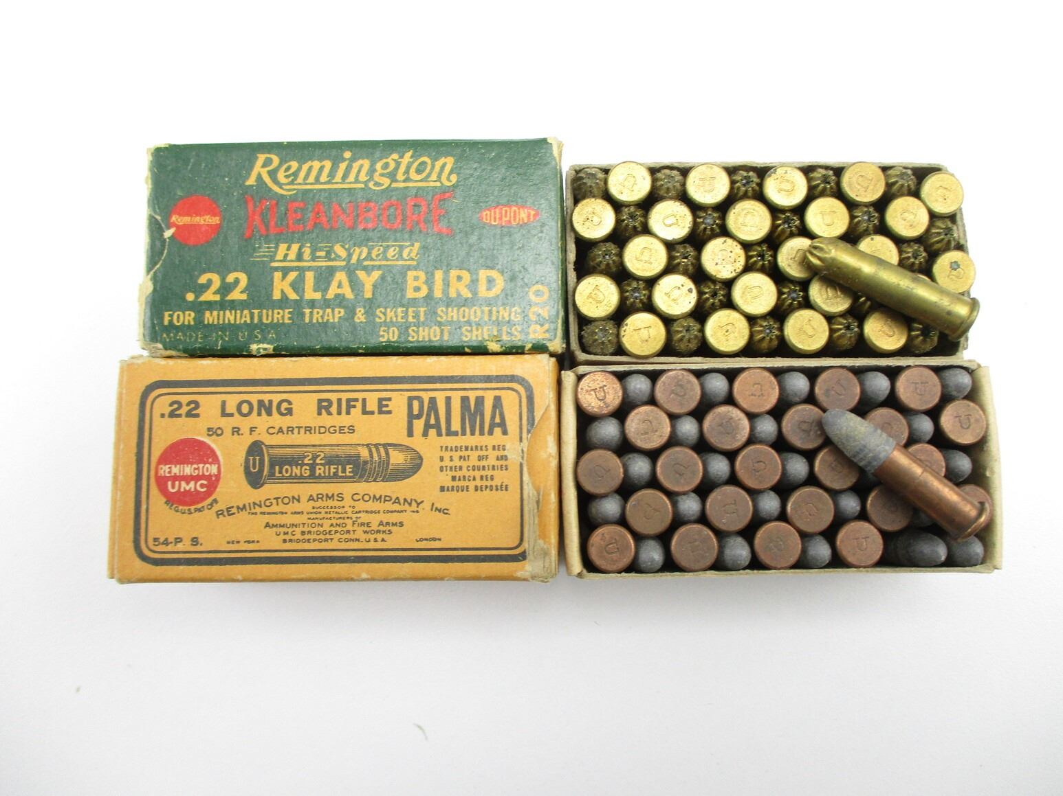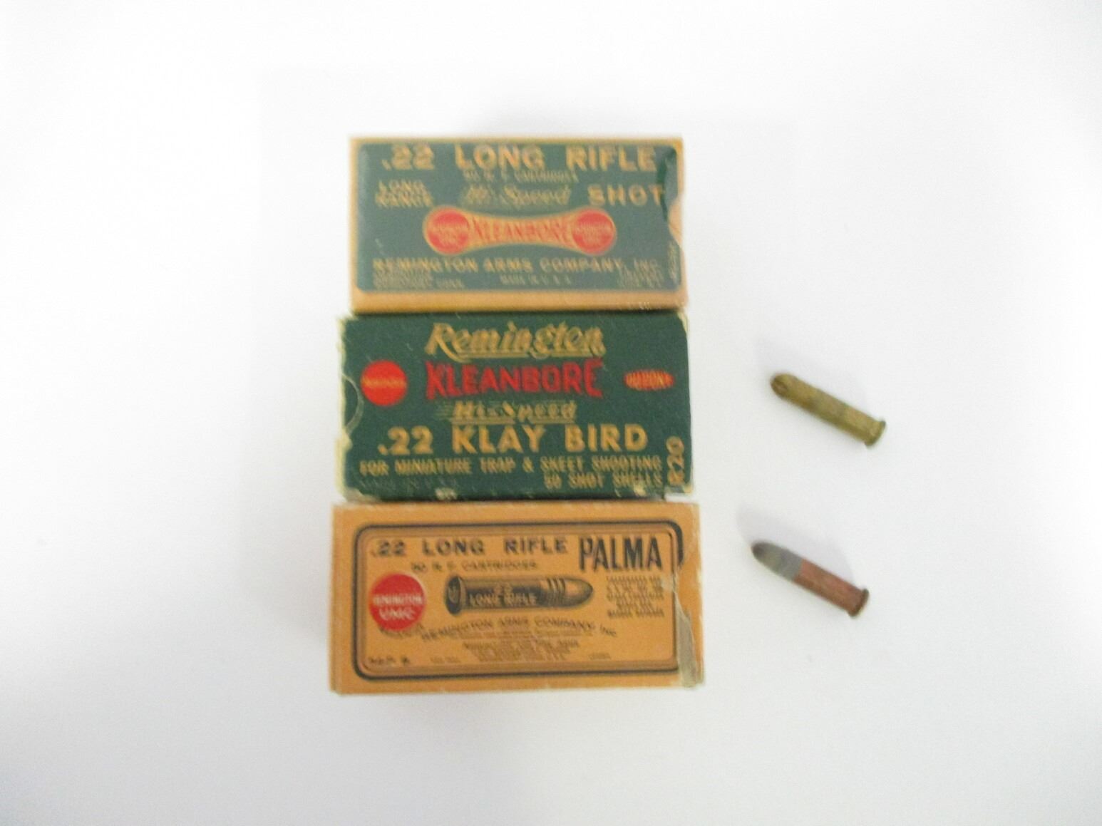 COLLECTIBLE REMINGTON .22 LONG RIFLE AMMO, 150 RNDS, VARIOUS TYPES INCLUDING: KLAY BIRD, PALMA, & HI SPEED SHOT, ALL IN COLLECTIBLE AMMO BOXES, THERE ARE NEW SHIPPING RESTRICTIONS, PLEASE MAKE SURE YOU HAVE READ AND CONFIRMED WE CAN SHIP TO YOU BEFORE BIDDING ON THIS LOT. PLEASE SEE LOT 0 IN THIS SESSION. NO REFUNDS WILL BE ISSUED, OR BIDS RETRACTED
