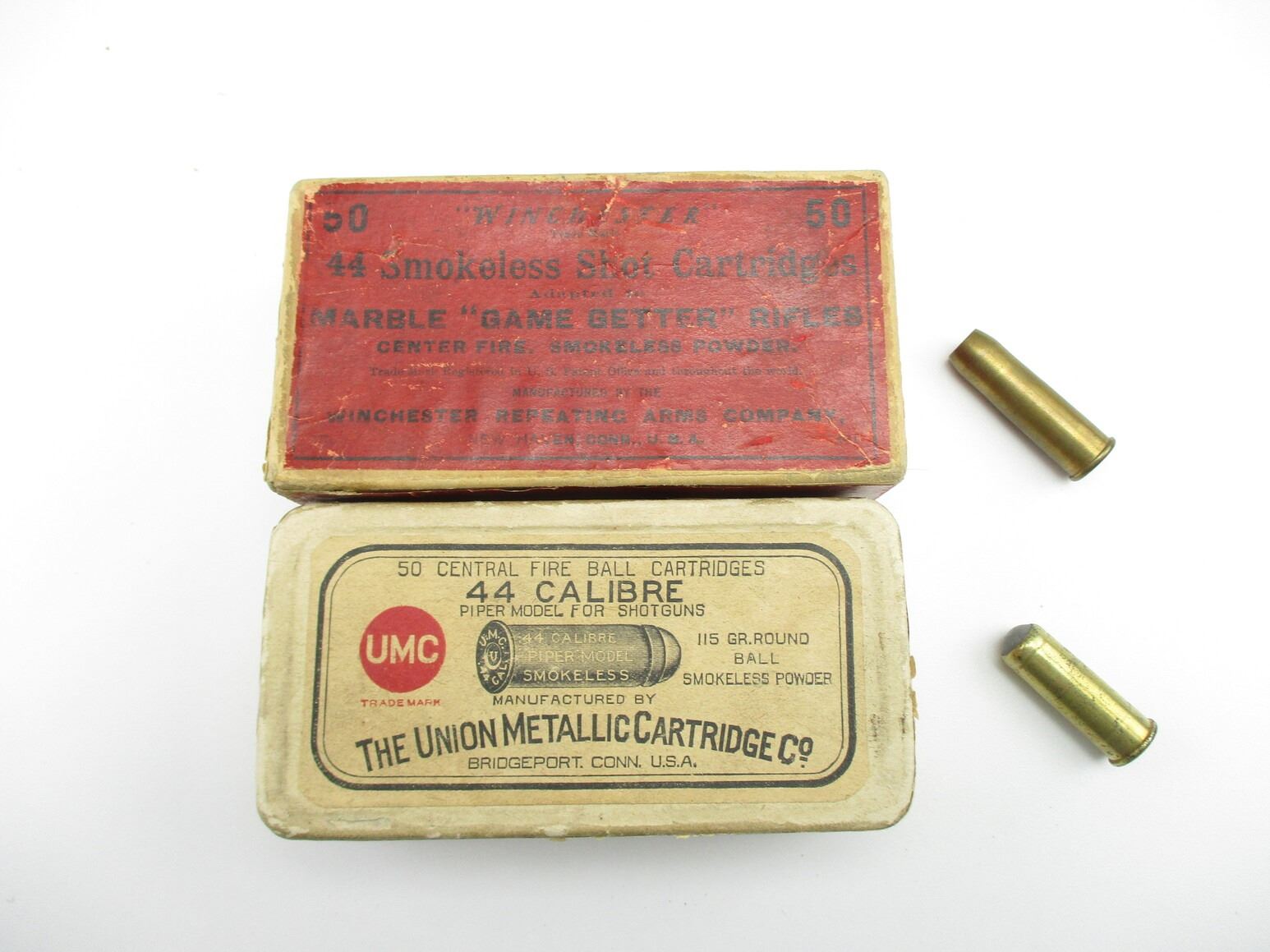 COLLECTIBLE ASSORTED .44 CAL AMMO, 31 RNDS, LOT INCLUDES WINCHESTER .44 SMOKELESS SHOT CARTRIDGES, & U.M.C. .44 PIPER MODEL, ROUND BALL BULLET, IN COLLECTIBLE AMMO BOXES, THERE ARE NEW SHIPPING RESTRICTIONS, PLEASE MAKE SURE YOU HAVE READ AND CONFIRMED WE CAN SHIP TO YOU BEFORE BIDDING ON THIS LOT. PLEASE SEE LOT 0 IN THIS SESSION. NO REFUNDS WILL BE ISSUED, OR BIDS RETRACTED