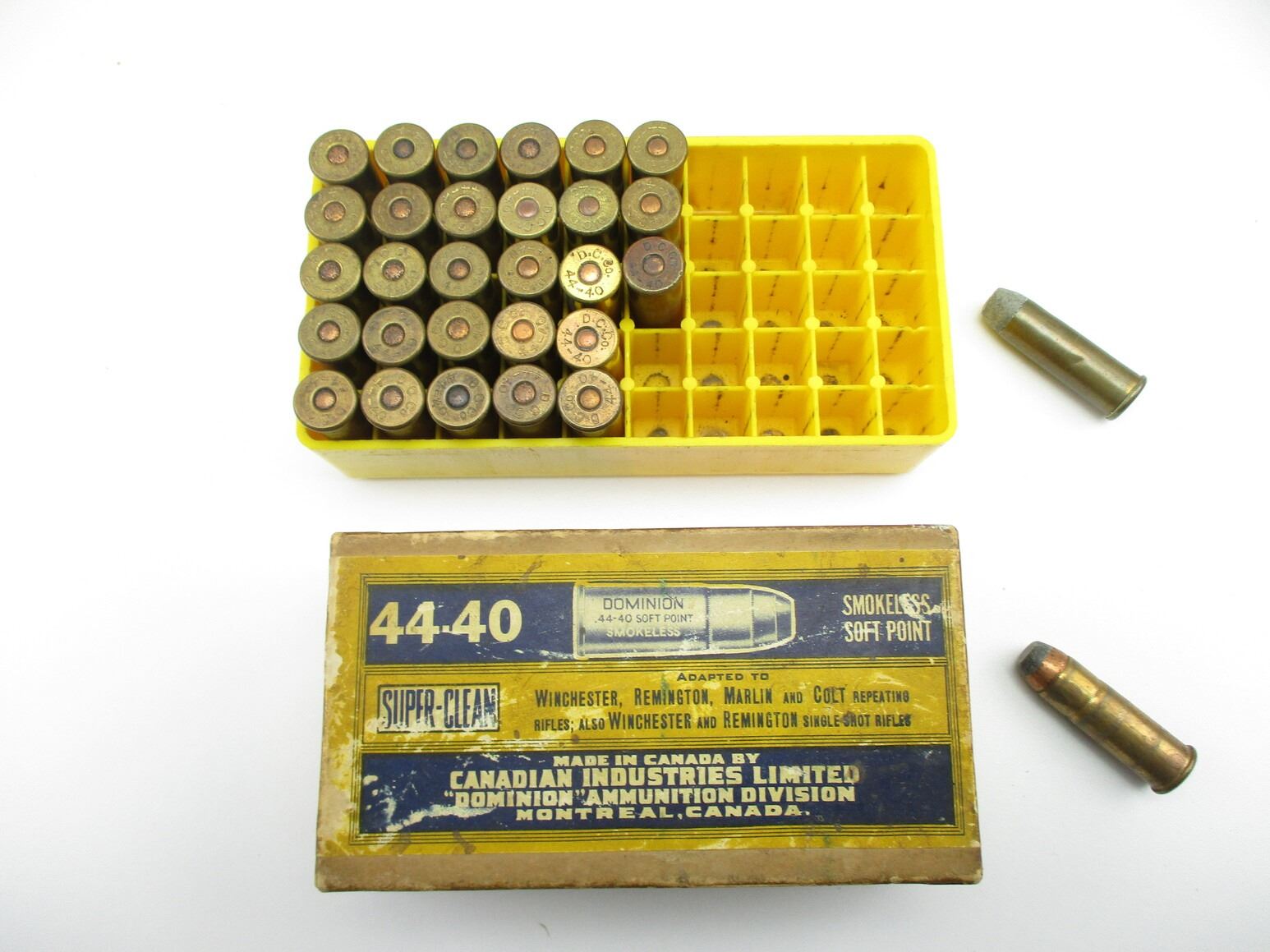 COLLECTIBLE DOMINION ASSORTED .44-40 AMMO, 72 RNDS, MAY INCLUDE OTHER MFG'S, (1) WORN COLLECTIBLE AMMO BOX, THERE ARE NEW SHIPPING RESTRICTIONS, PLEASE MAKE SURE YOU HAVE READ AND CONFIRMED WE CAN SHIP TO YOU BEFORE BIDDING ON THIS LOT. PLEASE SEE LOT 0 IN THIS SESSION. NO REFUNDS WILL BE ISSUED, OR BIDS RETRACTED
