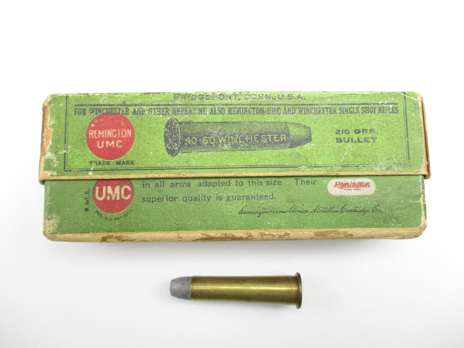 COLLECTIBLE REMINGTON .40-60 WIN AMMO, 20 RNDS, 210 GRNS (STATED ON BOX, NOT CONFIRMED), IN WORN COLLECTIBLE AMMO BOX, THERE ARE NEW SHIPPING RESTRICTIONS, PLEASE MAKE SURE YOU HAVE READ AND CONFIRMED WE CAN SHIP TO YOU BEFORE BIDDING ON THIS LOT. PLEASE SEE LOT 0 IN THIS SESSION. NO REFUNDS WILL BE ISSUED, OR BIDS RETRACTED