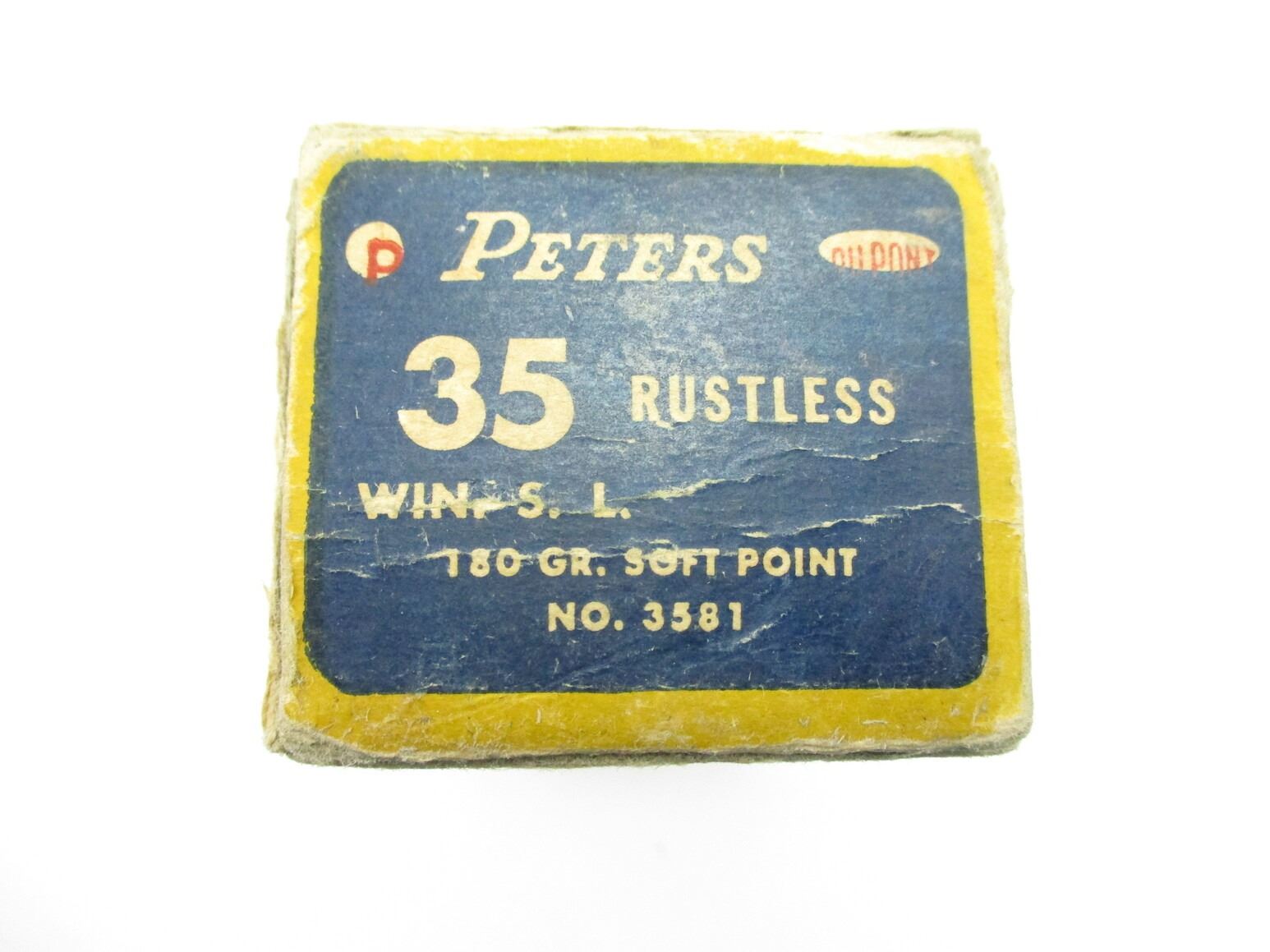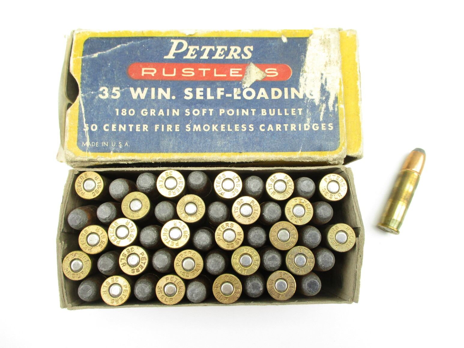 COLLECTIBLE PETER'S .35 WIN AMMO, 50 RNDS, 180 GRNS (STATED ON BOX, NOT CONFIRMED), SOFT POINT, IN DAMAGED COLLECTIBLE AMMO BOX, THERE ARE NEW SHIPPING RESTRICTIONS, PLEASE MAKE SURE YOU HAVE READ AND CONFIRMED WE CAN SHIP TO YOU BEFORE BIDDING ON THIS LOT. PLEASE SEE LOT 0 IN THIS SESSION. NO REFUNDS WILL BE ISSUED, OR BIDS RETRACTED